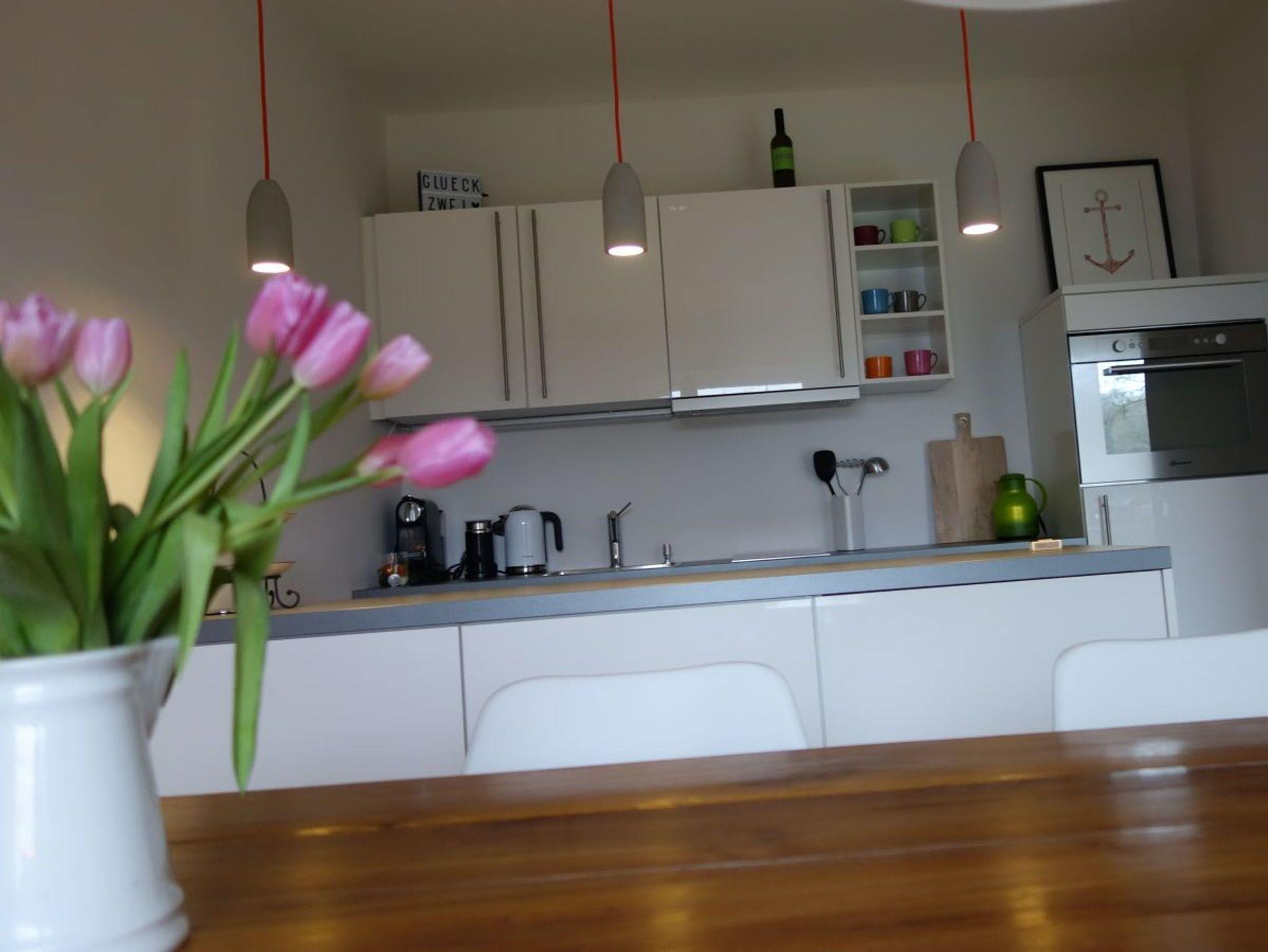In der weißen, modernen Einbauküche finden Sie neben einer Spülmaschine, einen Backofen mit integrierter Mikrowelle, Kaffeemaschine, Toaster, Nespressomaschine mit Milchaufschäumer und alle für den täglichen Bedarf benötigten Küchengeräte.