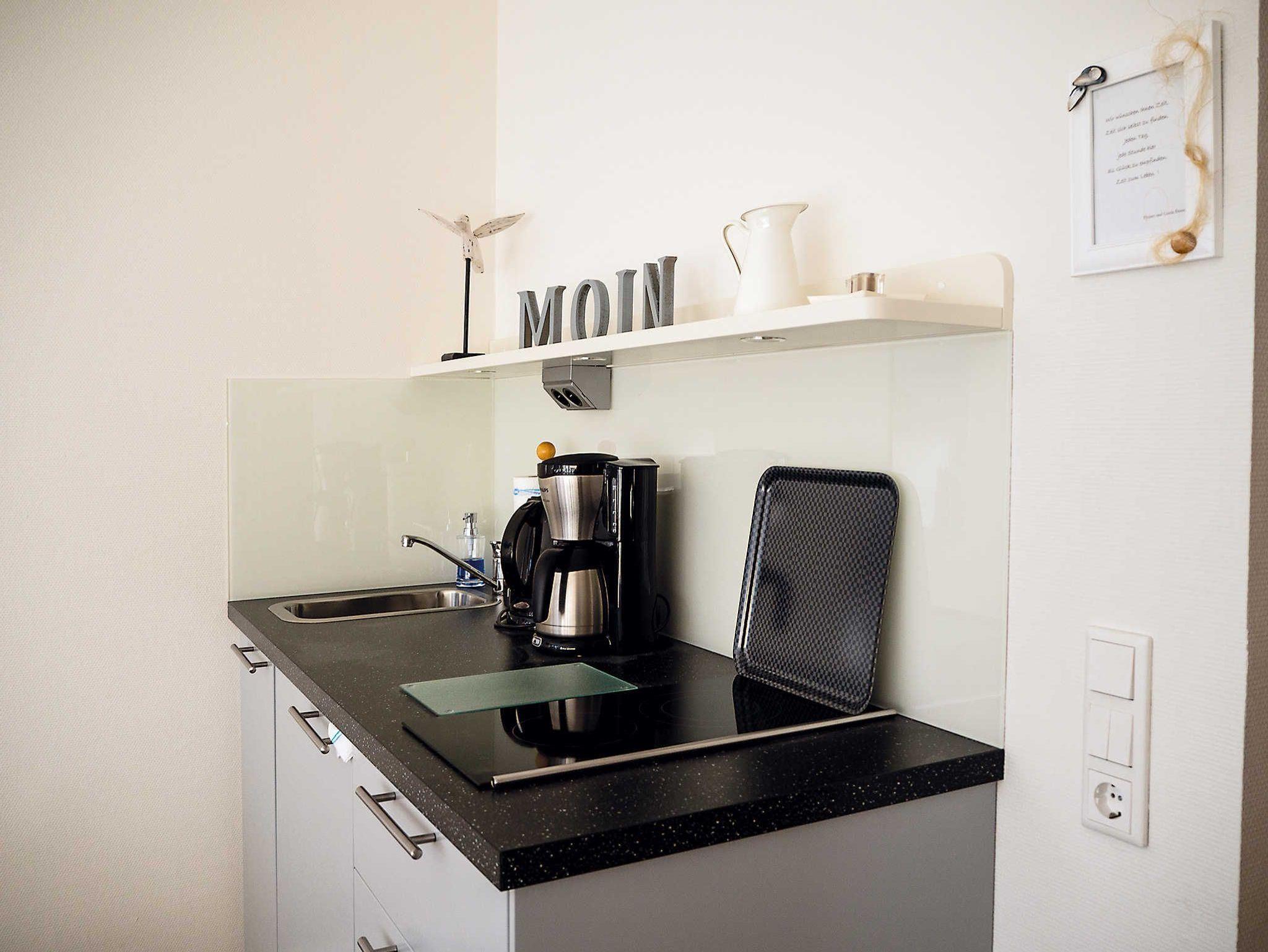 • Küchenzeile mit Kaffeemaschine, Wasserkocher, Eierkocher, Toaster