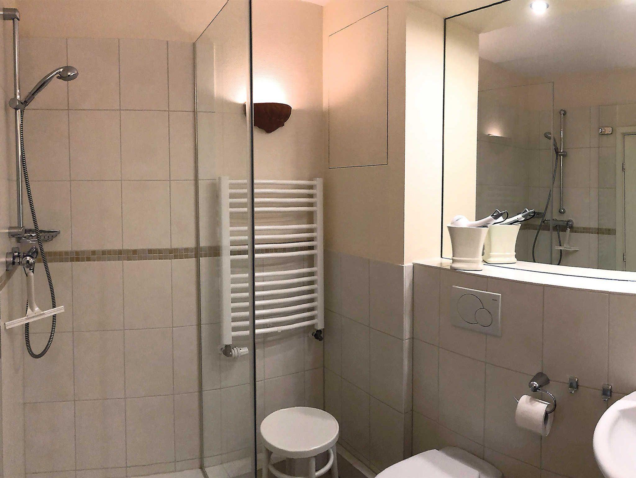 Das moderne Badezimmer ist mit einer großen Dusche ausgestattet und bietet viel Platz.