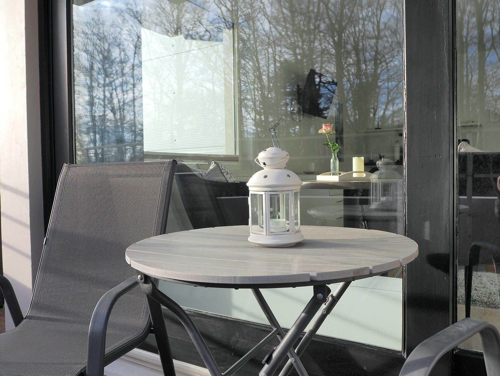 Modernes 33qm Appartement mit Balkon und Strandnähe in Glücksburg bietet ruhige Sonnenlage und grünen Ausblick.