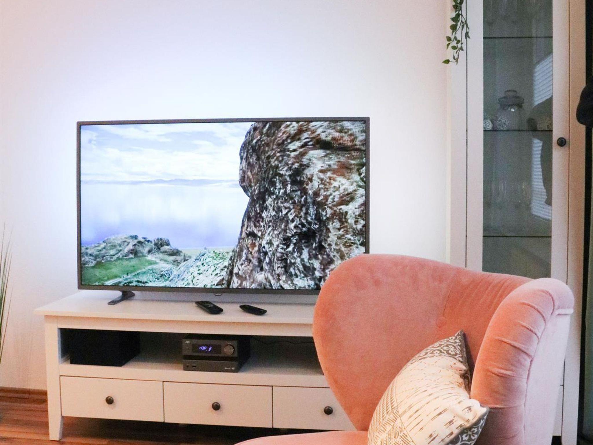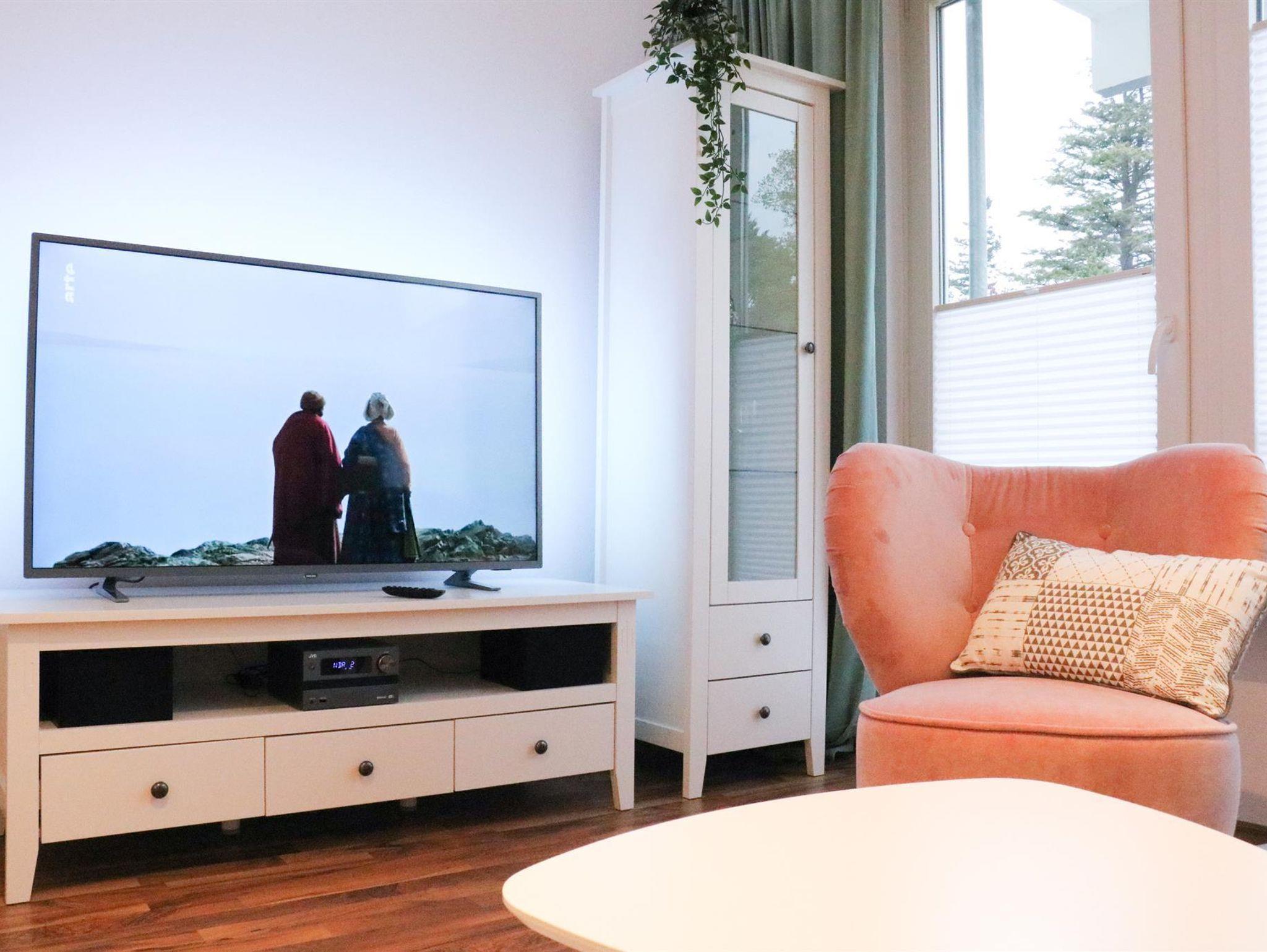 • 1 Wohnzimmer mit Schlafcouch für die 3. Person, 50 Zoll Smart-TV mit NETFLIX Zugang, Essecke