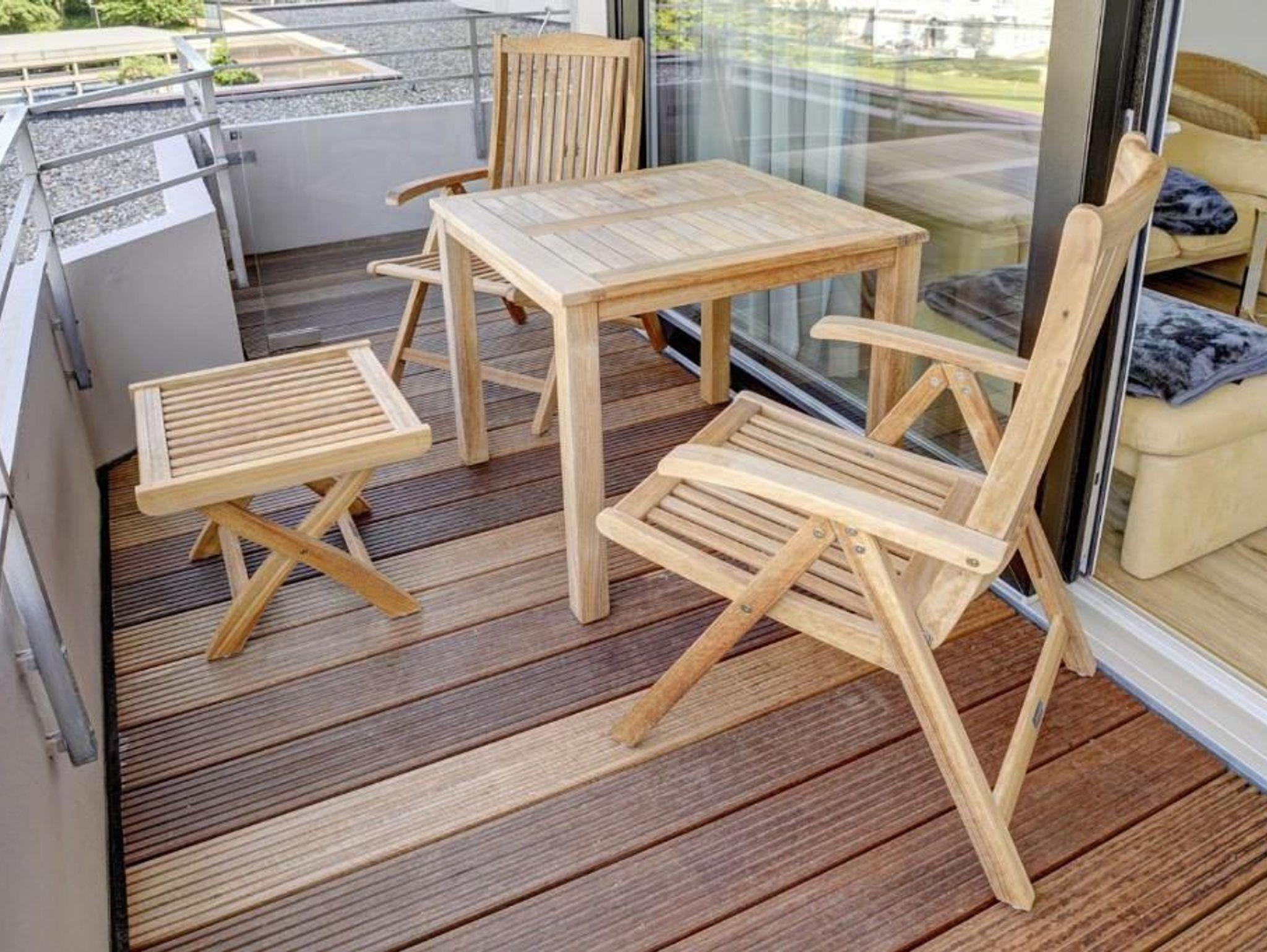 Der überdachte Balkon öffnet sich Richtung Meer und lädt mit seinem außergewöhnlich guten Ausblick zum Erholen und Genießen der frischen Ostseeluft ein.