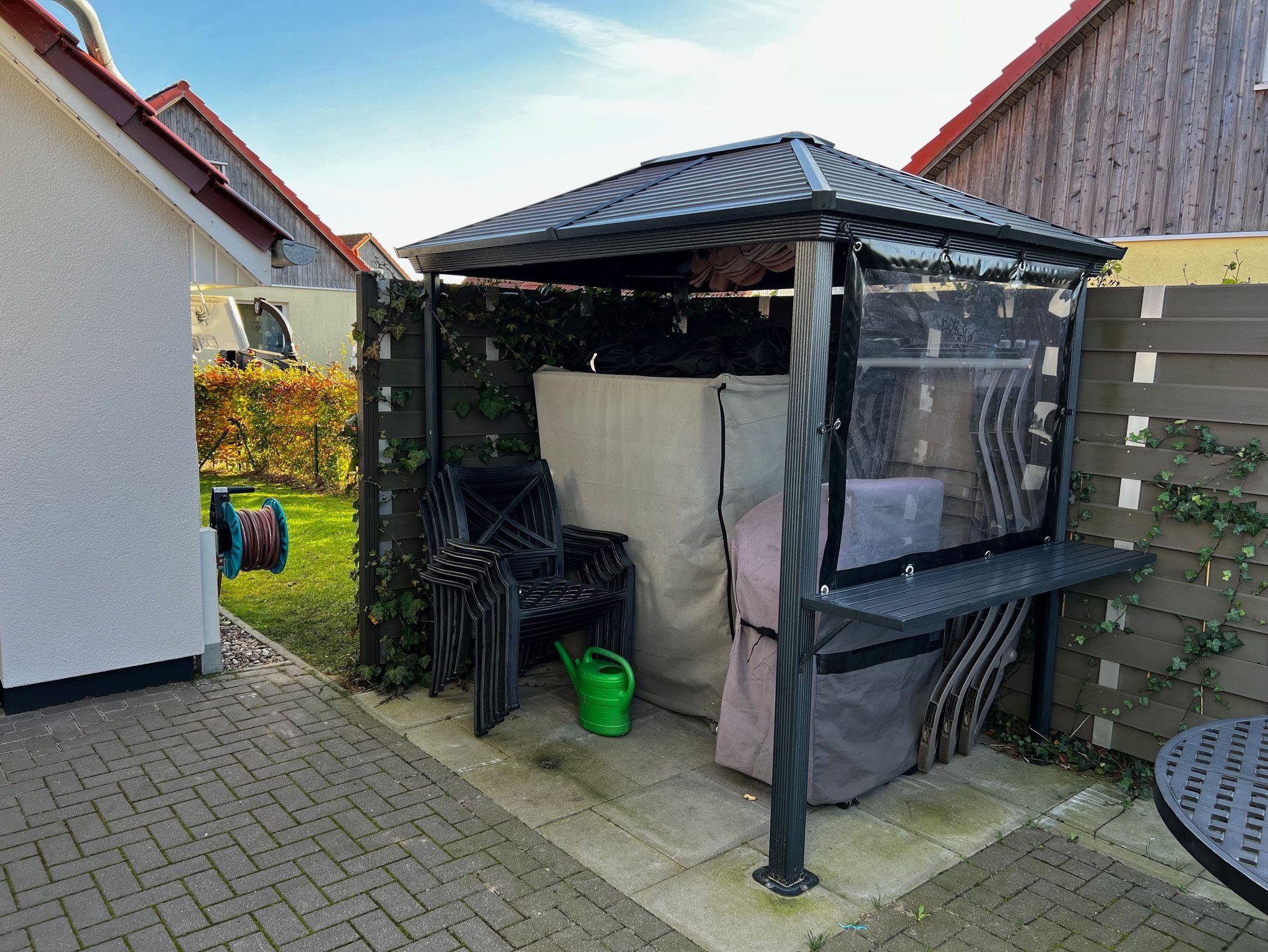Kleiner Napoleon Gasgrill, Sonnenschirme, Strankorb.