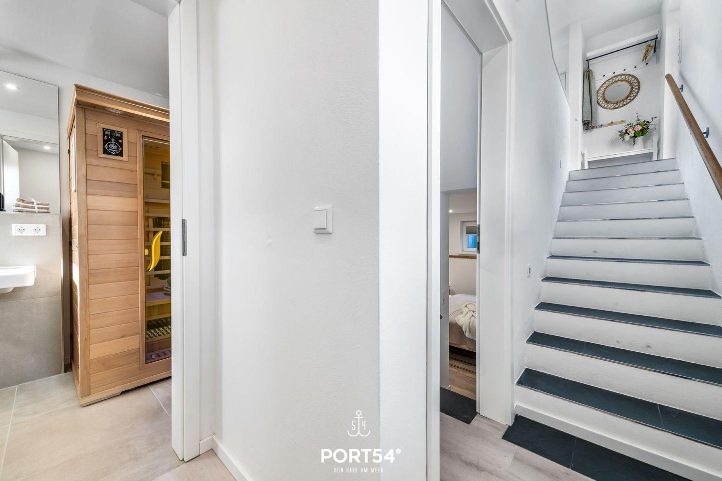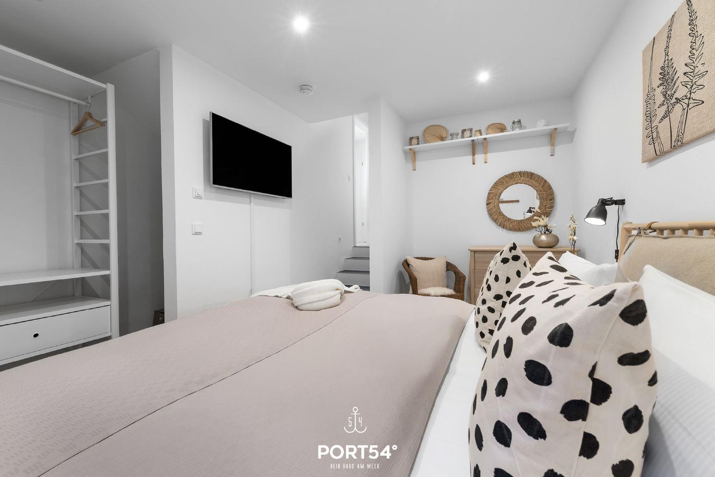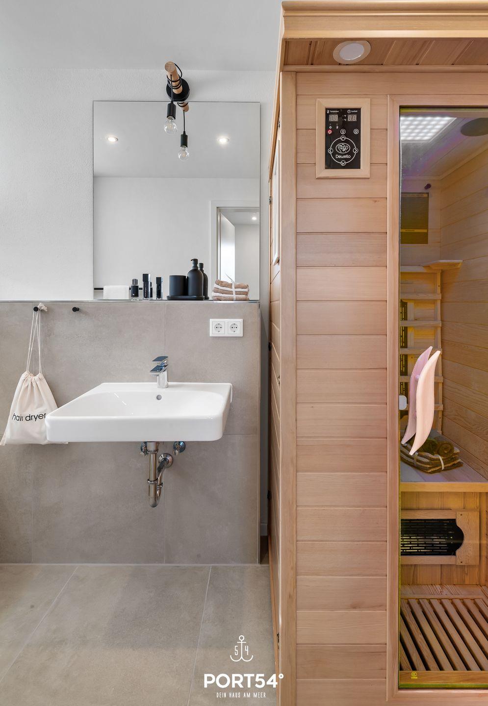 Das Schlafzimmer im Souterrain mit TV bietet Dir in einem Doppelbett (180x200cm) ruhige Nächte für 2 Personen. Ebenfalls im Souterrain befindet sich das Badezimmer, welches Dich mit einer bodengleichen Dusche sowie einer Infrarot-Sauna erwartet. Nach langen Spaziergängen kann hier herrlich entspannt werden!