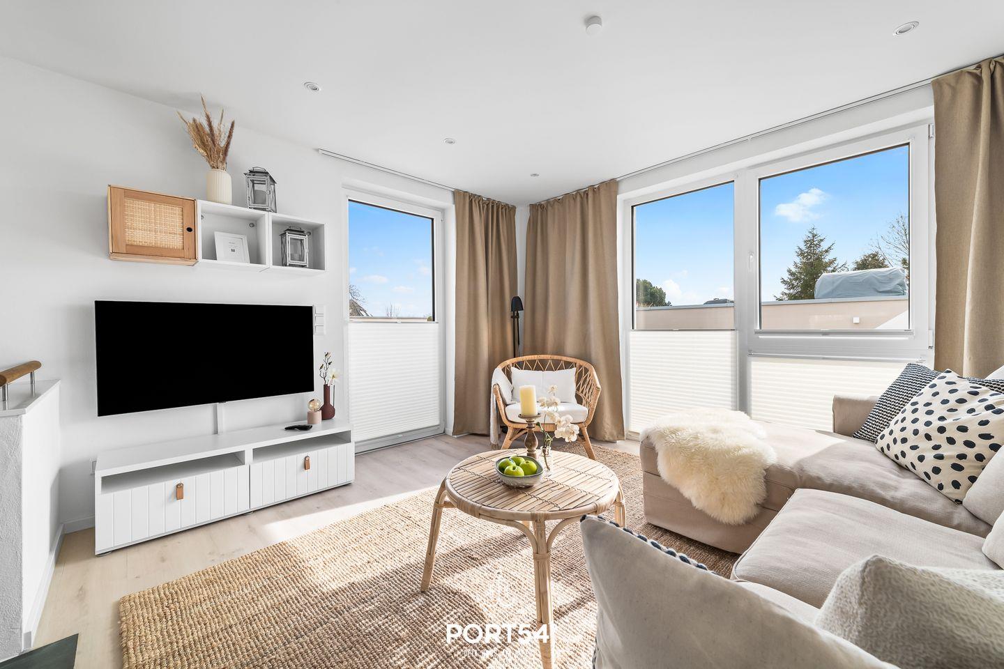 Diese Doppelhaushälfte bietet Dir auf knapp 70 m² Platz für bis zu 4 Personen. Der großzügige Wohn- und Essbereich mit angrenzender voll ausgestatteter Küche wirkt dank der bodentiefen Fenster zu jeder Tageszeit einladend. Das Schlafzimmer bietet Dir ein Doppelbett sowie einen TV. Weitere Schlafmöglichkeiten bietet Dir das Schlafsofa. Das Wellnessbad verfügt über eine ebenerdige Dusche und eine Infrarot-Sauna. Das Highlight ist die Dachterrasse mit traumhaftem Blick auf die Ostsee.