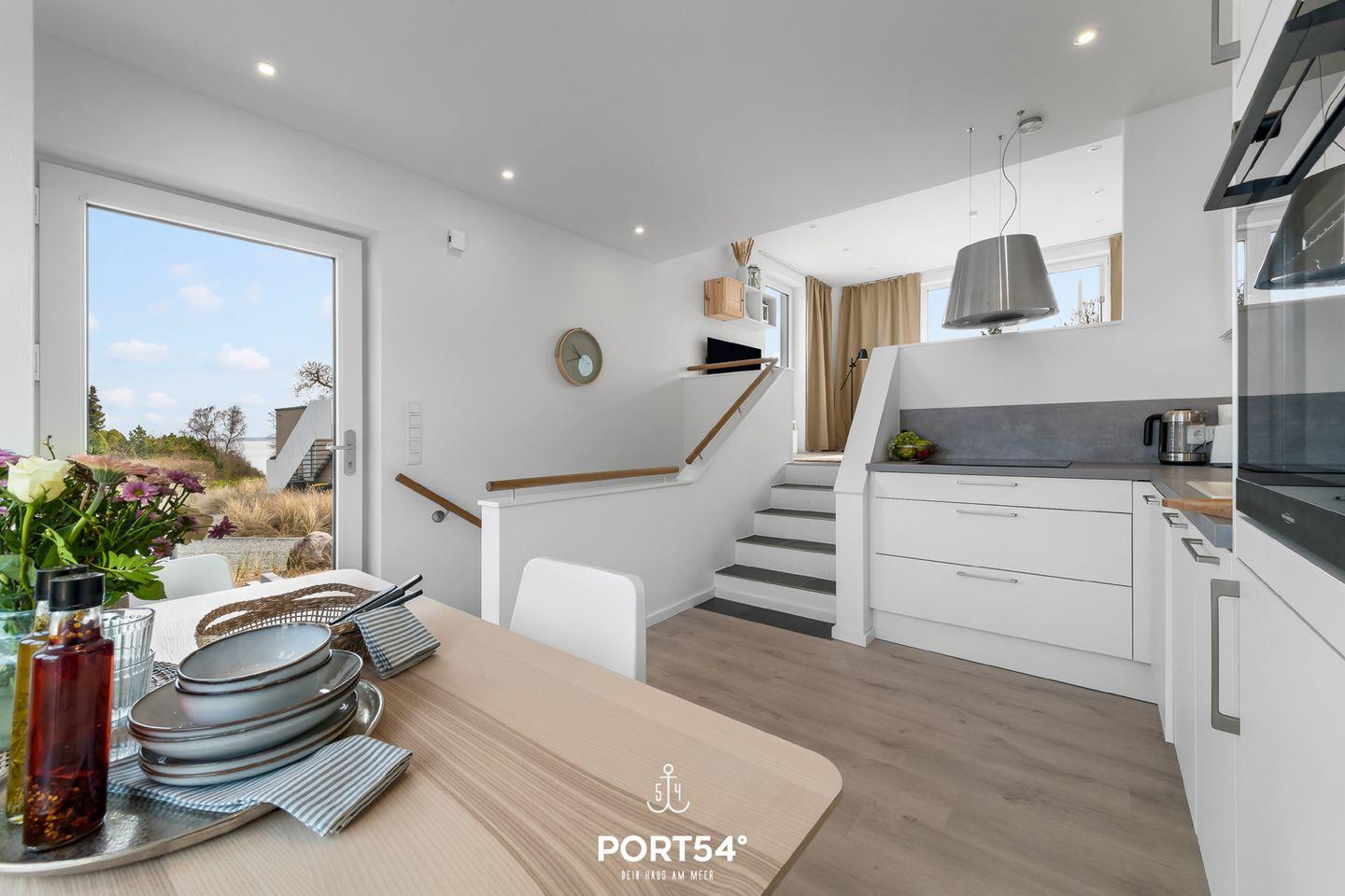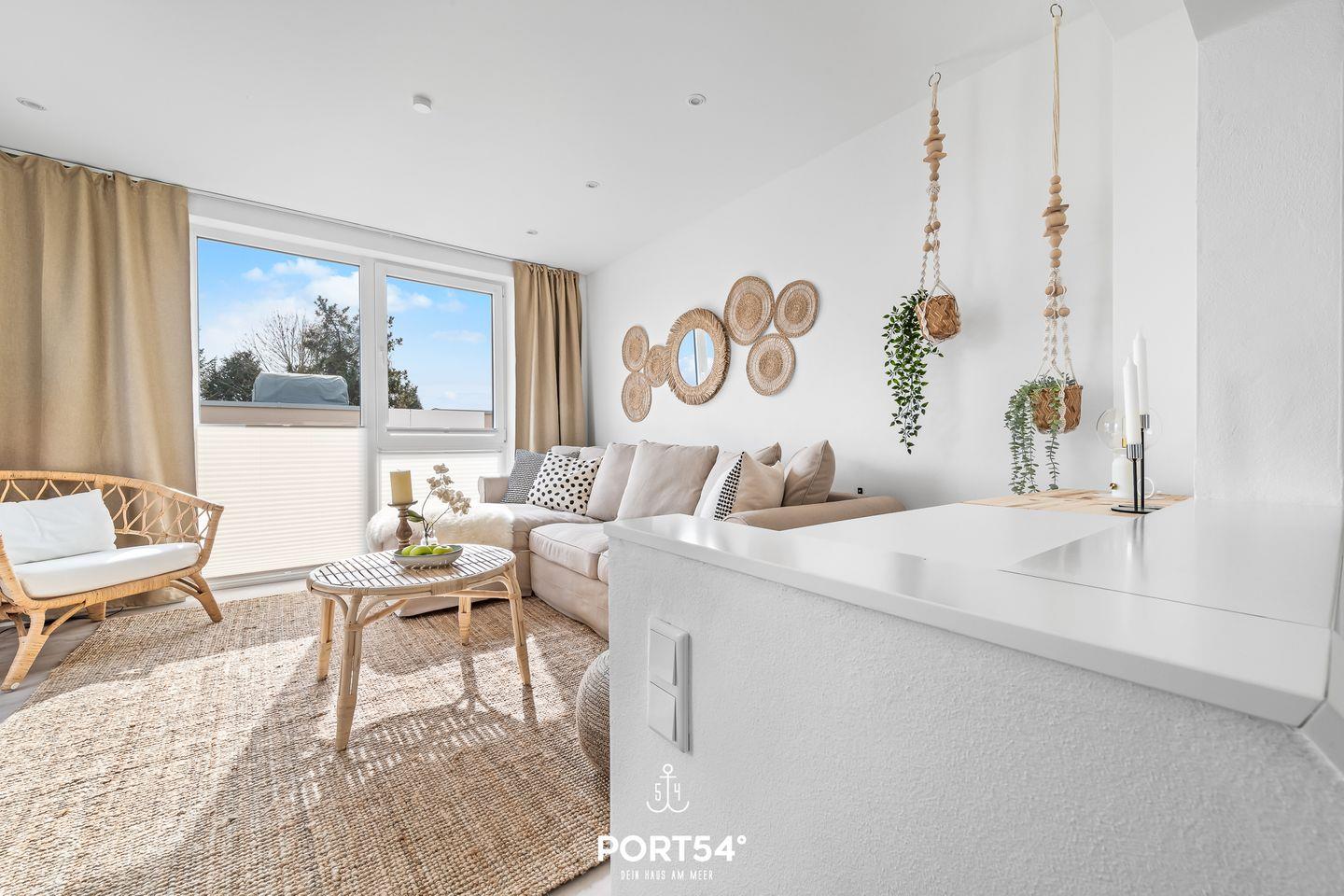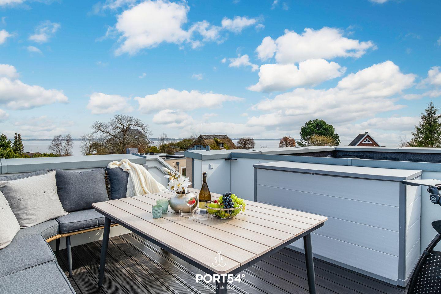 Die Dachterrasse mit Gartenmöbeln bietet Dir einen traumhaften Blick auf die Ostsee. Hier lassen sich sonnige Frühstücke oder laue Sommerabende am Elektro-Grill verbringen. Direkt vor dem Haus befindet sich eine eigene Parkfläche mit Zugang zur E-Ladesäule.