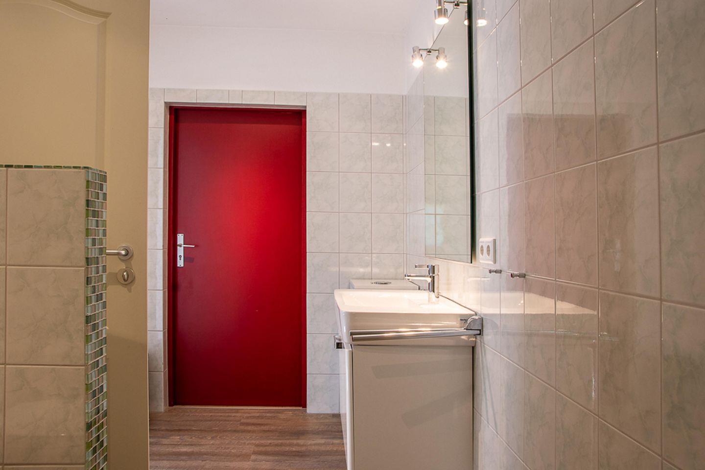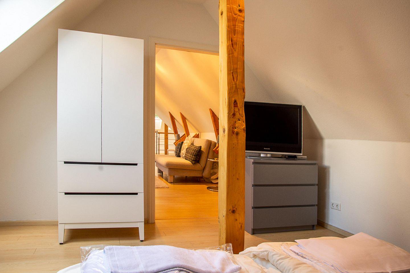 Ebenfalls im ersten Stock befindet sich das Schlafzimmer, das trotz des loftähnlichen Gesamtkonzepts durch eine Tür von der Galerie und dem Wohnbereich getrennt ist und Dir Ruhe sowie Privatsphäre bietet.