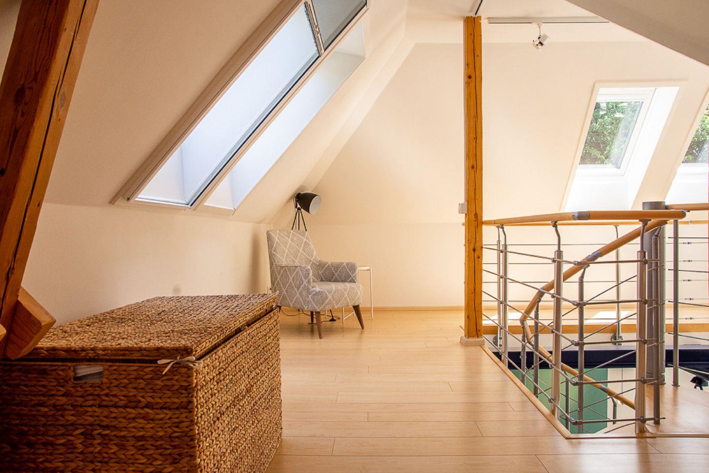 Über eine Wendeltreppe mitten im Wohnbereich erreichst Du den ersten Stock mit einer offenen, lichtdurchfluteten Galerie.