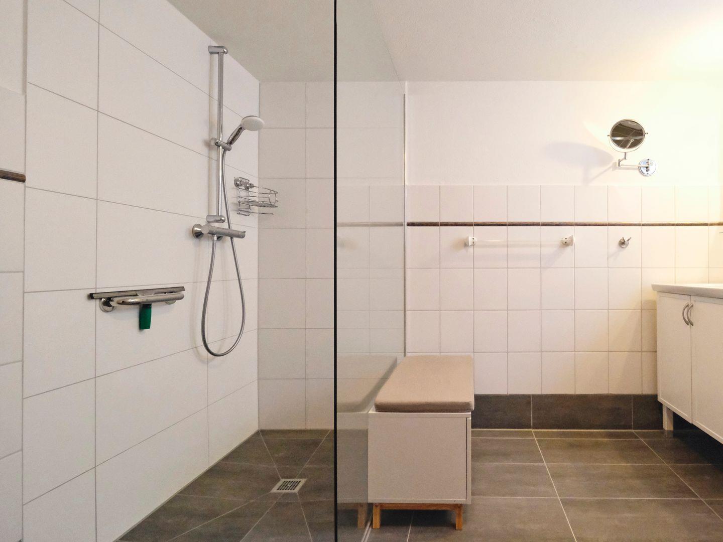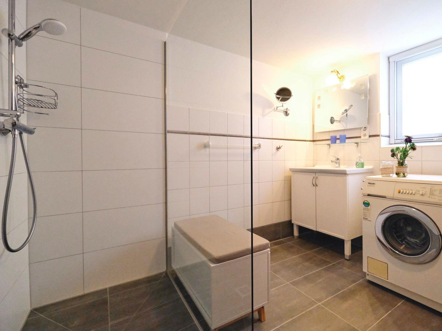 Eine Spülmaschine ist ebenfalls vorhanden. Das Badezimmer ist mit einer ebenerdigen Dusche, einem Spiegel und einem WC ausgestattet.