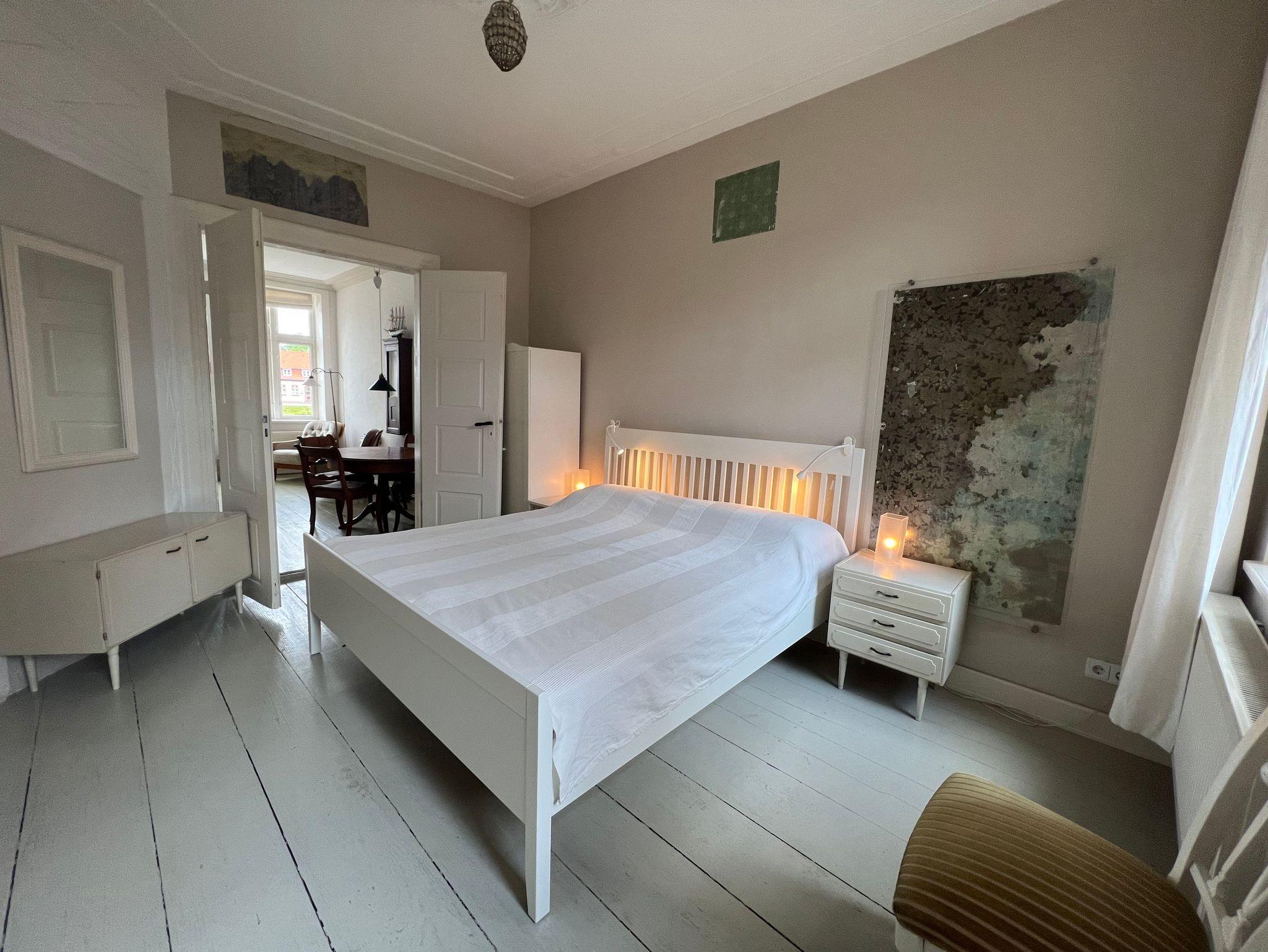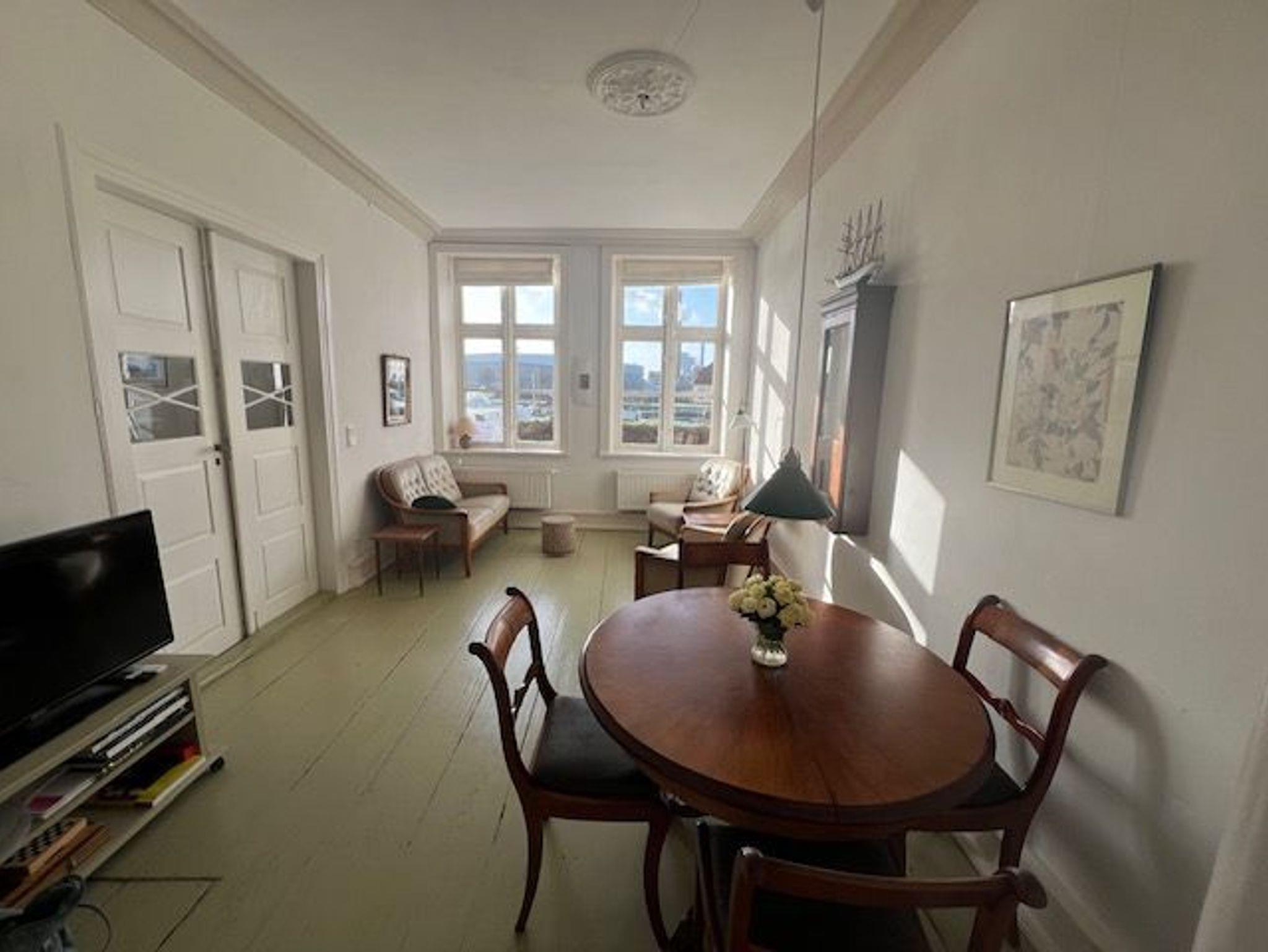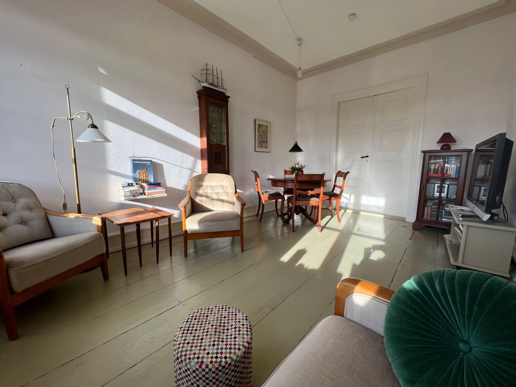 Sie mieten ca. 70 qm im Hochparterre verteilt über Wohn-/Esszimmer, Schlafzimmer, wohnliche Küche, XL-Duschbad und eine grosszügige Diele. Grosse Fenster, alte, doppelflügelige Türen und originale Dielenböden in allen Räumen . Geniessen Sie den malerischen Blick auf Wasser und Segelboote.