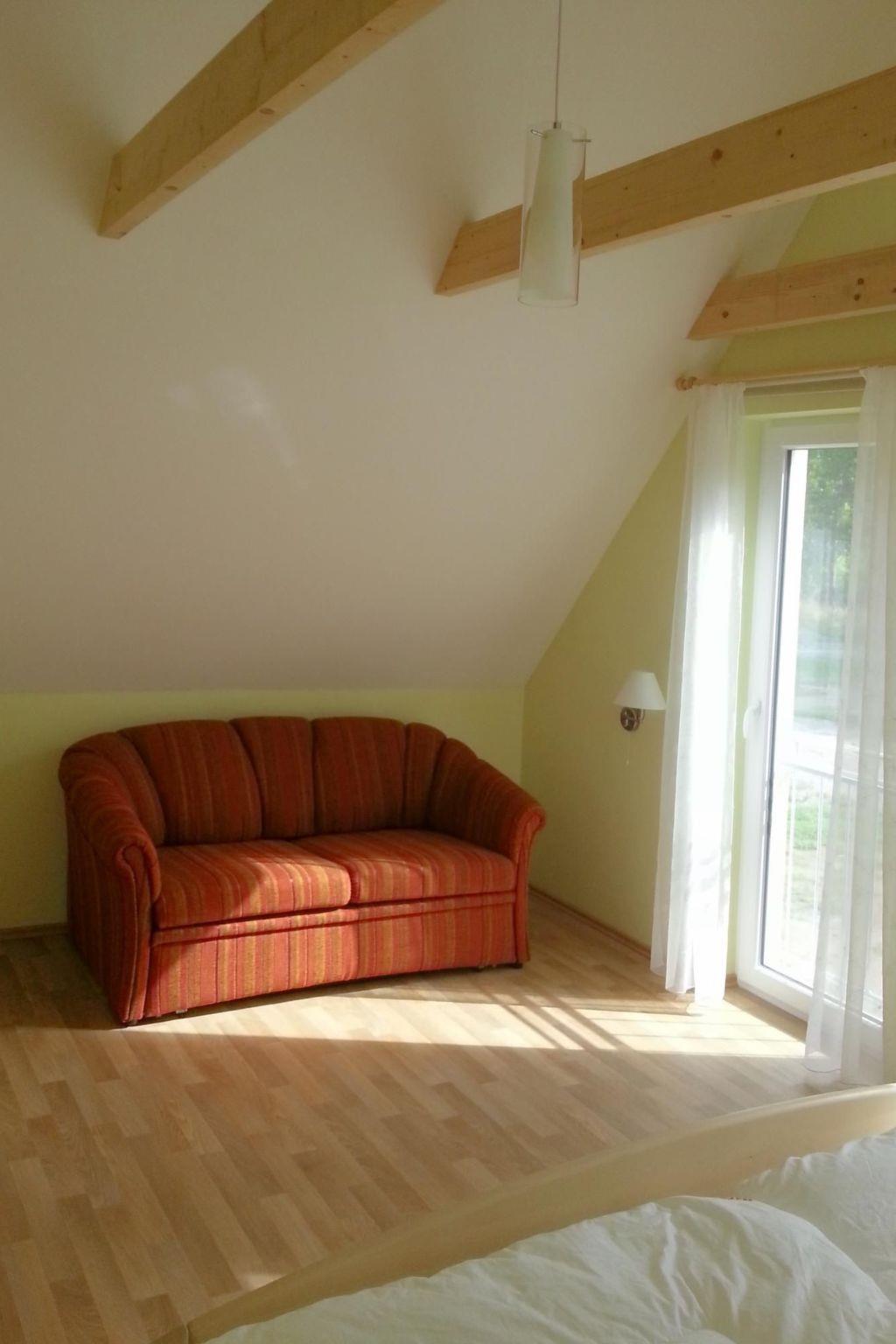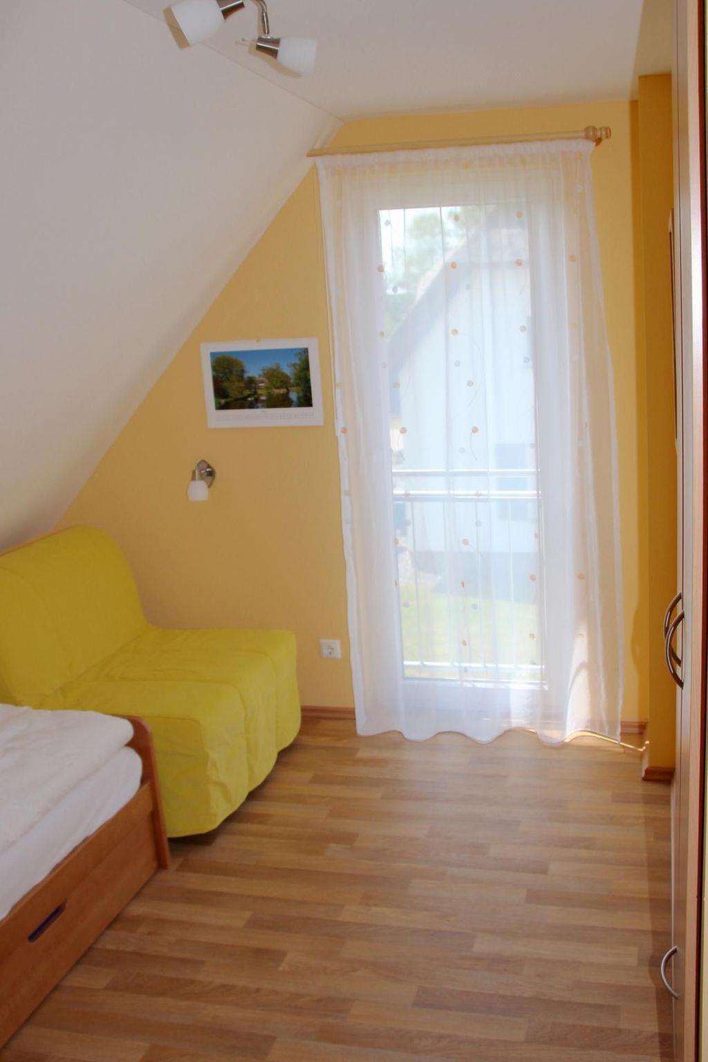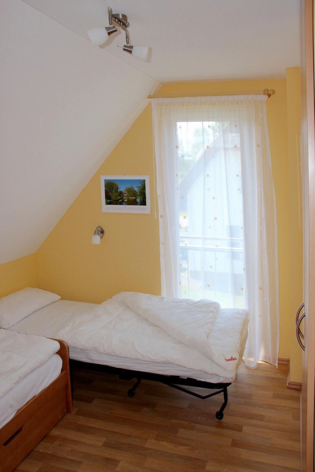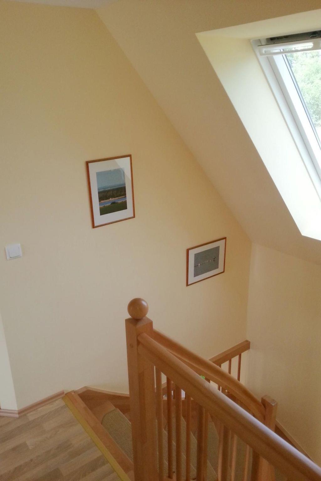 Der überwiegende Teil des Erdgeschosses wird als kombinierter Wohn- und Essbereich genutzt, wobei vier Terrassentüren den unmittelbaren Blick nach Süden und Westen auf die Blütengewächse im Garten freigeben. Sie erreichen hier auch unmittelbar die beiden halbrund gestalteten Terrassen. Im großzügigen Wohnzimmer lädt die gemütliche Sitzgruppe zum Entspannen ein. Hier können Sie sich am Kaminfeuer erfreuen und über die moderne TV- und Stereoanlage fernsehen, gute Musik hören, über den DVD-Player Filme anschauen oder über WLAN im Internet surfen. Zum Speisen und Spielen bietet sich der große Familientisch aus Massivholz an. Kleine Gäste können im Kinderhochstuhl Platz nehmen. Die Bilder an den Wänden sowie verschiedene Bücher über die Insel Rügen regen Sie zu Entdeckungstouren in der unmittelbaren Umgebung an. Für Unterhaltung sorgt auch das E-Piano, auf dem Sie sich entfalten können (bitte bei Buchung angeben). Die offene Küche schließt sich unmittelbar an und ist hochwertig ausgestattet. Dazu gehören der Herd mit Ceran-Kochfeld und Backofen, Geschirrspüler, Einbau-Mikrowelle, Kühlschrank mit separatem Gefrierfach, Kaffeemaschine, Mixer, Toaster und Wasserkocher und viele andere Utensilien. Vor der Spüle lässt ein Fenster die Morgensonne hinein. Im Eingangsbereich in das Ferienhaus befinden sich eine große Garderobe, ein Spiegel und ausreichende Ablagemöglichkeiten sowie ein Einbauschrank für Haushaltsgegenstände. Außerdem erreichen Sie hier das WC. Das Dachgeschoss verfügt über drei Schlafzimmer und zwei Doppelbetten sowie zwei Einzelbetten. Ein Kinderreisebett ist vorhanden. Die bodentiefen Fenster sorgen für viel Licht und Behaglichkeit. Zur Verdunklung sind Rollos vorhanden. Insektenschutzgitter schützen vor Plagegeistern. Die Zimmer sind mit umfangreichem Schrankraum ausgestattet. Das größere Schlafzimmer bietet dank der offenen Balkenlage ein großzügiges Wohngefühl. Hier können Sie sich zurückziehen und es sich auf dem Sofa gemütlich machen. Weiterhin befindet sich im Dachgeschoss ein hochwertig eingerichtetes Bad mit Runddusche, Badewanne, WC und großem Spiegel mit LED-Beleuchtung.