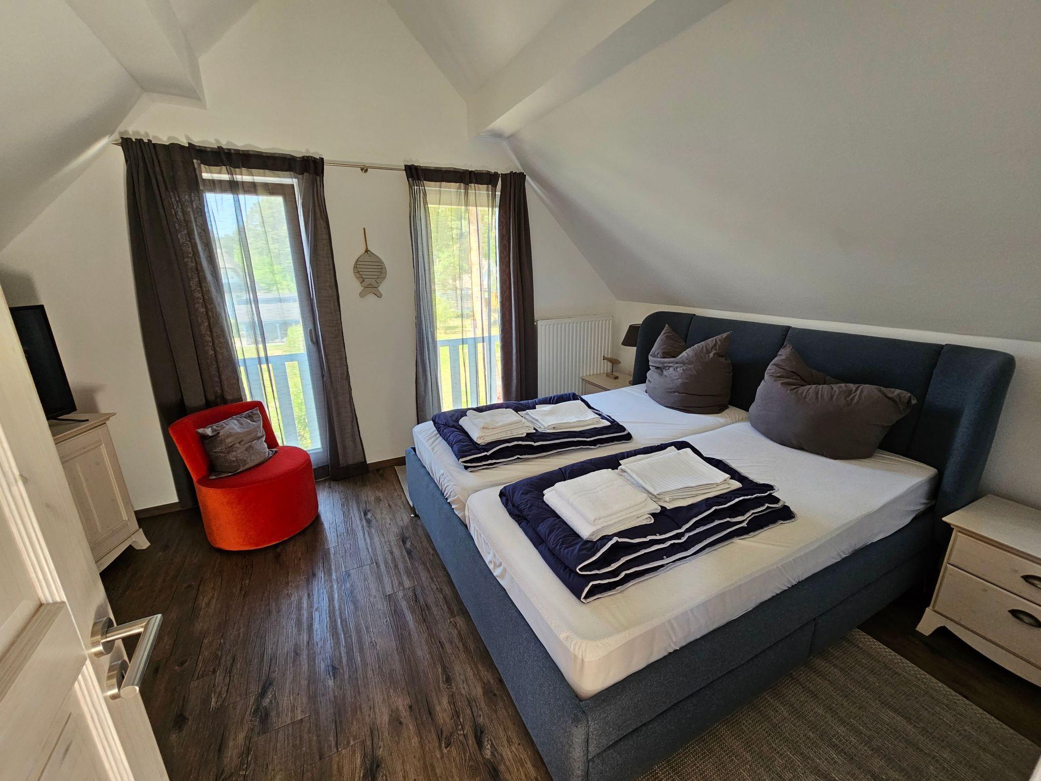 Das Haus hat zwei Etagen und eine Wohnfläche von ungefähr 78 m². Es bietet Platz für vier Erwachsene und ein Kind bis 3 Jahre und ist mit einer Fußbodenheizung und einem Kamin im offenen Wohn- / Essbereich ausgestattet. Im Wohnbereich gibt es eine Couch. Es befindet sich im unteren Bereich die Infrarotsauna, Dusche und WC. Im oberen Bereich gibt es das Bad mit Badewanne und WC sowie die zwei Schlafzimmer. Das eine Schlafzimmer ist mit einem Doppelbett ausgestattet. Im zweiten Schlafzimmer befinden sich zwei Einzelbetten. Das Haus ist komfortabel und modern eingerichtet. Die Räumlichkeiten sind hell, sehr gemütlich gestaltet und laden zum Relaxen ein.