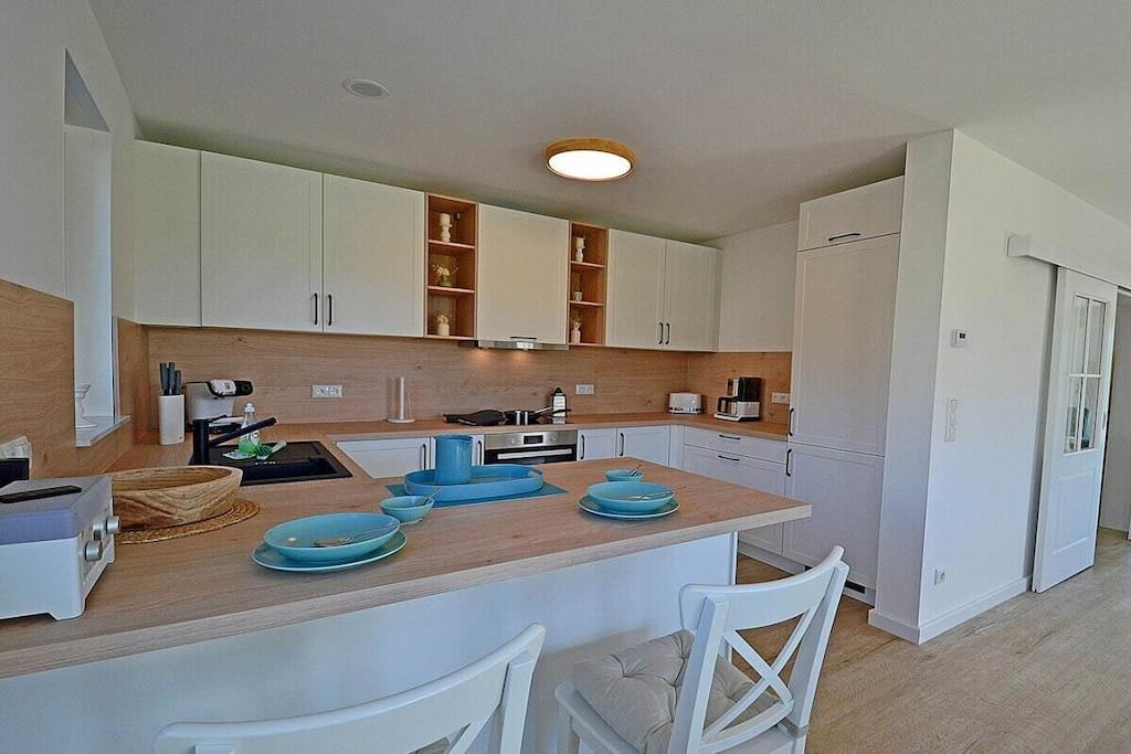 Erdgeschoss: großzügiger Wohn-, Essbereich mit Fußbodenheizung, elektrische Außenjalousien an allen Fenstern, gemütliche Couchlandschaft, Smart-TV (Home-Entertainment), Hifi-Anlage, Internet (WLAN), Gesellschaftsspiele und Bücher für gemütliche Abende, komplett ausgestattete hochwertige Einbauküche mit 4-Plattenherd (Ceran), Backofen, Kühlschrank mit großem Gefrierfach, Geschirrspüler und diversen Elektrogeräten 1. Badezimmer mit Dusche/WC, Sauna mit direktem Terrassenzugang, separates Gäste-WC Hauswirtschaftsraum mit Waschmaschine und Wäschetrockner, Wäscheständer, Bügelbrett, Bügeleisen, Staubsauger, für die Kleinen gibt es einen Kinderhochstuhl und Kinderbett mit Inlett Obergeschoss: 1. und 2. Schlafzimmer mit je einem Doppelbett (getrennte Matratzen jeweils 90 x 200 cm) Kleiderschrank und Sideboard, 3 und 4. Schlafzimmer mit je zwei Einzelbetten (90 x 200) Kleiderschrank und Sideboard, großes Badezimmer mit Badewanne, Dusche, großer Waschtisch und WC Dachgeschoss: Spaß für Groß und Klein bietet der Gaming Room mit TV, WC mit Waschbecken Außenbereich: großes umzäuntes Grundstück mit ca. 630 m², Terrasse mit gemütlichen Gartenmöbeln (6 Gartenstühle und 3 Liegestühle) und großem Sonnenschirm, Grillmöglichkeit besteht (Grill vorhanden), 3 PKW Stellplätze direkt am Objekt, überdachte verschließbare Fahrradabstellmöglichkeit (Gartenhaus) vorhanden