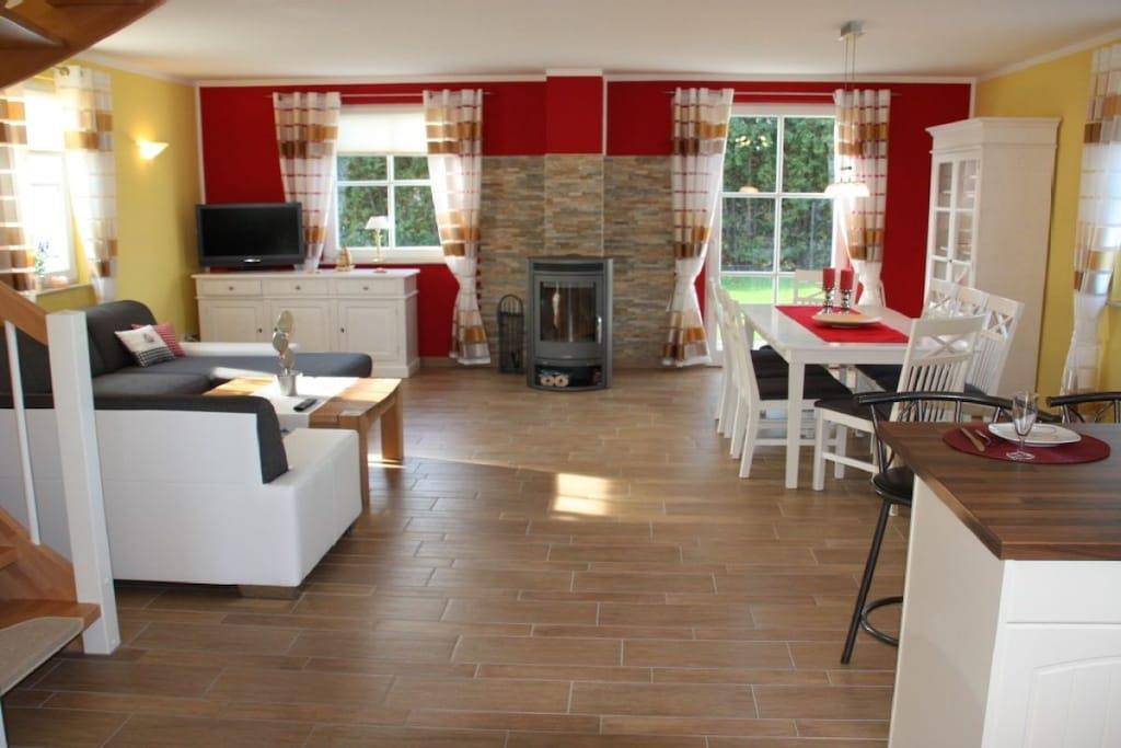 Im Erdgeschoß finden Sie den Wohn-und Essbereich. Wohnzimmer mit großem Sofa, LED-TV und natürlich Kaminofen. Esstisch für 6 Personen. Moderne Einbauküche mit Cerankochfeld, Spülmaschine, 2 Kühlschranke mit Gefrierfach, Mikrowelle und vielen erforderlichen Küchengeräten wie z.B. Toaster, Wasserkocher, Kaffeemaschine etc. Badezimmer / Sauna* mit Fenster, Waschbecken, Dusche und WC. In der Sauna finden Sie im Herbst oder Winter nach einem langen Strandspaziergang die nötige Entspannung. Im Obergeschoß finden Sie 2 Schlafzimmer und ein Badezimmer, Eckbadewanne, Dusche, WC mit einer sehr schönen Fenstergaube. Die Schlafzimmer sind je mit einem Doppelbett mit getrennten Matratzen ausgestattet. In einem Schlafzimmer befindet sich zusätzliches Einzelbett. In dem anderen Schlafzimmer befindet sich ein Fernseher.