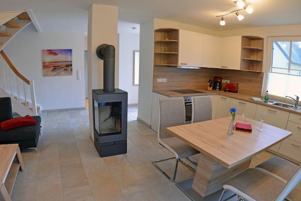 Erholungsort Glowe, Doppelhaus (Haushälfte linke Seite) über 2 Etagen, ruhige Lage direkt am Wald mit sonniger Südwest-Terrasse, ca. 500m zum Sandstrand (Ostsee), ca. 1 km zum Bodden Erdgeschoss: großzügiger Wohn- Essbereich mit gemütlicher Couchlandschaft, Kaminofen, TV/ Sat (Flatscreen), Blu-ray/ DVD Player, Internet, Gesellschaftsspiele und DVDs für gemütliche Abende, offene komplett ausgestattete Einbauküche mit 4- Plattenherd (Ceranfeld), Backofen, Kühlschrank mit kleinem Gefrierfach, Geschirrspüler, Mikrowelle und diversen Elektrogeräten, Saunabereich mit ebenerdiger Dusche, separates Gäste- WC, Wirtschaftsraum mit Waschmaschine, Obergeschoss: 1. Schlafzimmer mit Doppelbett (2 Matratzen je 80x200), Sideboard und Schreibtisch, 2. Schlafzimmer mit 2 Einzelbetten (100x200), Kleiderschrank, TV/ Sat (Flatscreen) und Radio/ CD-Player, Bad mit moderner Dusche Außenbereich: Terrasse mit Gartenmöbeln (4 Gartenstühle und 2 Liegestühle), Sonnenschirm, Grill vorhanden Erstvermietung Mai 2017 - "Reetgedecktes Ferienhaus, sehr liebevoll eingerichtet für unvergessliche Urlaubstage" 2 PKW-Stellplätze, Nichtraucher, Internet (WLAN) vorhanden, Wäscheständer, Fußbodenheizung im gesamten Haus, Waschmaschine ohne Gebühr, Insektenschutz im gesamten Haus, Einkaufsmöglichkeiten, Bäcker und Restaurant in unmittelbarer Nähe, optimale Rad- und Wandermöglichkeiten, wohlerzogene Hunde sind herzlich willkommen (Gebühr Euro 5,-/ pro Hund/ pro Nacht)