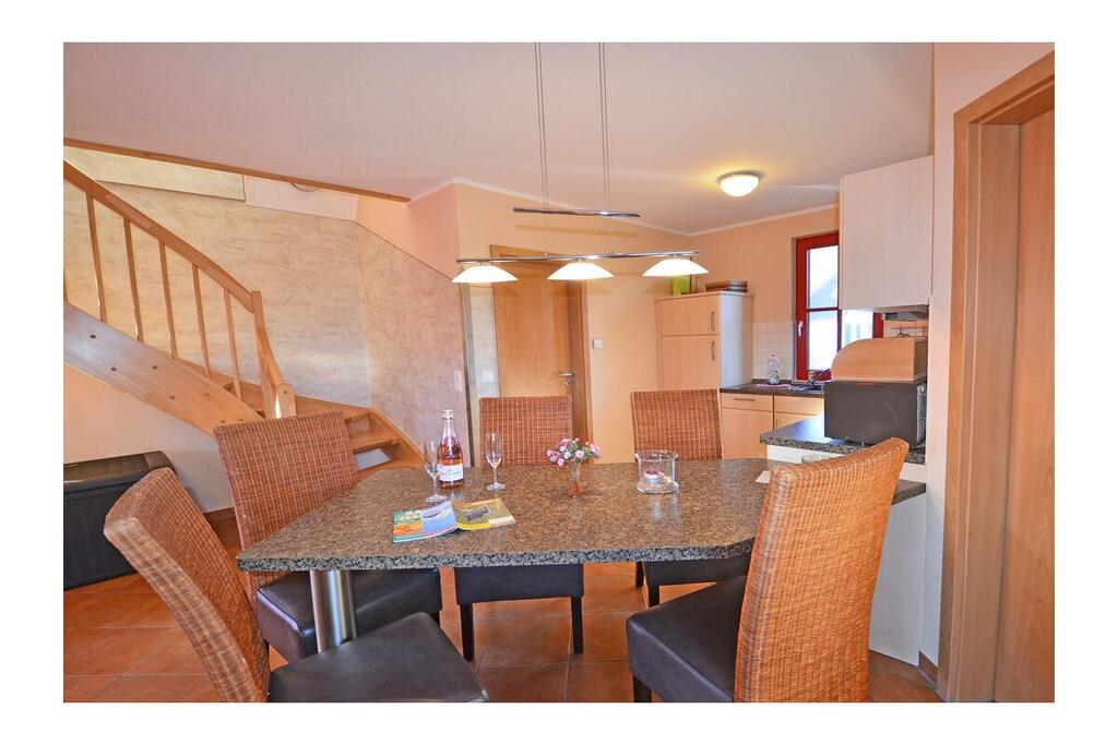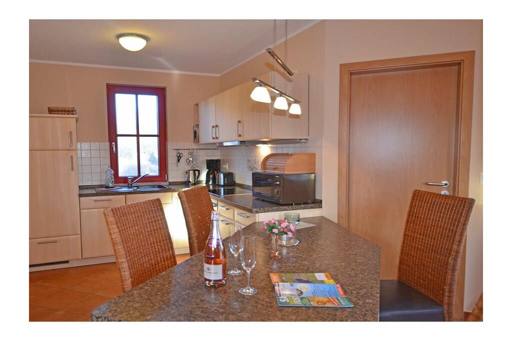 Erholungsort Glowe am Kliff Königshörn, über 2 Etagen, zentrale Lage, ca 400 m zum Sandstrand, ca 300 m zum Hafen Glowe Erdgeschoss: großzügiger Wohn- Essbereich mit Fußbodenheizung und Kamin, gemütliche Couch, TV/ Sat (Flatscreen), offene komplett ausgestattete Einbauküche mit 4- Plattenherd (Ceranfeld), Backofen, Kühlschrank mit kleinem Gefrierfach, Mikrowelle, Geschirrspüler und diversen Elektrogeräten, Bad mit Dusche und WC, Obergeschoss: 1. Schlafzimmer mit Doppelbett und Kleiderschrank, 2. Schlafzimmer mit 2 Einzelbetten, TV und Kleiderschrank, Terrasse mit Gartenmöbeln und Grill “ein unvergesslicher Urlaubsspaß zum träumen und genießen im Reethaus” Reetdachgedecktes Haus, komplett umzäuntes Grundstück ca. 500 qm, Waschmaschine ohne Gebühr, Liegewiese, 1 PKW- Stellplatz am Haus, ca. 400 m naturbelassener Pfad zum Ostseestrand, ca. 150 m zum Park mit großem Spielplatz, Einkaufsmöglichkeiten, Bäcker und Restaurant in unmittelbarer Nähe, optimale Rad- und Wandermöglichkeiten, Haustiere nach Absprache