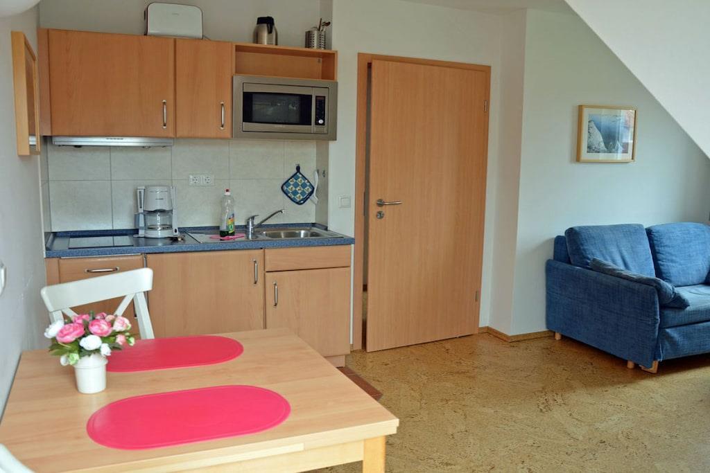 Erholungsort Glowe, 1. Etage, sehr ruhige Lage, ca. 500 m zum Sandstrand (Ostsee), ca. 1 km zum Bodden Wohn- Essbereich mit Fußbodenheizung, Couch, TV/ Sat (Flatscreen), WLAN vorhanden, Radio/ CD, offene Küchenzeile mit 2- Plattenherd (Ceranfeld), Kühlschrank mit kleinem Gefrierfach, Mikrowelle und diversen Elektrogeräten, Schlafzimmer mit Doppelbett und Kleiderschrank, Bad mit Dusche und WC, gemeinschaftlich genutzter Wirtschaftsraum mit Waschmaschine, Wäschetrockner, große Gefriertruhe, Balkon mit Gartenmöbeln und Sonnenschirm (Balkontrennung durch Seitenmarkise zur Nebenwohnung) “nur"Nur 8 Gehminuten zum Ostseesandstrand” Nichtraucherwohnung, Fußbodenheizung im gesamten Haus,Waschmaschine und Waschtrockner ohne Gebühr, Grundstück ca. 500 qm, 1 PKW- Stellplatz am Haus, Haustiere nicht erwünscht, diverse Einkaufsmöglichkeiten mit Bäcker und Restaurants im Ort vorhanden, optimale Rad- und Wandermöglichkeiten