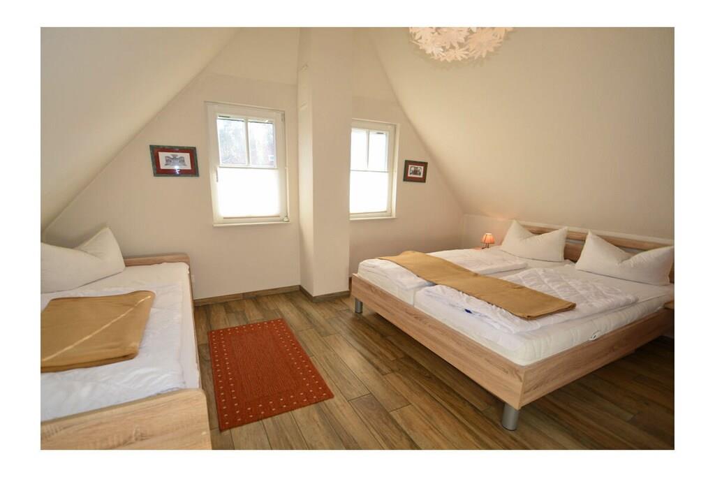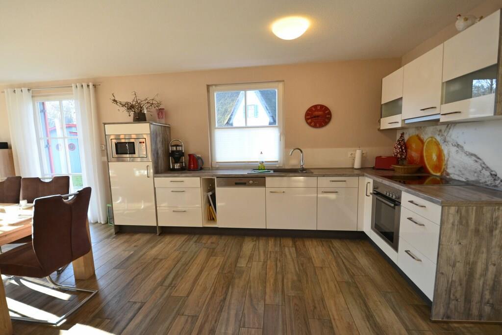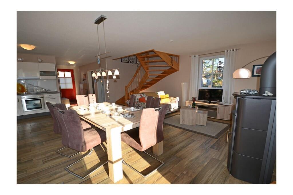 Erdgeschoss: großzügiger Wohn- Essbereich mit Kamin und Fußbodenheizung, gemütliche Couchlandschaft und Sessel, TV-Sat (OLED Fernseher), CD-Player/DVD-Player, WLAN vorhanden, offene komplett ausgestattete hochwertige Einbauküche mit 4-Plattenherd (Ceran), Backofen, Kühlschrank mit kleinem Gefrierfach, Geschirrspüler und diversen Elektrogeräten (Mikrowelle, Kaffeemaschine, Toaster, Wasserkocher etc.), Badezimmer mit WC und ebenerdiger Dusche, Wellnessbereich mit Sauna, Hauswirtschaftsraum mit Waschmaschine, Wäscheständer und Staubsauger; Flur mit Garderobe und Spiegel Obergeschoss: 1. Schlafzimmer mit einem Doppelbett (getrennte Matratzen je 90 × 200cm), Kleiderschrank und TV 2. Schlafzimmer mit einem Doppelbett (durchgehende Matratze 160×200cm), einem Einzelbett (90x200cm) mit Ausziehfunktion (80cm x 200cm) und Kleiderschrank, großes Badezimmer mit Badewanne, Dusche, separates WC, Kosmetikspiegel und Handtuchhalter Außenbereich: Terrasse mit gemütlichen Gartenmöbeln, ein Strandkorb lädt zum Relaxen ein, Grillmöglichkeit besteht (Grill vorhanden), große Liegewiese und Bollerwagen “Unter Reet einen perfekten Urlaubstraum erleben” Zwischen den Halbinseln Jasmund und Wittow, im Norden Rügens, liegt das einstige Fischerdorf Glowe. Mittendrin liegt unser Ferienhaus „Strandläufer“. Das Grundstück umfasst ganze 600qm und bietet richtig viel Platz mit einer großen Liege/ – Spielwiese und einer großen Terrasse. Auf der Terrasse finden Sie schöne Holzgartenmöbel und einen Steingrill. Hier entsteht Urlaubsatmosphäre pur! Unser „Strandläufer“ ist ein Nichtraucherhaus. Internet (WLAN) sowie die Waschmaschine stehen Ihnen zur kostenlosen Nutzung zur Verfügung. Damit Ihre Kleinen bei der Treppe nicht zu Schaden kommen, gibt es ein Kinderschutz-Treppengitter, was gerne genutzt werden kann. Fußbodenheizung gibt es im ganzen Haus. Alle Schlafzimmer sind mit Insektenschutz ausgestattet, damit die Mücken nicht zur Plage werden. Die Lage der gemütlichen und ruhig gelegenen Reethaus Siedlung am Ortsausgang von Glowe bietet eine perfekte Strandlage, ist aber auch Ausgangspunkt für ausgedehnte Spaziergänge und Fahrradtouren mit dem Bodden im Hinterland und Schloss Spyker. Für Ihre Fahrräder steht Ihnen ein abschließbares Gartenhaus als Unterstellmöglichkeit zur Verfügung. Zu den Einkaufsmöglichkeiten, Restaurants, Cafés, Fischräuchereien, zum Fahrradverleih und zur 9km langen Strandpromenade (Schaabe) sind es nur wenige Gehminuten. Direkt am Haus gibt es für Sie und Ihrer Familie 2 PKW-Stellplätze zur alleinigen Nutzung. Ein Haustier ist nach Absprache Herzlich Willkommen! (Gebühr Euro 10,- / Nacht). Weitere Haustiere nach Rücksprache.