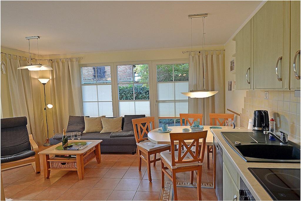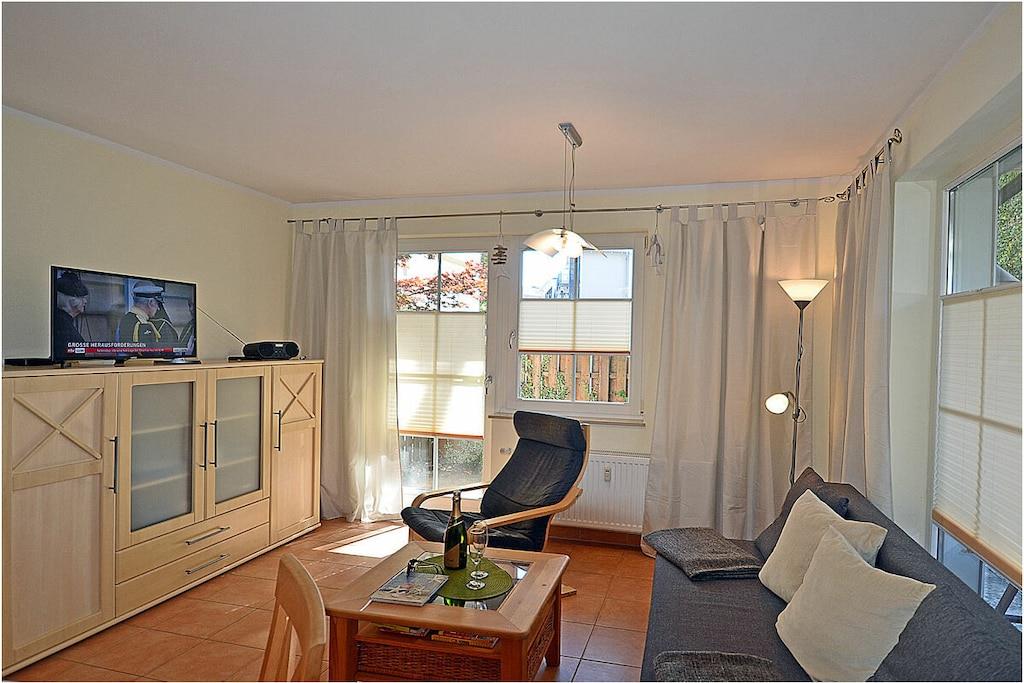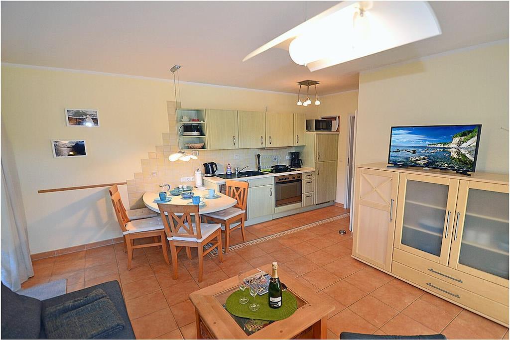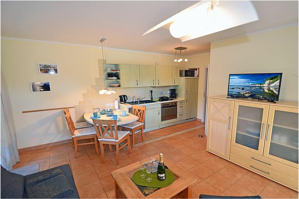 Erdgeschoss: Wohn- Essbereich, gemütliche Ausziehcouch mit Schlaffunktion (140 x 190), TV/ Sat (Smart-TV) und Radio, kostenfreies Internet (WLAN), Bücher und Gesellschaftsspiele für gemütliche Abende, komplett ausgestattete Einbauküche mit 4- Plattenherd (Ceran), Backofen, Kühlschrank mit mittelgroßem Gefrierfach, Geschirrspüler, Mikrowelle und diversen Elektrogeräten, Bad mit Fußbodenheizung, Dusche und WC, Föhn, Schlafzimmer mit Doppelbett (2 Matratzen je 90×200) und Kleiderschrank, Flur mit Garderobe, separater Abstellraum mit Staubsauger, Wäscheständer, Bügelbrett und Bügeleisen, Kinderreisebett mit Inlett, Kinderstuhl (Tripp-Trapp) Außenbereich: separater verschließbarer Terrassenzugang, überdachte Terrasse mit Gartenmöbeln (Tisch und 4 Gartenstühlen), Außensteckdose, Grillmöglichkeit besteht, dafür steht ein Tischgrill zur Verfügung Besonderes: Willkommen in der – Villa Böck 7 – Urlaub direkt am Ostseestrand! Die Ferienwohnung „Villa Böck 7“ befindet sich direkt am weißsandigen Ostseestrand und ist liebevoll eingerichtet. Die voll ausgestattete Küche lässt keine Wünsche offen. Die Terrasse (Zugang vom Wohn- und Küchenbereich) lädt zum Verweilen ein. Die Ferienwohnung „Villa Böck 7“ ist ein Nichtraucherquartier. Für die Kleinen gibt es ein Kinderbett und ein Kinderhochstuhl. In jedem Raum sind Insektenschutzgitter angebracht. Der PKW-Stellplatz mit der Nr. 7 befindet sich direkt am Objekt. Die überdachte umzäunte Terrasse lädt zum Verweilen ein und bietet sichere Abstellmöglichkeiten für Ihre Fahrräder. Einkaufsmöglichkeiten, Bäcker, Restaurant und einen Fahrradverleih sind in unmittelbarer Nähe. Der Standort ist perfekt für Angler, da vom Hafen aus die Fahrt auf die Ostsee für Lachs und Dorsch oder auch auf umliegenden Boddengewässer für Hecht und Zander, möglich ist. Der Hafen Glowe ist nur 3 min Fußweg von der Ferienwohnung entfernt. Optimale Rad- und Wandermöglichkeiten um die Insel zu erkunden, runden das Angebot ab.