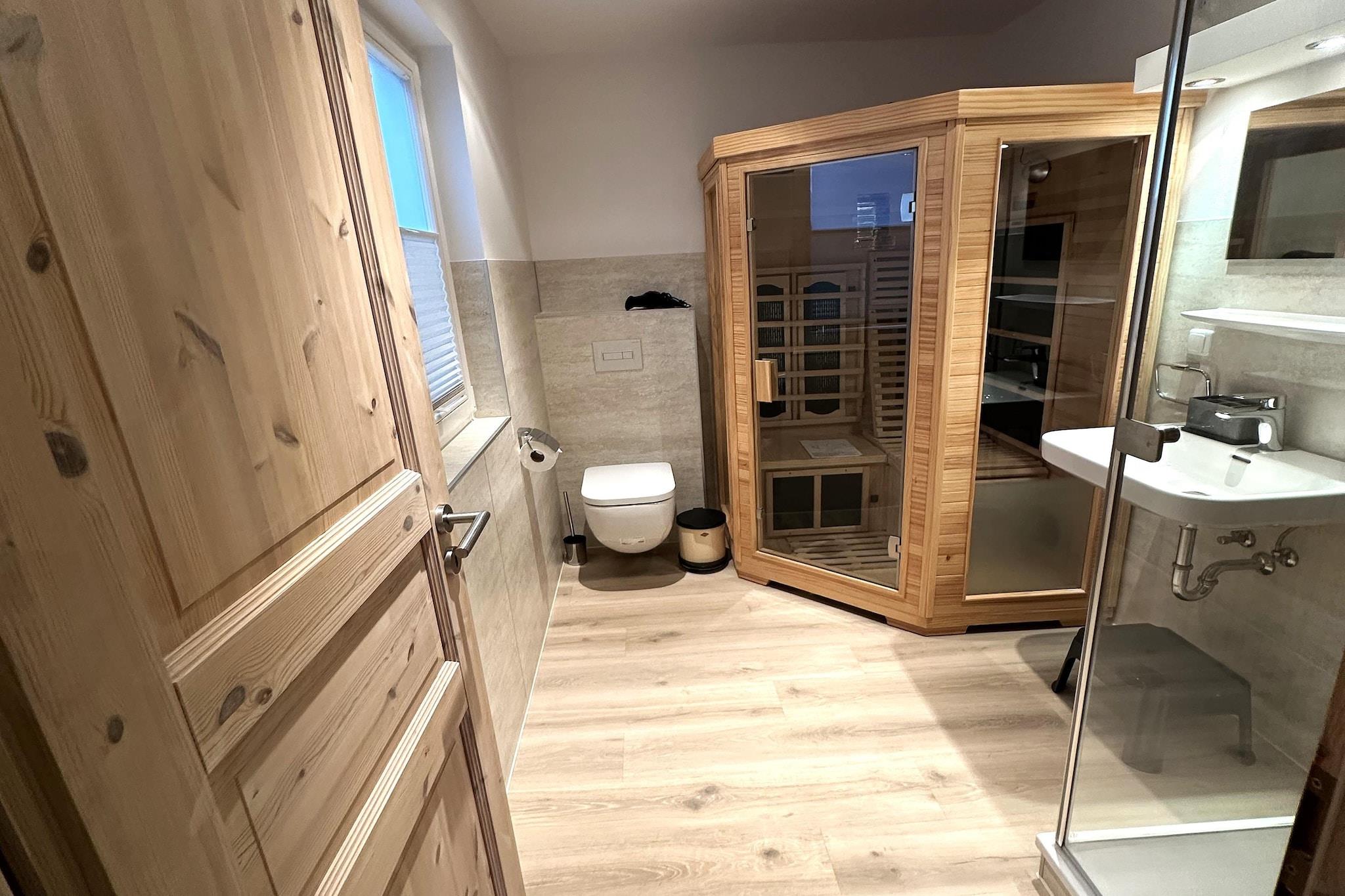 Parterre: (Badezimmer(Dusche, Infrarotsauna, Toilette)) In der 1. Etage: (Schlafzimmer(Doppelbett, TV(Satellit)), Schlafzimmer(Einzelbett, Einzelbett), Badezimmer(Dusche, Toilette, Föhn)) offene Küche(Esstisch, Kochplatte(4 Kochplatten, Ceranfeld), Wasserkocher, Toaster, Kaffeemaschine, Backofen, Mikrowelle, Spülmaschine, Kühl-/Gefrierkombination), Wohn/Esszimmer(Doppelschlafcouch, TV(Satellit), Radio, Heizung(Zentral)), Grill, Waschmaschine, Terrasse, Gartenmöbel, Parkplatz, Hochstuhl, Babybett (kostenlos), Handtücher/Bettwäsche (extra Gebühr)