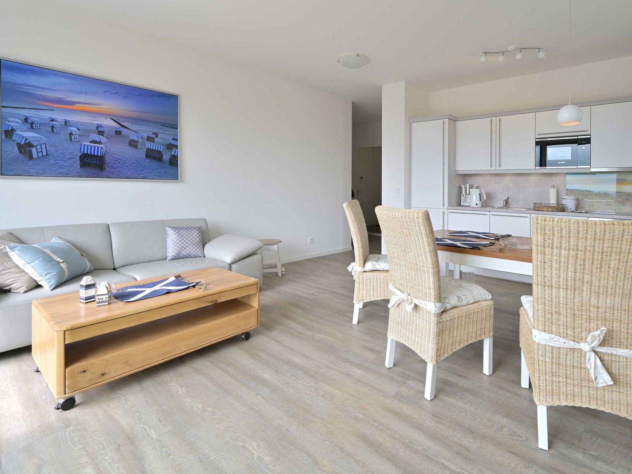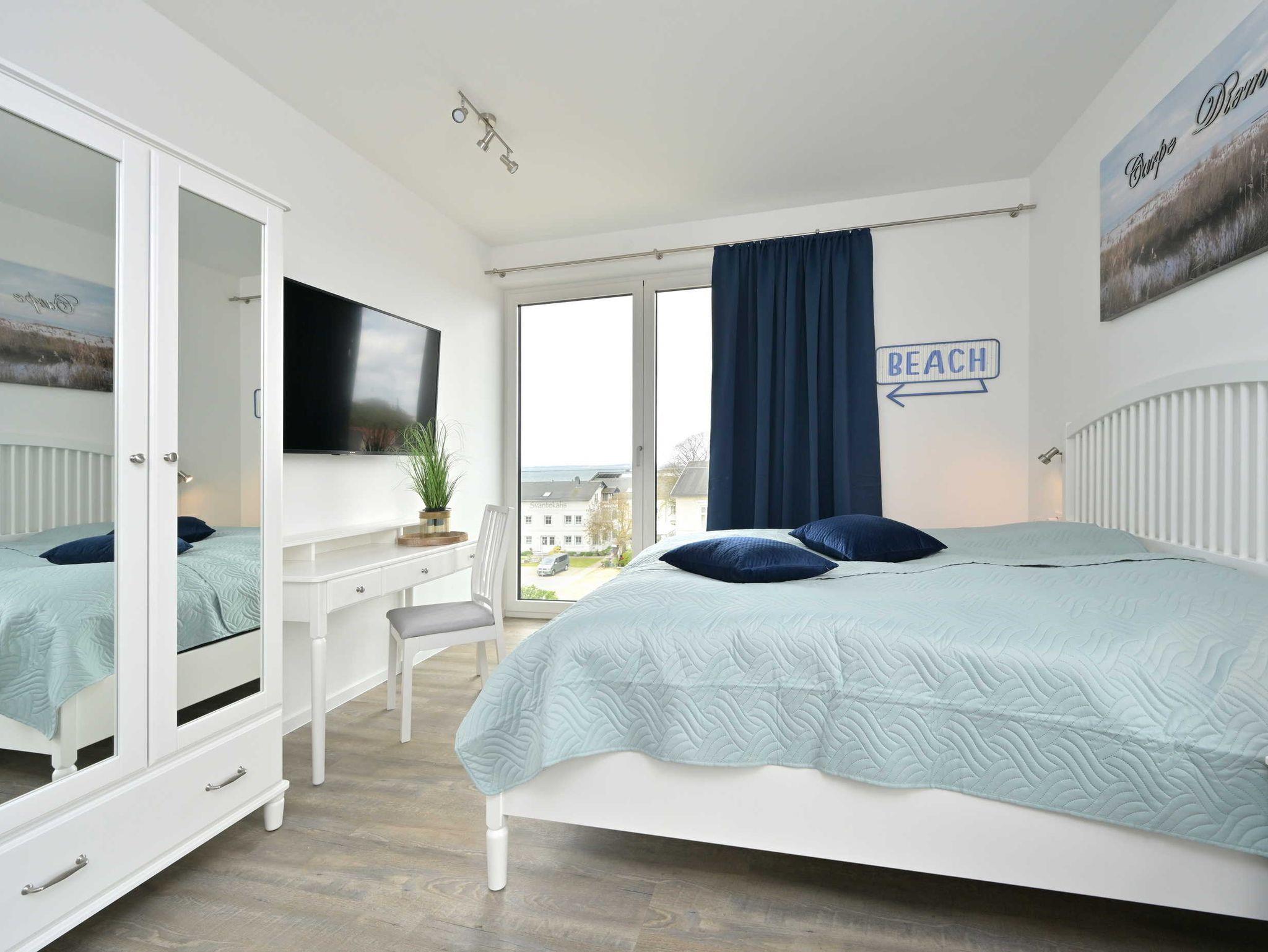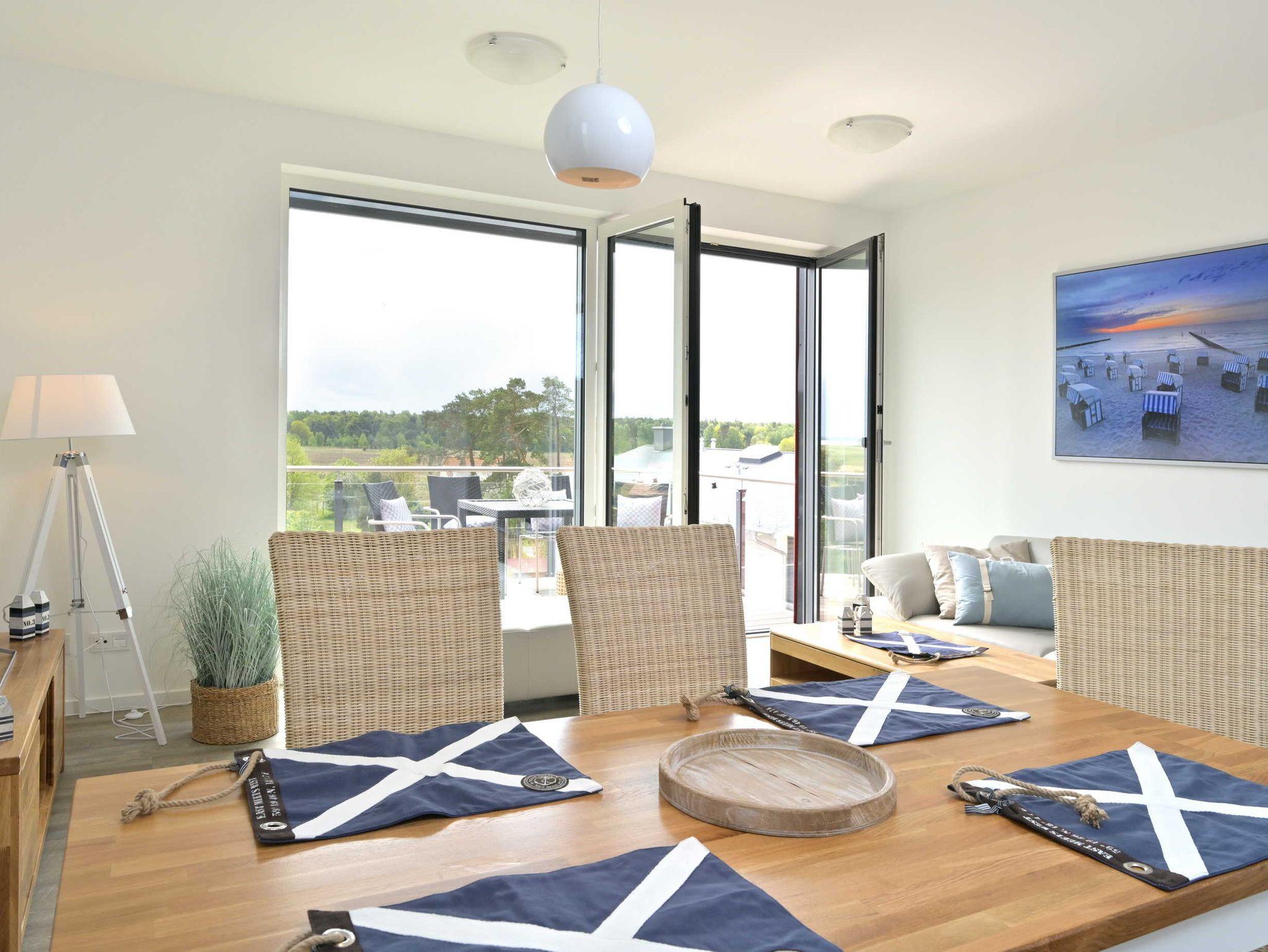 Die Ferienwohnung ArkonaPanorama im Haus Seezeichen in Glowe bietet 3 geräumige Schlafzimmer mit insgesamt 7 Schlafplätzen, einen großzügigen Wohnbereich mit integrierter Küche und angrenzendem Balkon sowie zwei Bäder mit ebenerdigen Duschen.