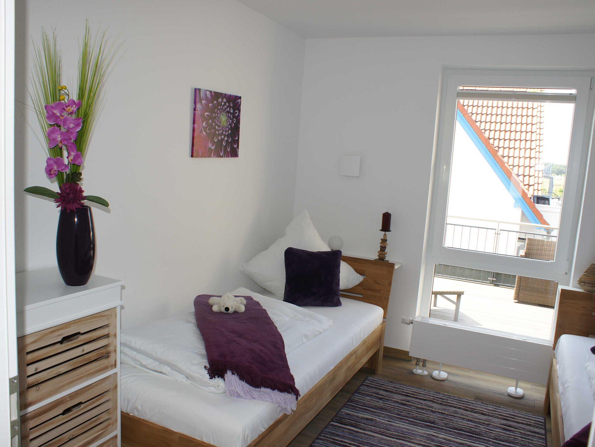 Ein Schlafzimmer verfügt über ein Doppelbett, im Kinderschlafzimmer finden sich zwei einzelstehende Betten.
