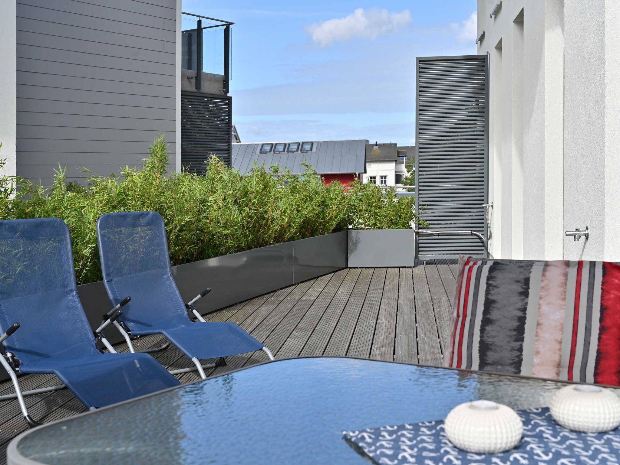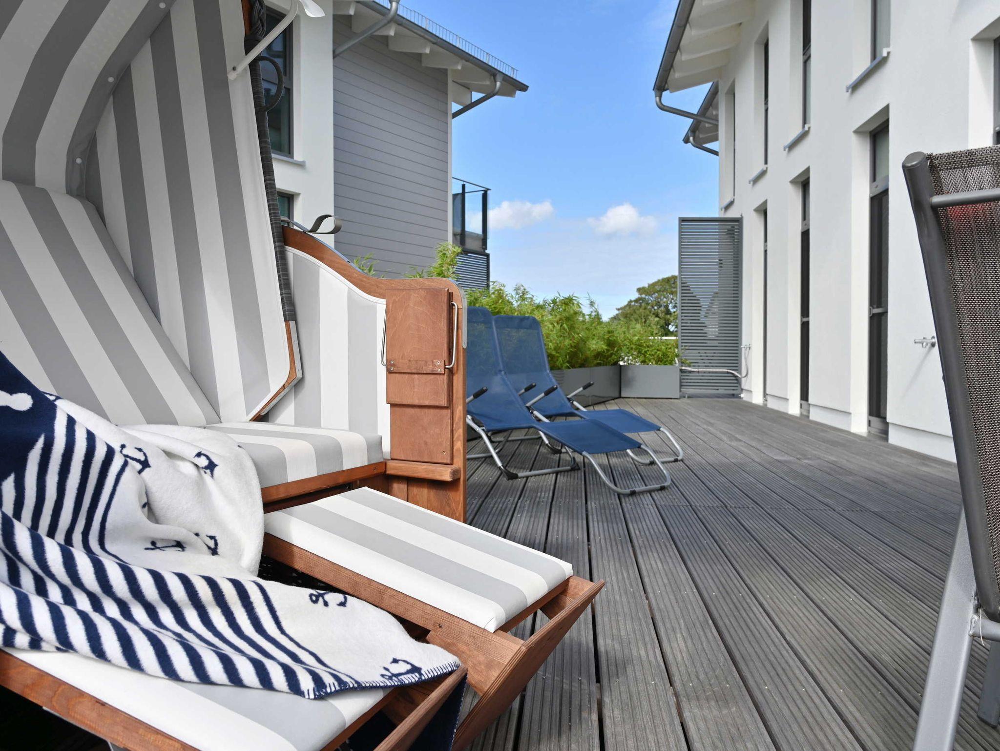Der Wohnbereich grenzt an einen Balkon wie an eine großzügige Dachterrasse mit Strandkorb, Sonnenliegen und anderen Gartenmöbeln.