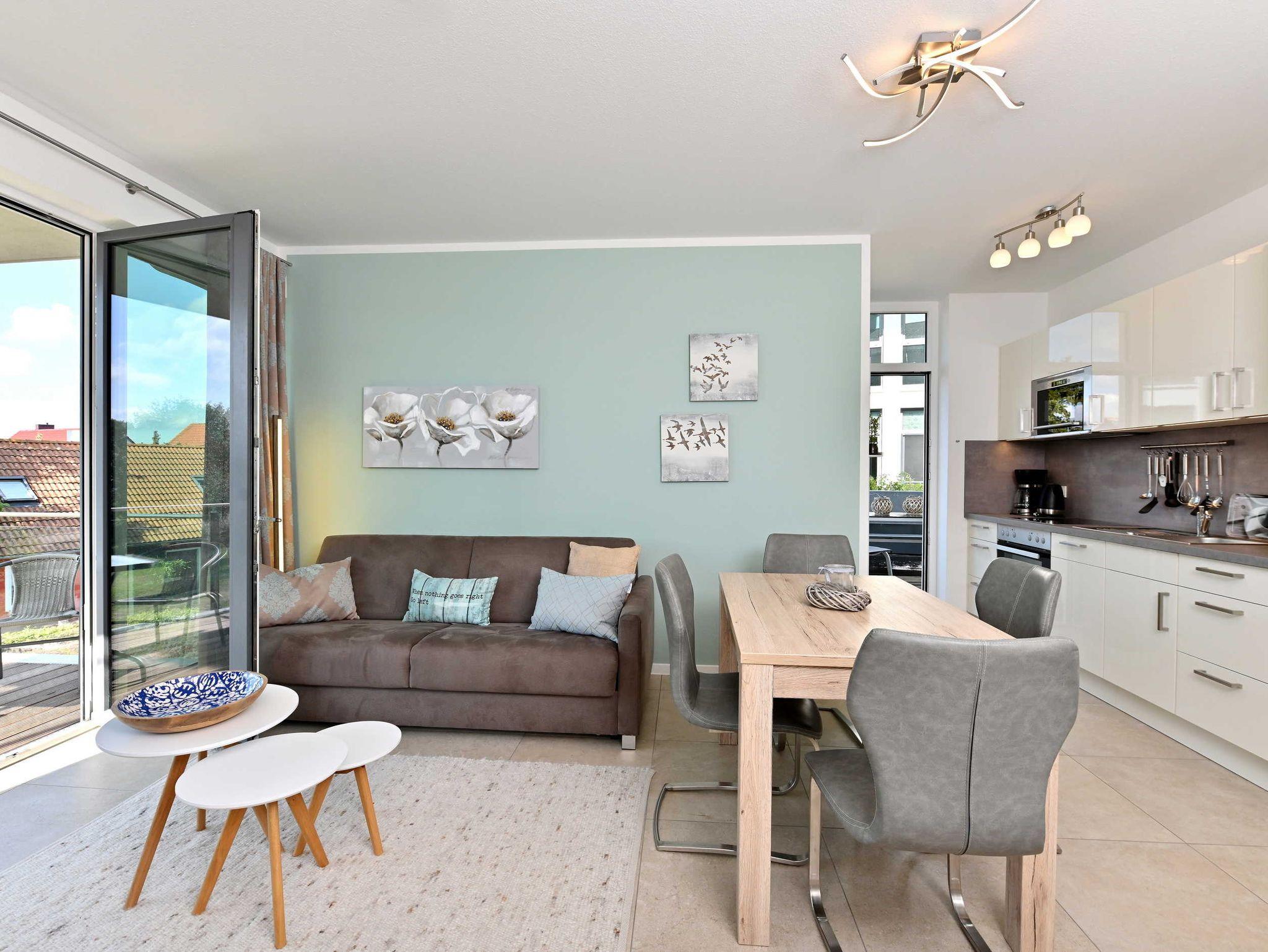 Die Trauminsel verfügt über einen Balkon wie auch über eine große Dachterrasse. Aus dem Wohnbereich erreichen Sie den Balkon wie auch die großzügige Dachterrasse. Ein Strandkorb und weitere Gartenmöbel laden hier zum verweilen ein.