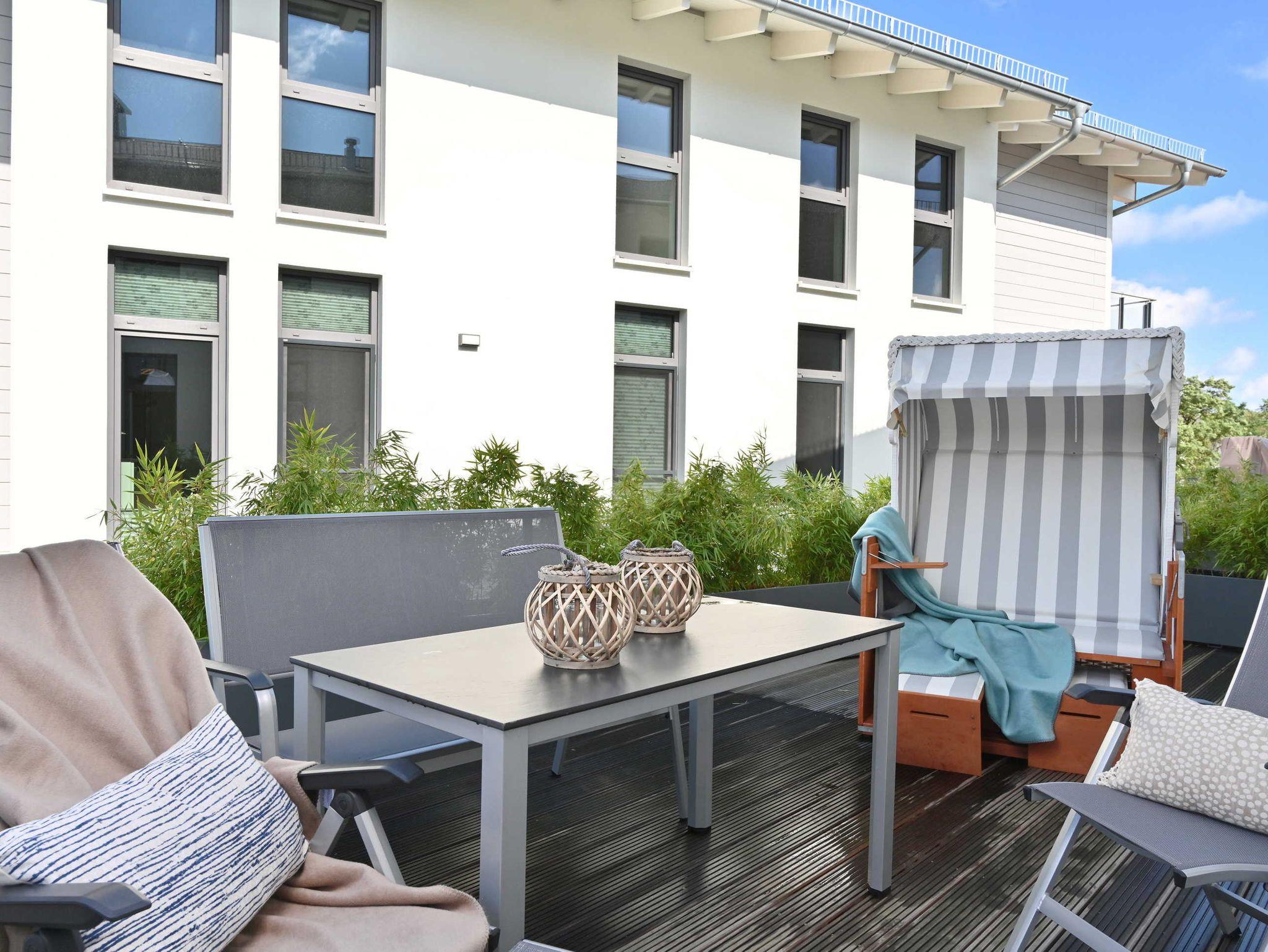 Dachterrasse mit Gartenmöbeln und Strandkorb