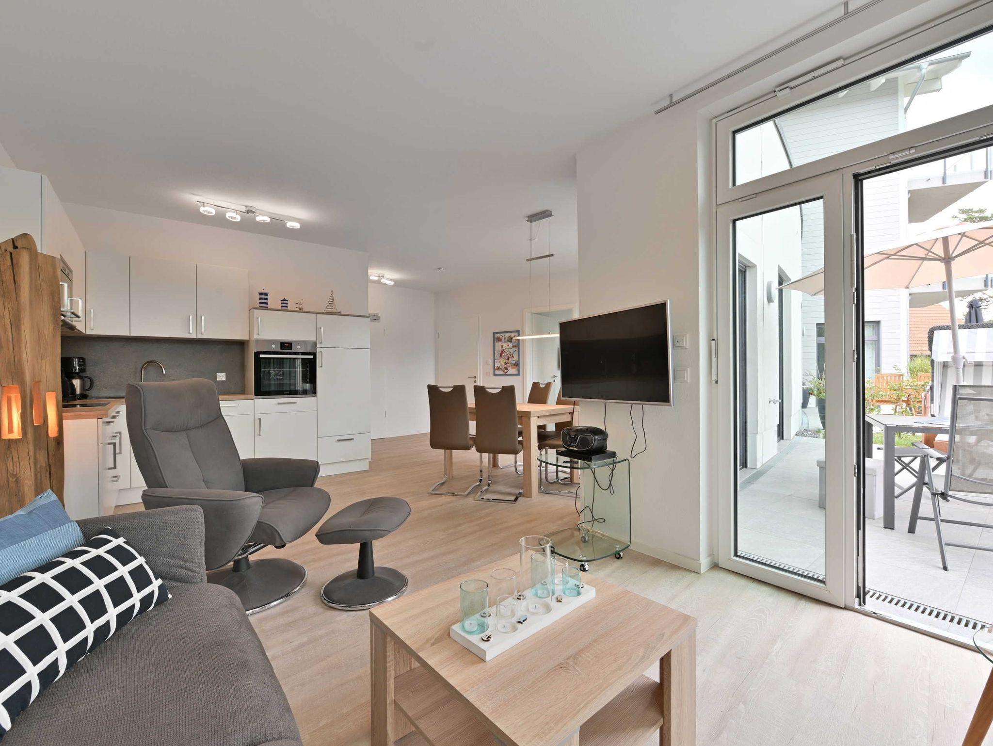Die Wohnung bietet auf 62qm einen gemütlichen Wohnraum mit Schlafcouch und integrierter Küche, einen Schlafraum mit Doppelbett und ein Bad mit Dusche. Die Terrasse ist aus dem Wohn- wie auch aus dem Schlafbereich begehbar.