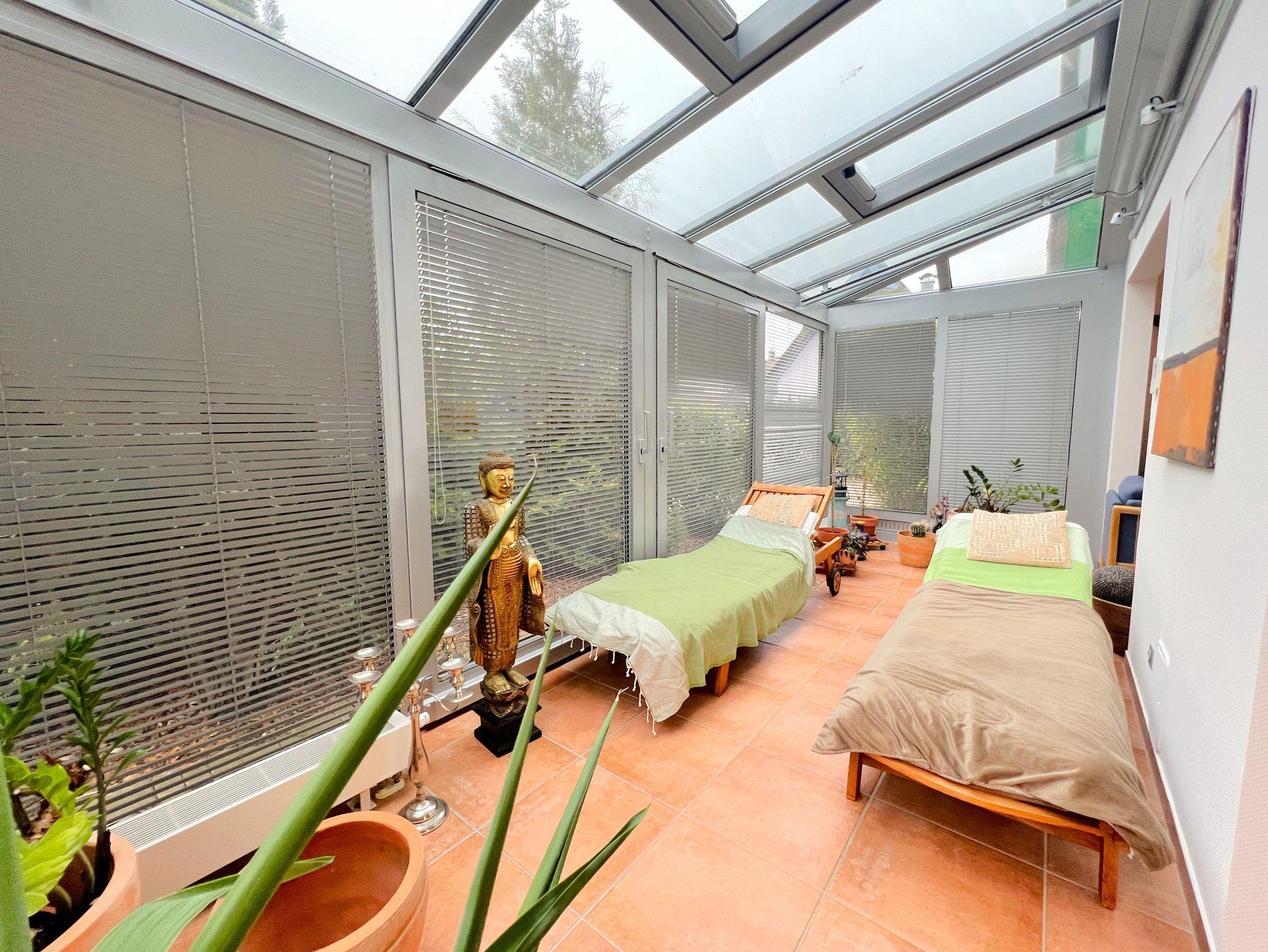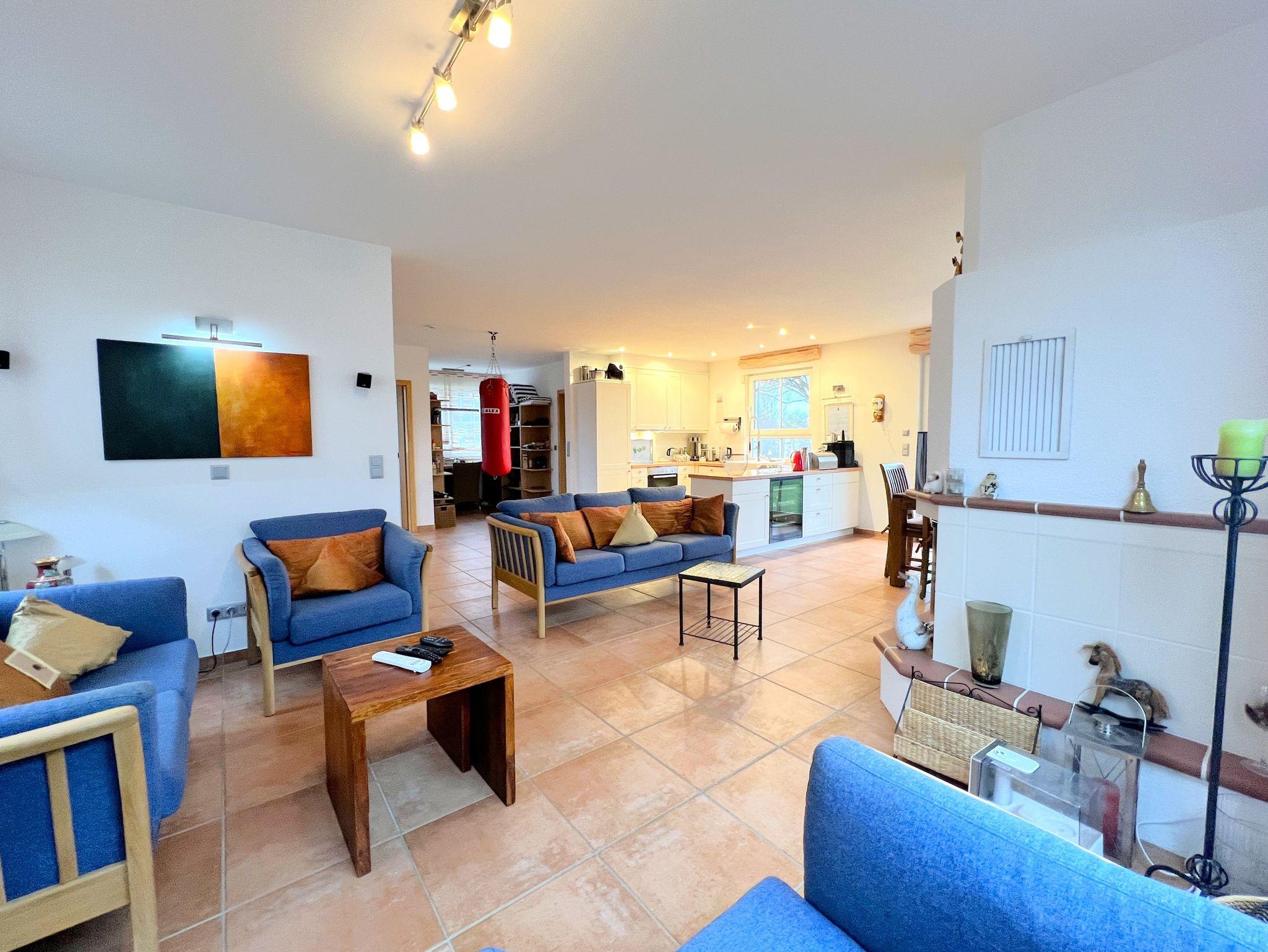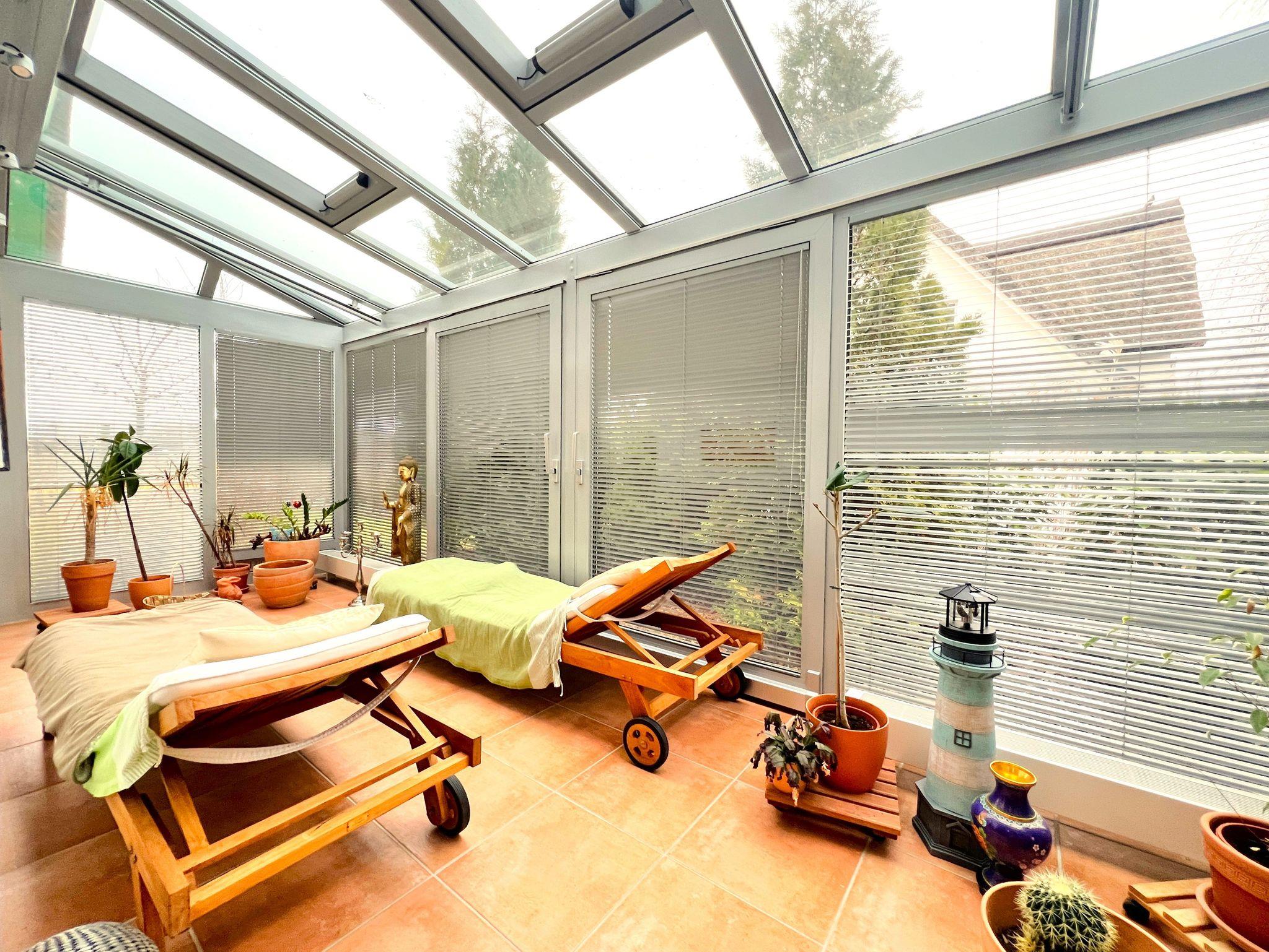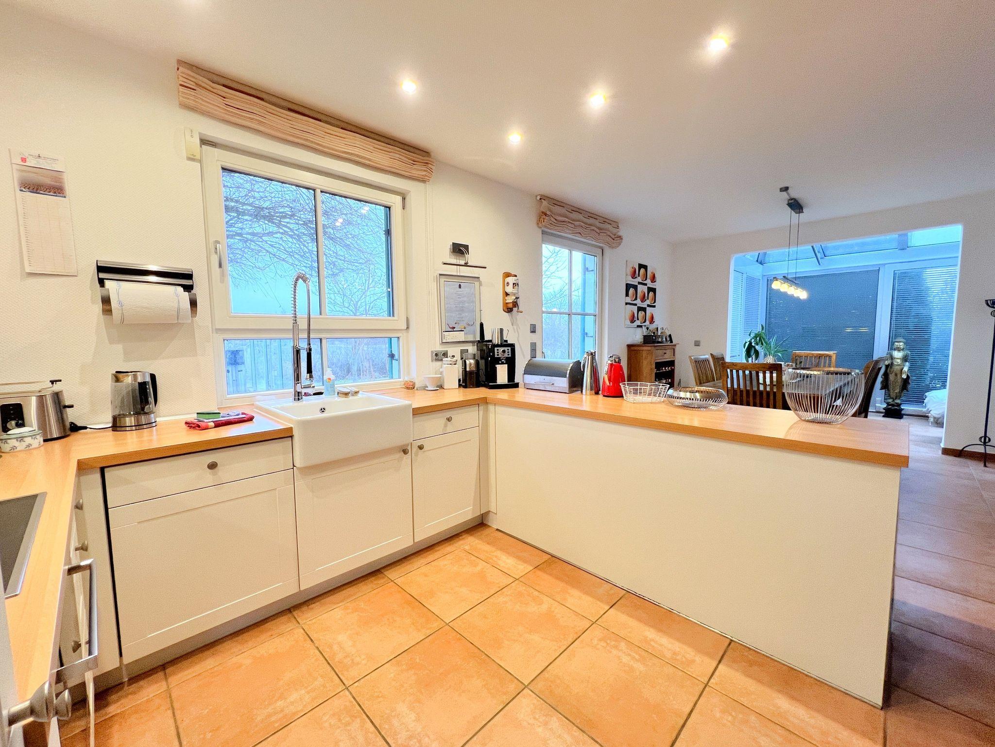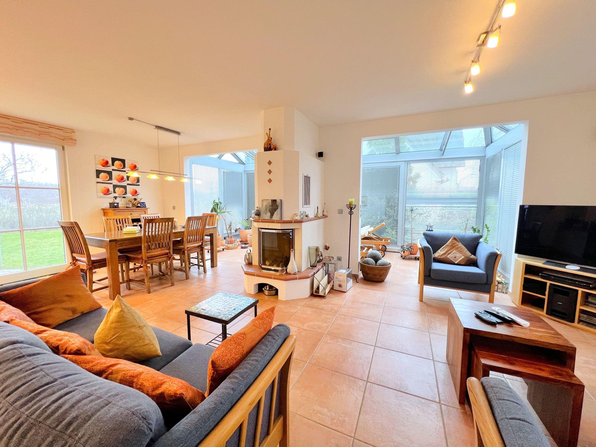 Im Erdgeschoss erwartet Sie ein offen gestalteter Wohn- und Küchenbereich mit viel Platz zum gemeinsamen Kochen und Entspannen. Ein Gaskamin sorgt für eine angenehme Atmosphäre. Ergänzt wird das Raumangebot durch einen ca. 15 m² großen Wintergarten, einen Fitnessraum sowie eine kleine Büroecke. Zusätzlich steht im Erdgeschoss ein Gäste-WC mit Waschbecken zur Verfügung.