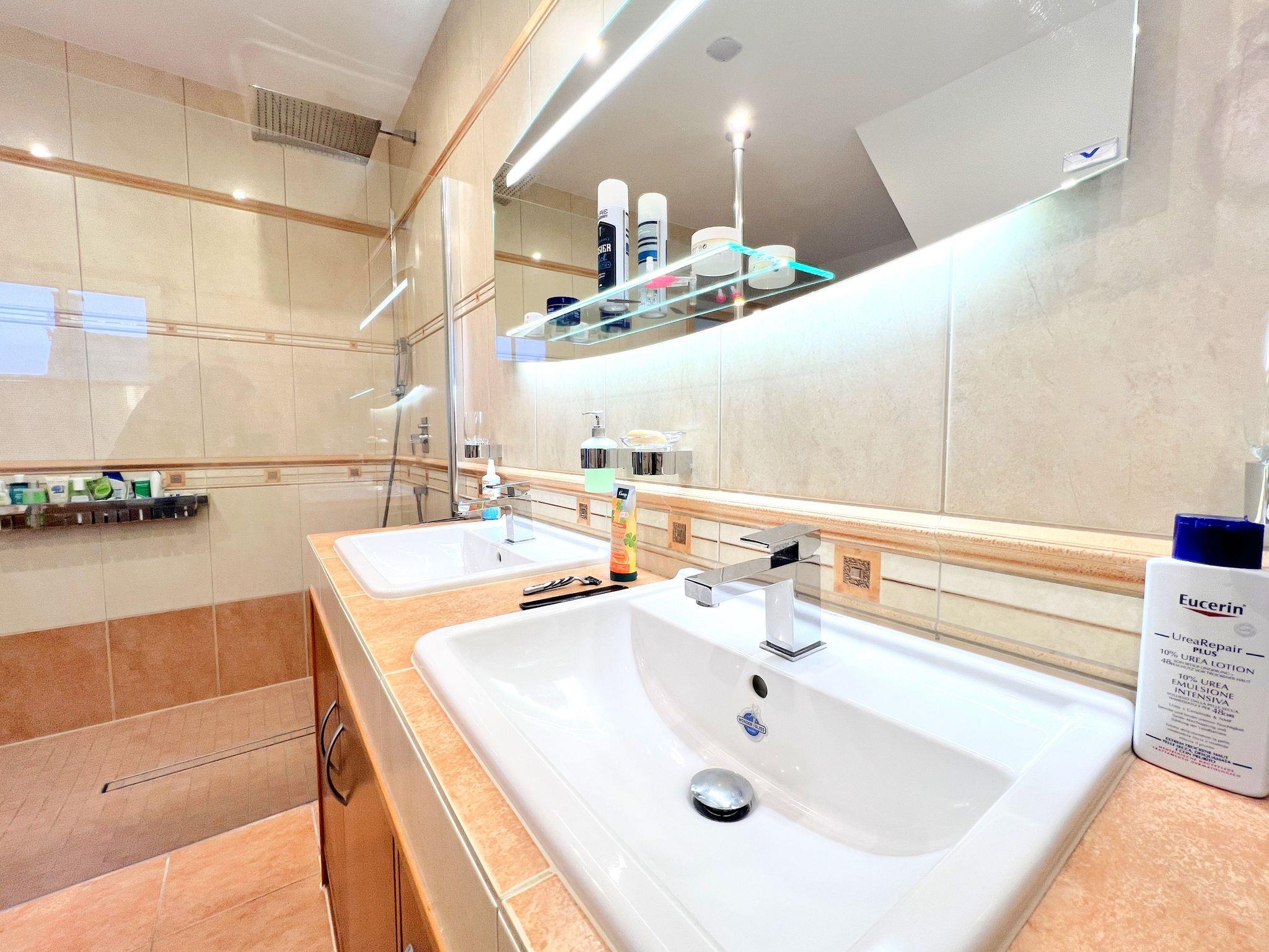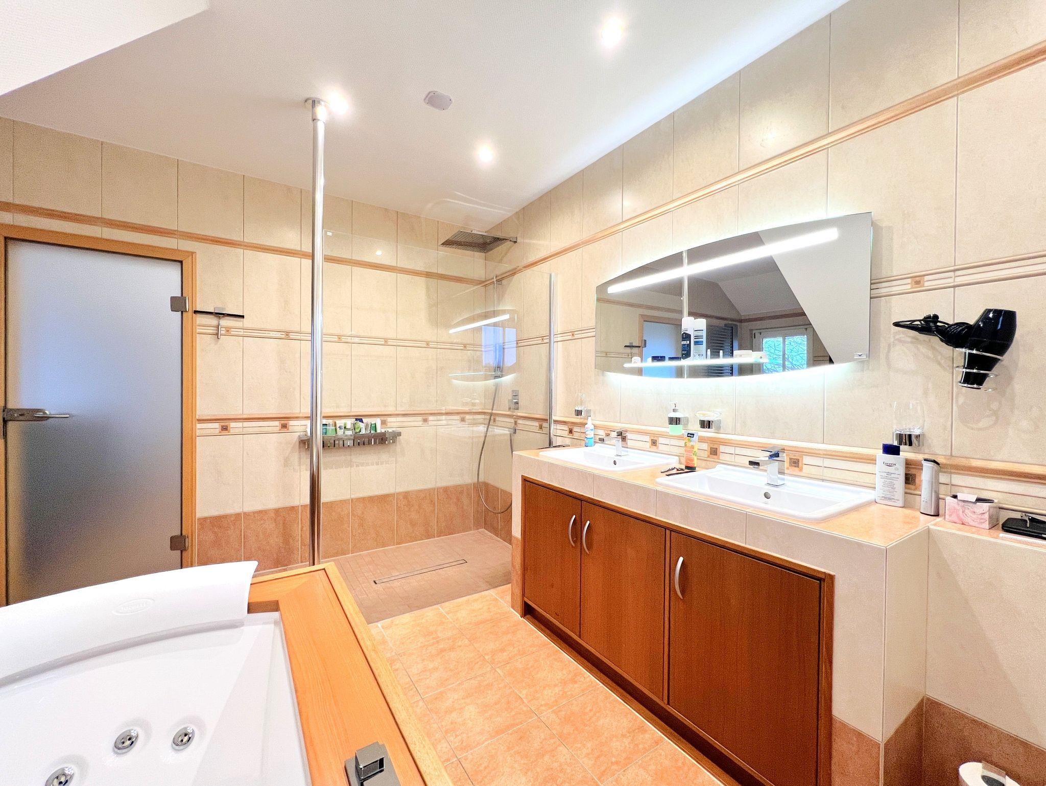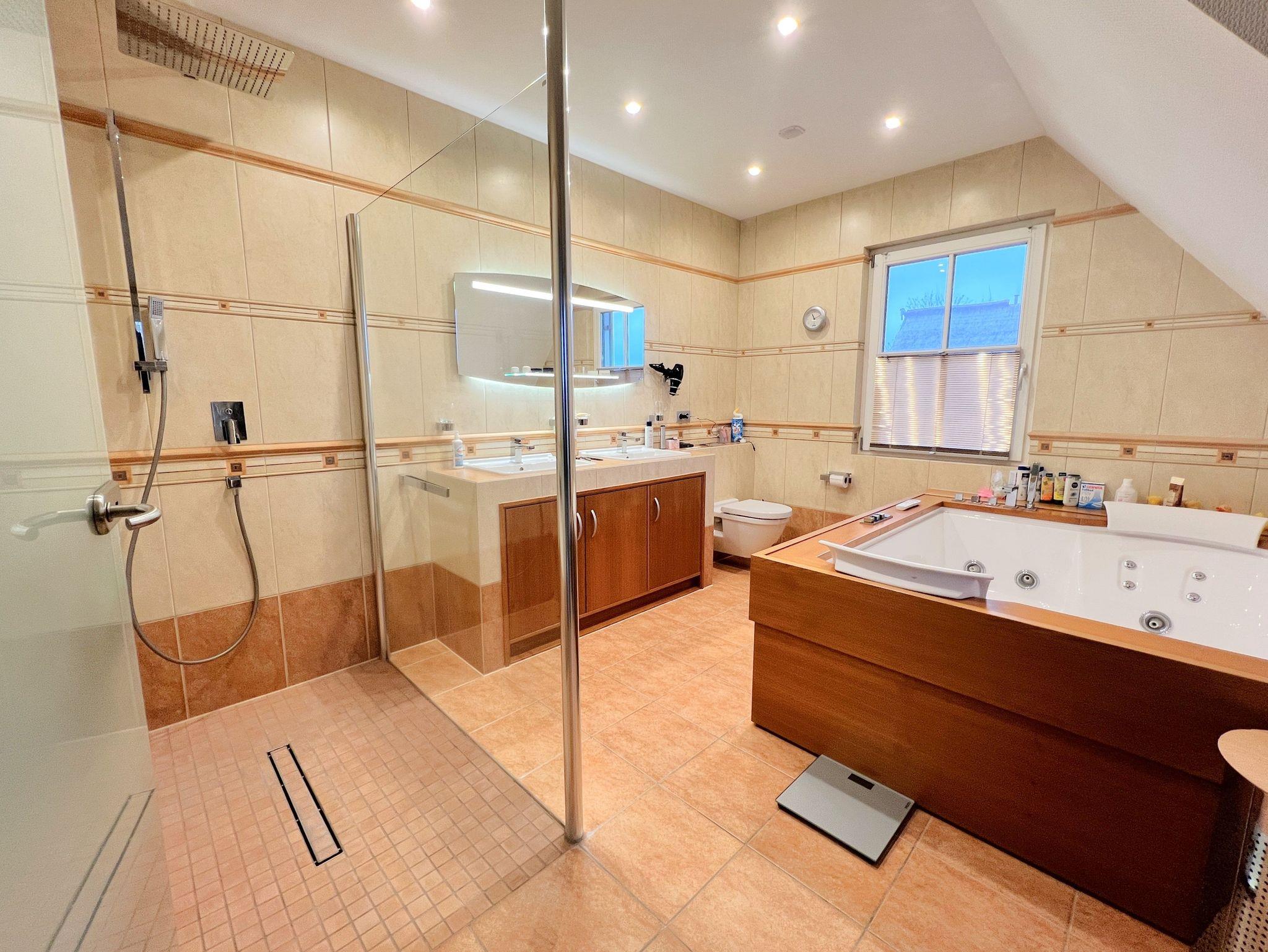 Mit ca. 165 m² Wohnfläche bietet das Haus großzügigen Raum für einen komfortablen Aufenthalt. Im Obergeschoss befinden sich zwei Schlafzimmer ? eines mit großem Doppelbett, das zweite mit französischem Doppelbett ? sowie ein separates Ankleidezimmer. Ebenfalls im Obergeschoss liegt das große Badezimmer mit amerikanischem Whirlpool, moderner Glasdusche und hochwertiger Ausstattung.