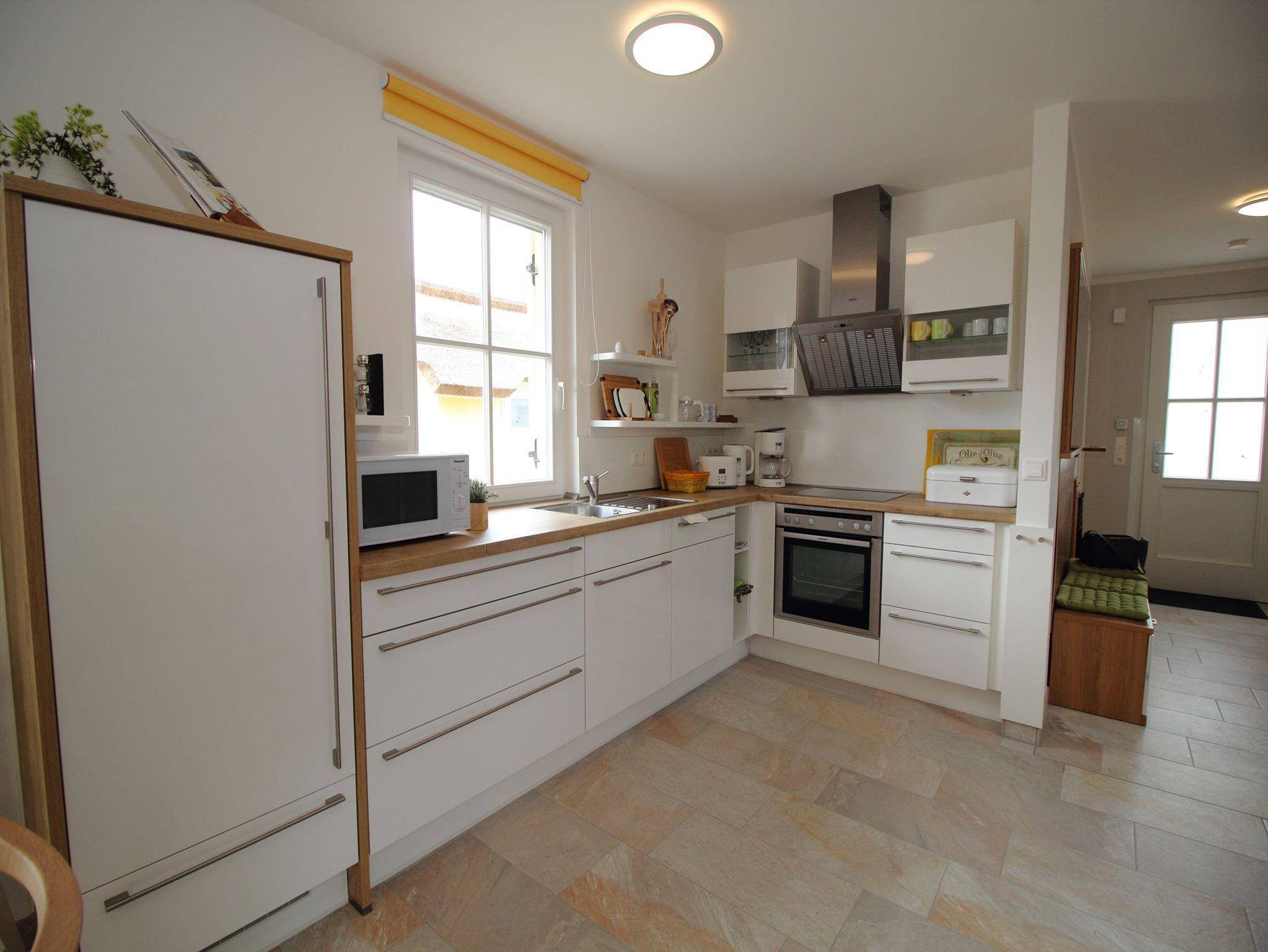 ? eine hochwertig ausgestattete große Küche, Ceranherd mit Backofen, Geschirrspüler, Mikrowelle, großer Kühlschrank mit Gefrierfach, Kaffeemaschine, Mixer, Toaster und Wasserkocher, sowie alle notwendigen Utensilien und viele Extras (z. B. Kindergeschirr, Kinderbesteck).