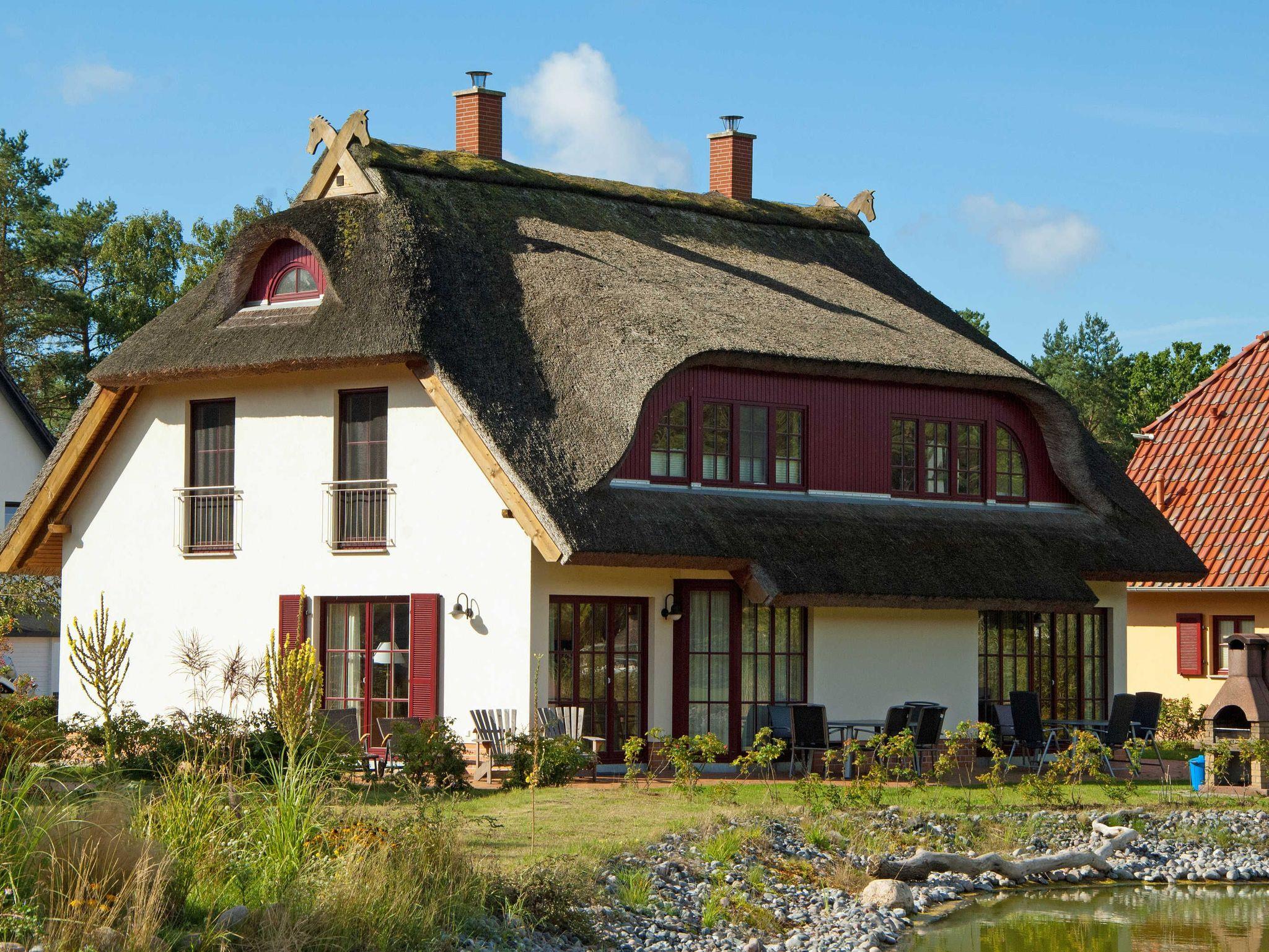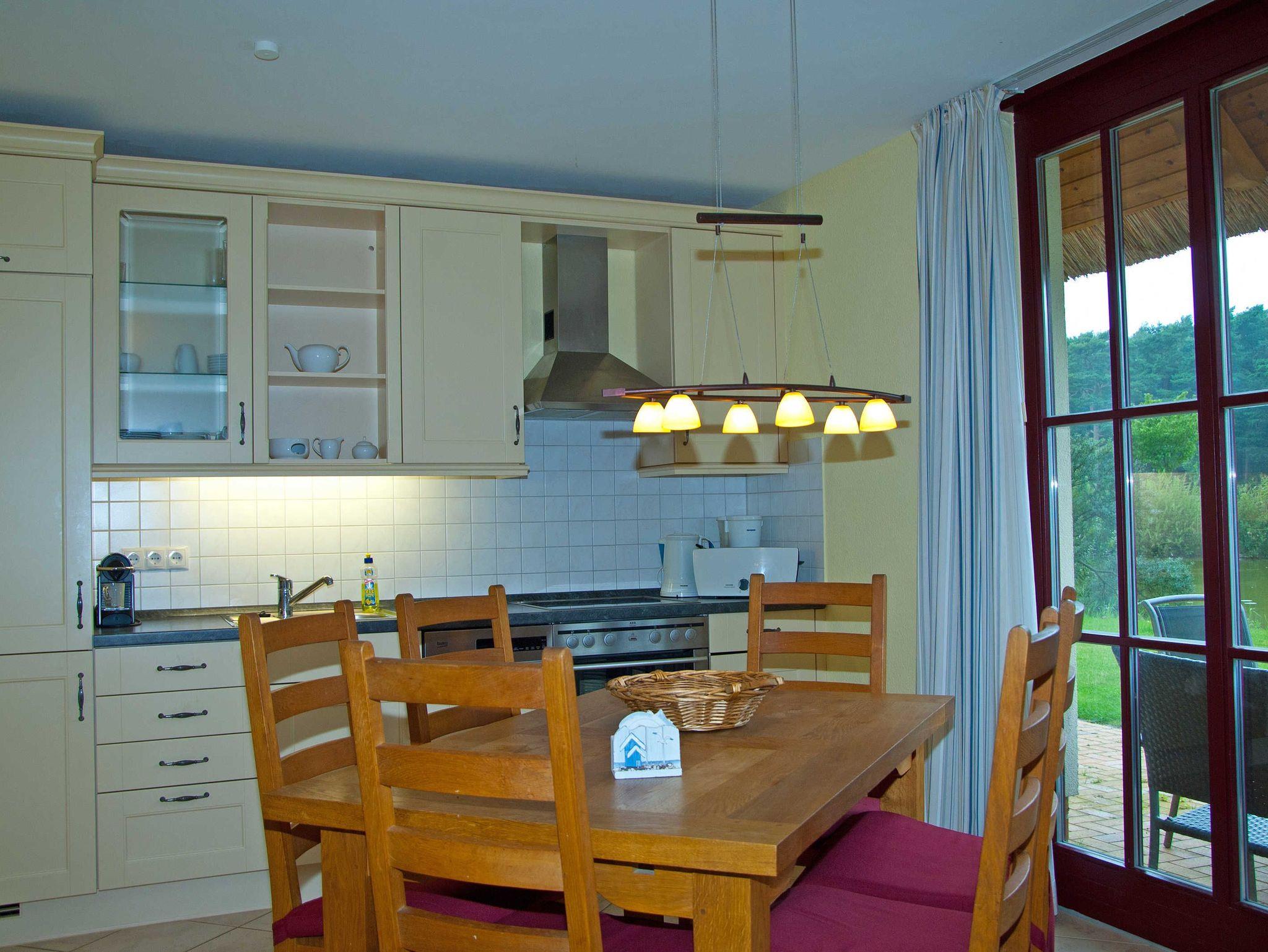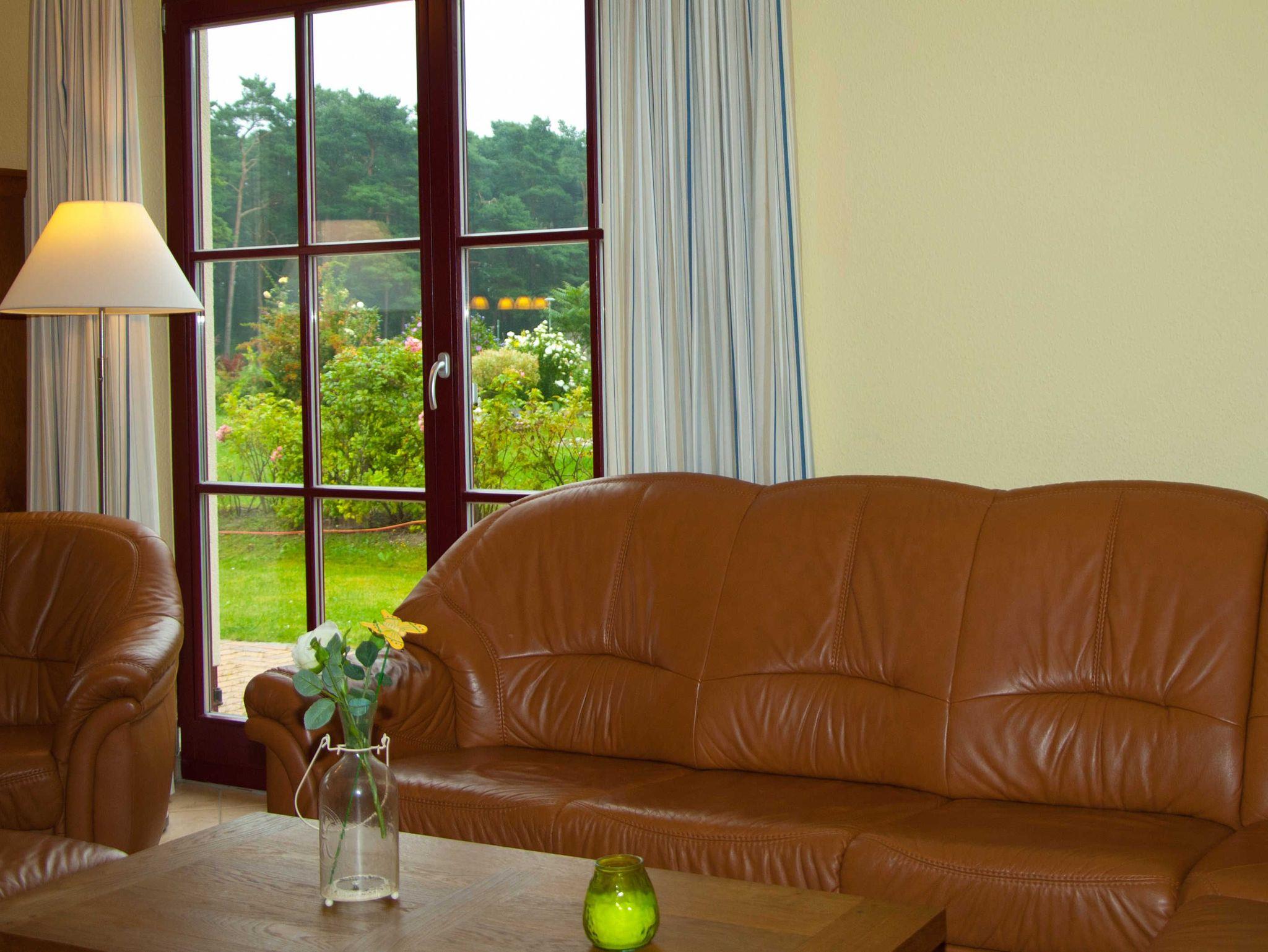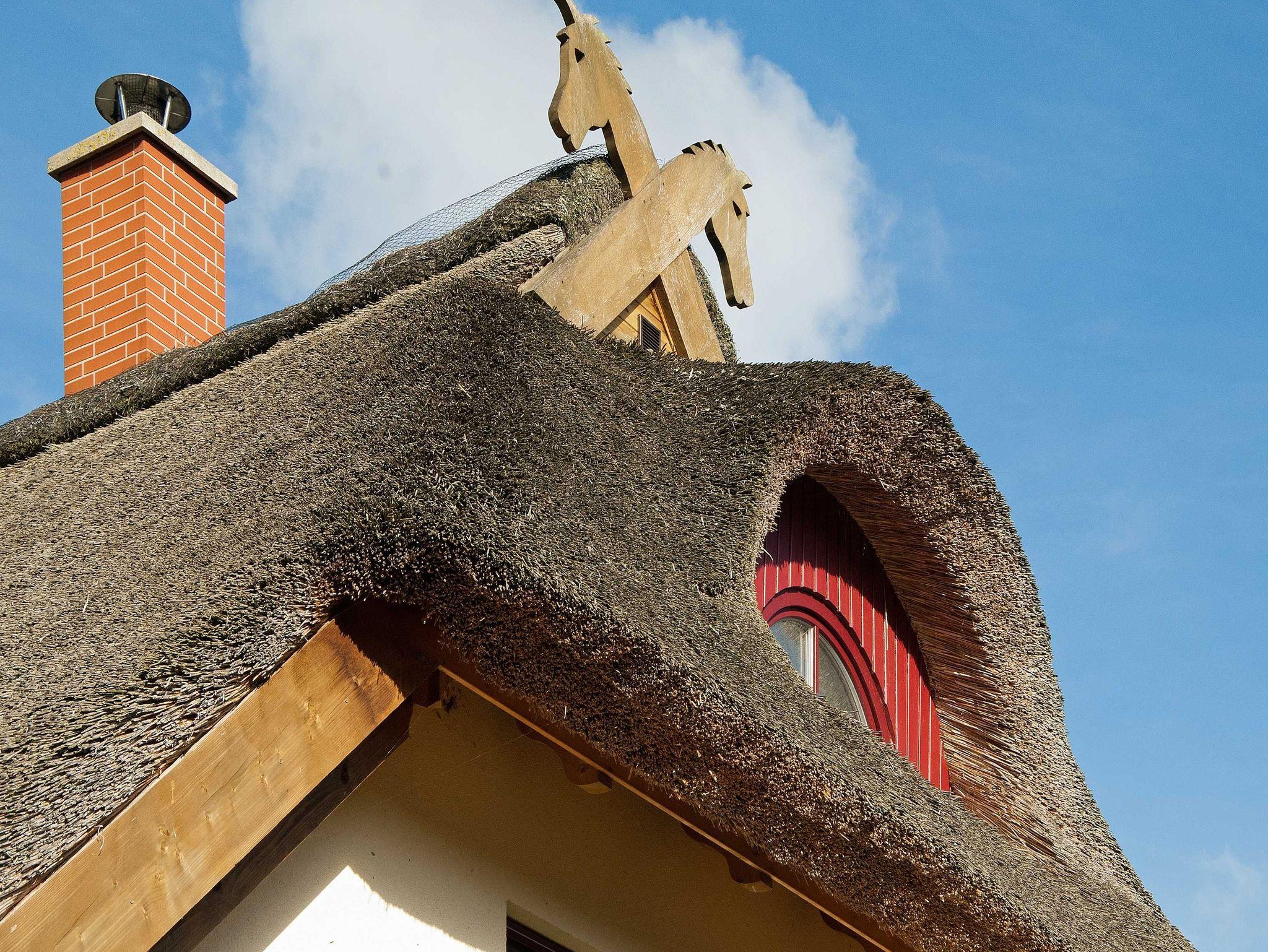 Im Wohnbereich werden Sie sich auch mal bei schlechtem Wetter sehr wohlfühlen. Die Einrichtung mit massiven Eichenmöbeln ist auf den gemütlichen Stil des Hauses mit dem Reetdach abgestimmt. Zum Entspannen finden Sie dort eine riesige Sofaecke aus feinstem Leder. Wenn dann das Kaminfeuer flackert, erlebt man bestimmt romantische Abende. Sollten Sie mit Kindern die Ferien geniessen, so werden Sie auch die Entertainmentaustattung mit Flachbildschirm und hunderten Programmen schätzen. Auch die Stereoanlage können Sie gern richtig aufdrehen, denn durch die massive Bauweise kann Sie garantiert kein Nachbar hören.