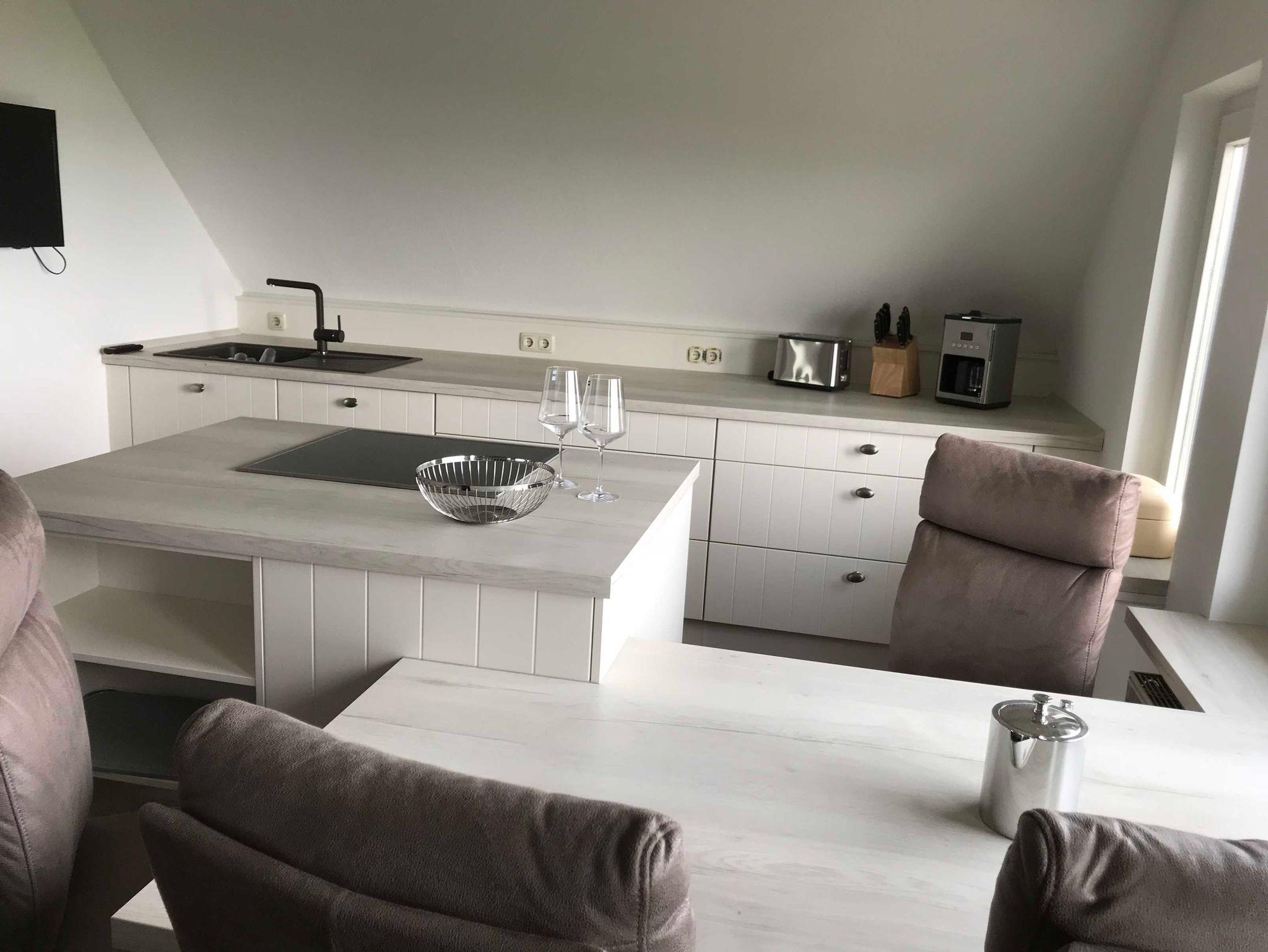 Wohnküche mit Kühlschrank und Gefriermöglichkeit, Spülmaschine, Herd mit Backofen, Kaffeemaschine