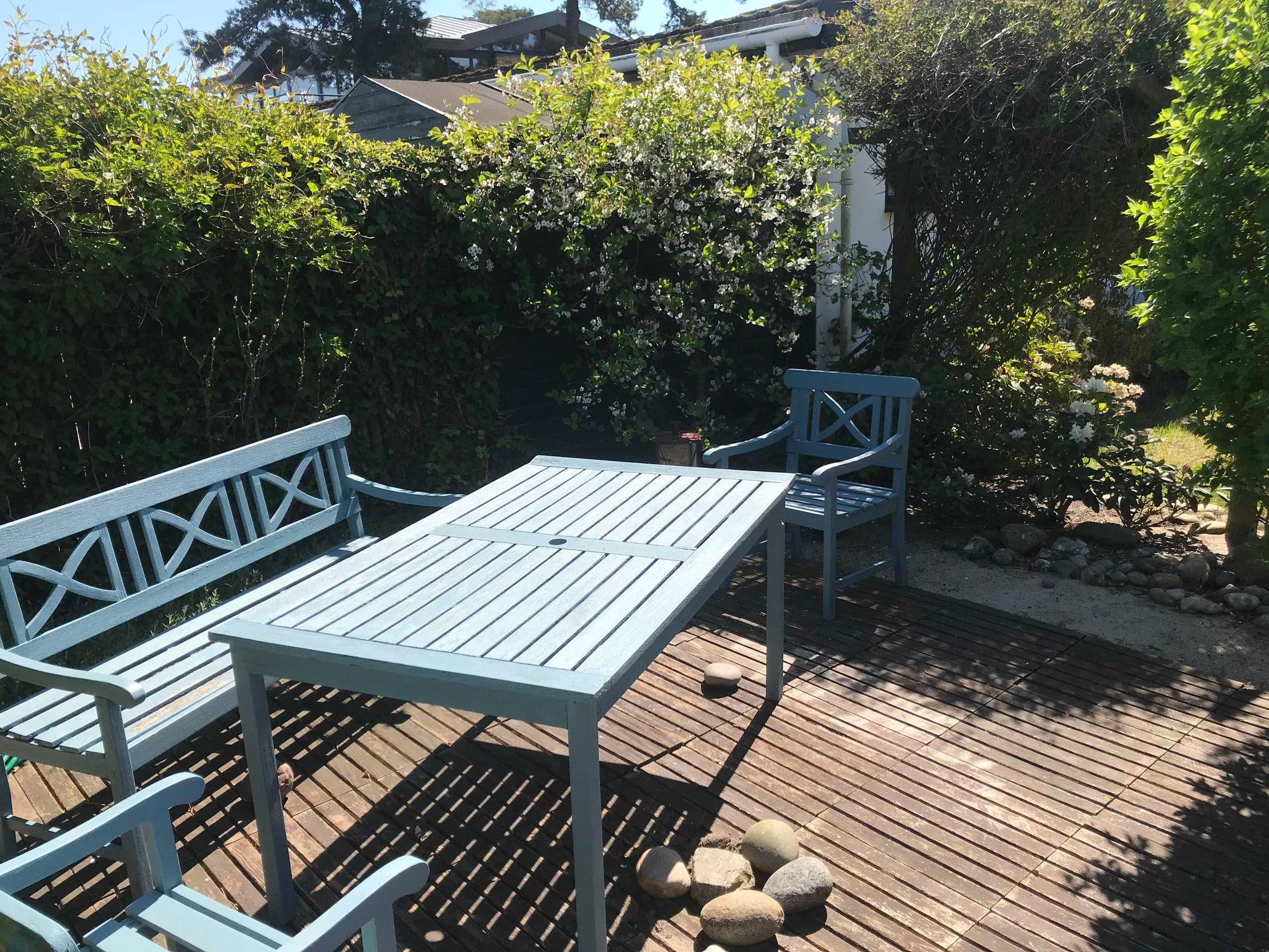 Eine gemütliche Sitzecke im idyllischen Garten bietet Gelegenheit die Mahlzeiten dort einzunehmen oder einfach nur das Wetter und die Nähe zum Meer zu genießen.