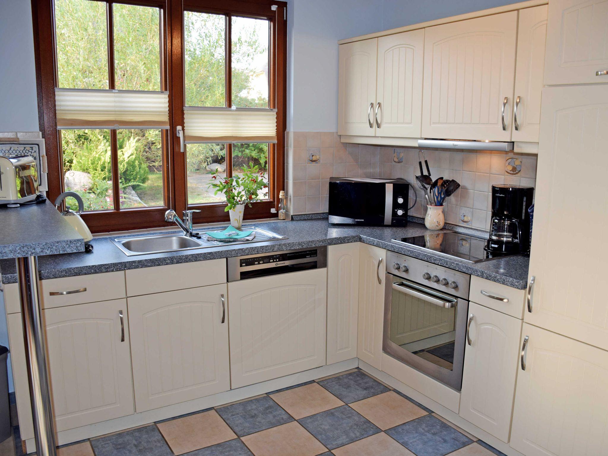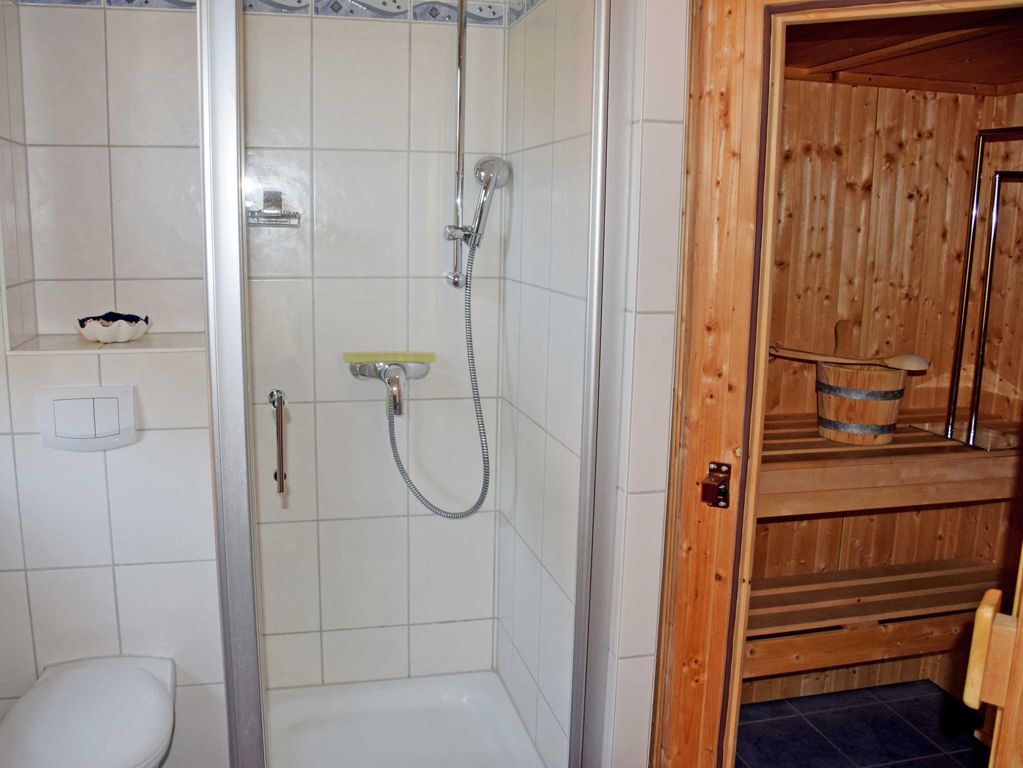 Zur Küchenecke gehören eine modern ausgestattete Küche mit Geschirrspüler, Kühlschrank mit Gefrierfach, Elektroherd mit Cerankochfeld , sowie weitere elektrische Geräte. Ebenfalls in der unteren Etage finden sie ein Bad mit Dusche, Waschbecken, WC und Sauna.