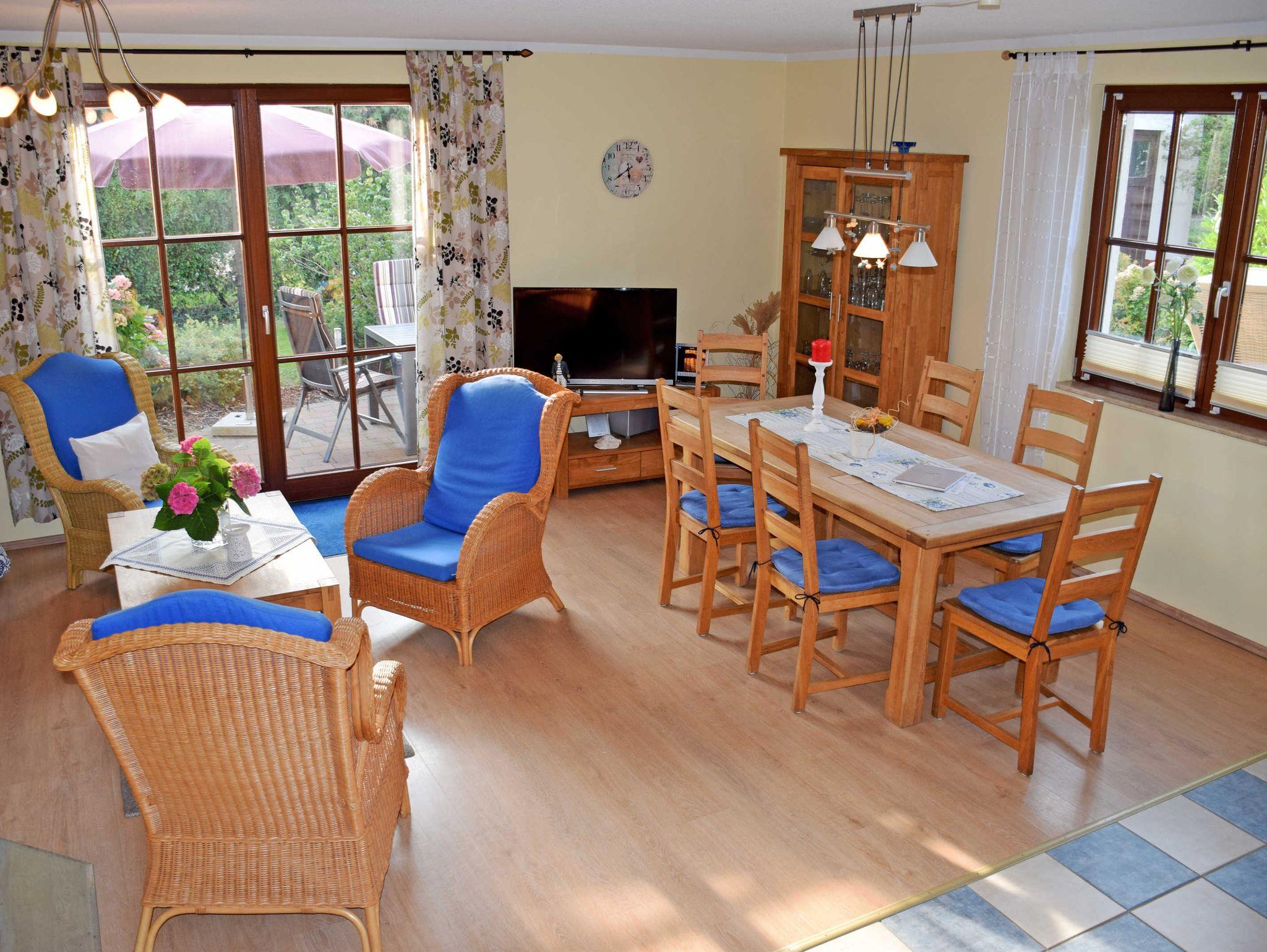 In der unteren Etage unseres Hauses befindet sich der Wohn- und Essbereich, ausgestattet mit Couch, Korbsesseln, Sat-TV, DVD-Player und einem Kaminofen. Eine Essecke für 6 Personen und ein Kinderstuhl komplettieren den Wohnbereich.