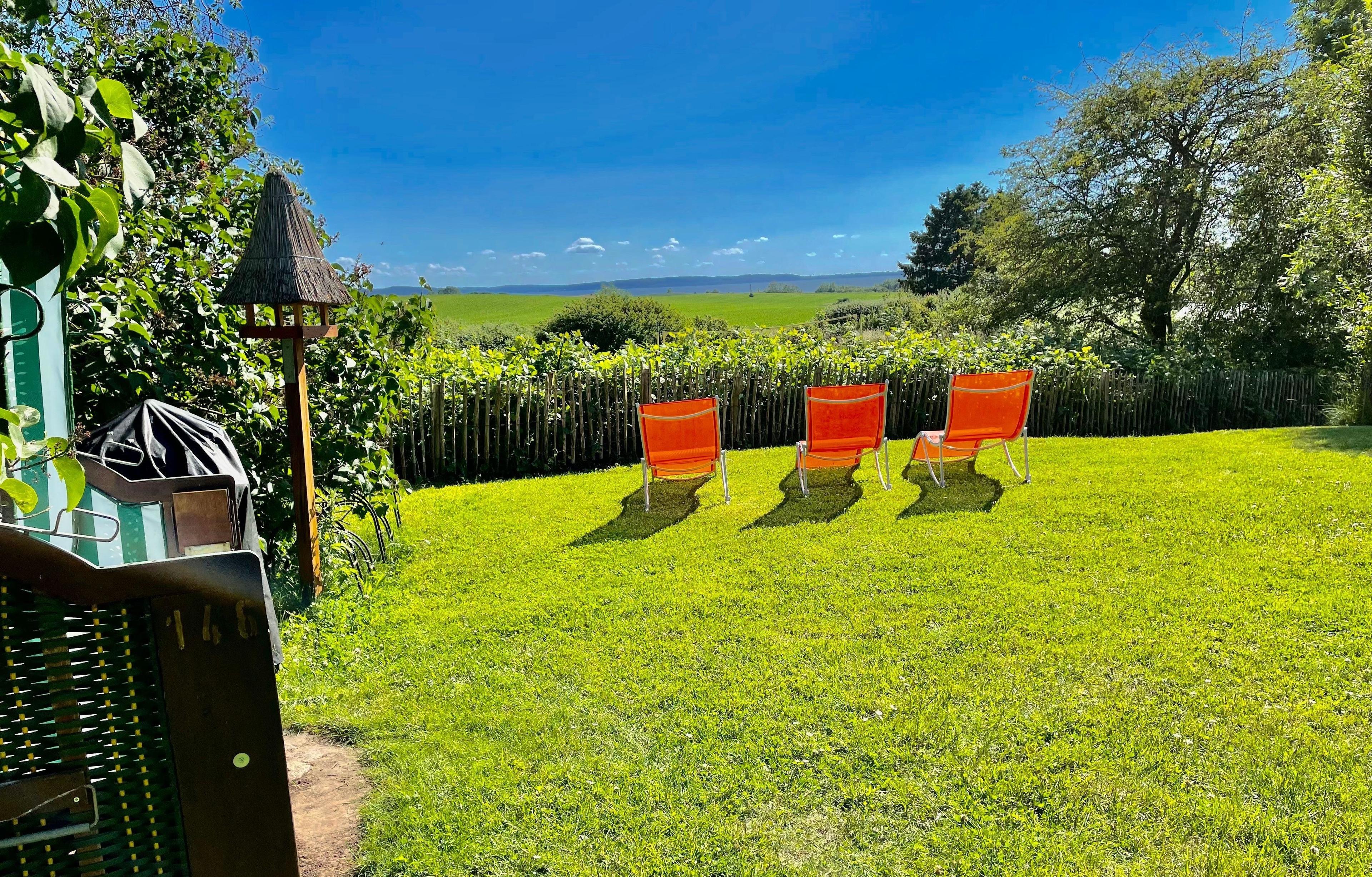 Eingezäuntes Grundstück mit Blick auf den Großen Jasmunder Bodden. 2 separate Schlafzimmer, ideal für Familien mit Kindern. Super große Sonnenterrasse.