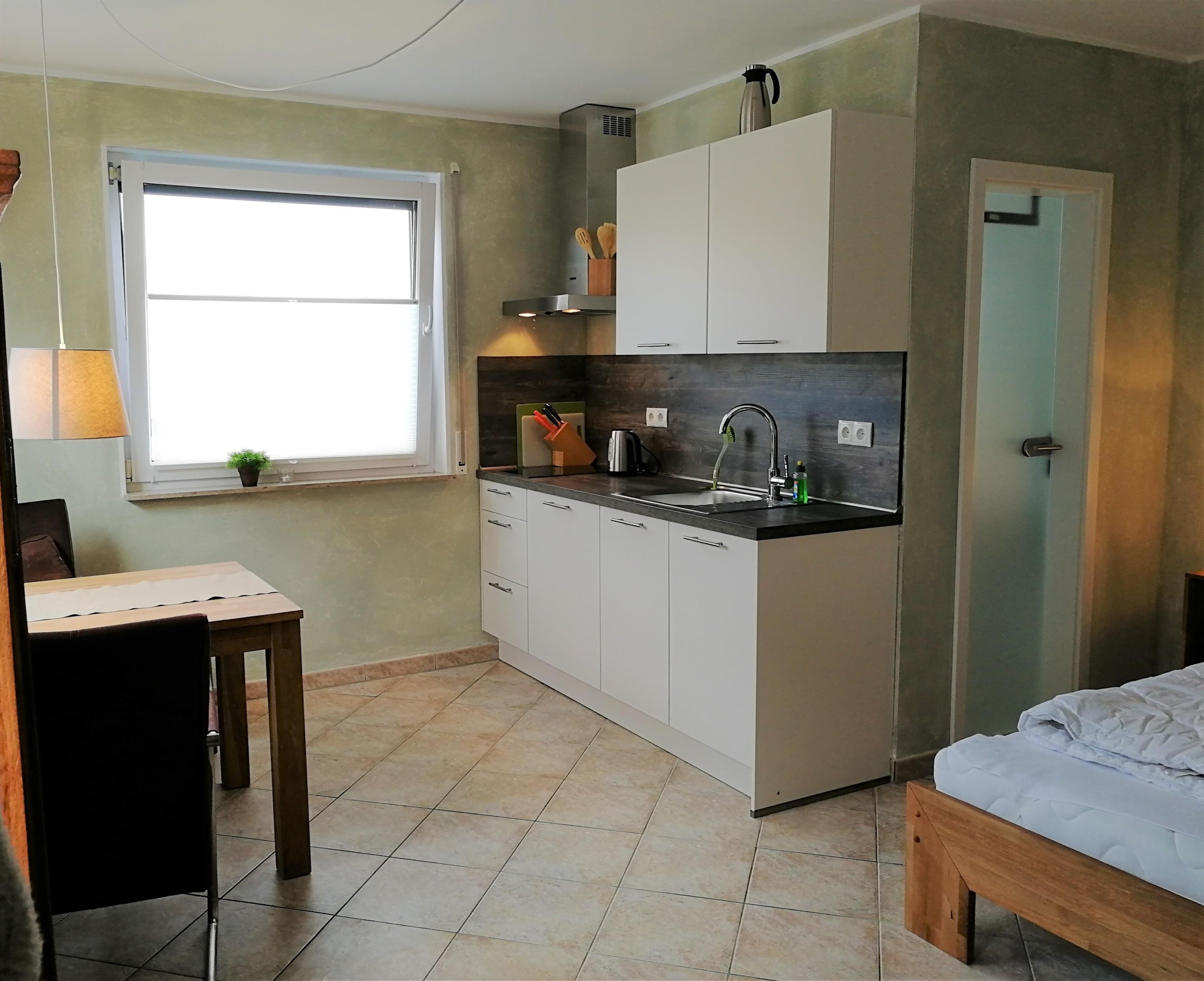 Der Wohnraum verfügt über eine Einbauküche, ein Doppelbett, einen Essplatz mit 2 bequemen Stühlen, einen Kleiderschrank und ein modernes Sat- TV. Im Haus können sie unser kostenfreies Wlan nutzen.