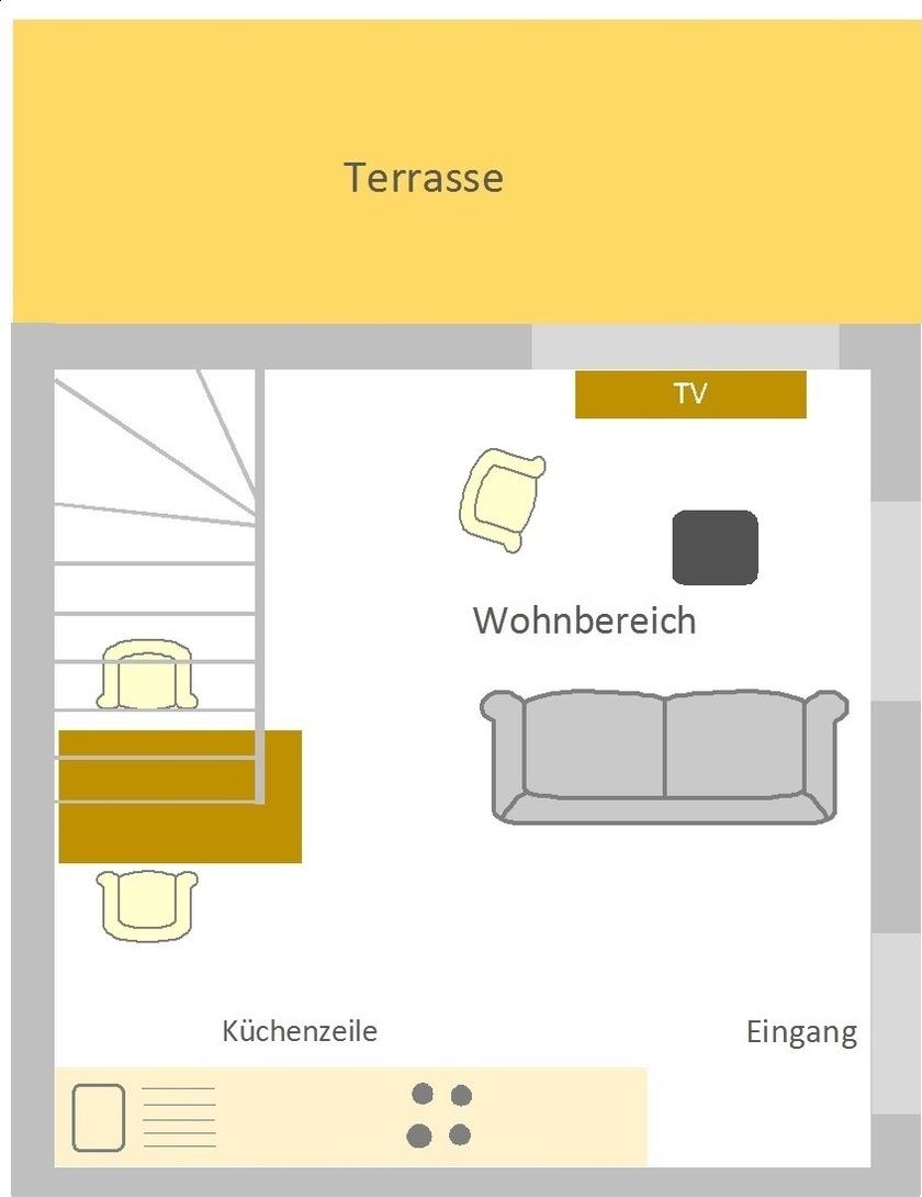 Es bietet im Erdgeschoss einen Wohnraum mit Einbauküche inkl. Geschirrspülmaschine und Backofen, einer Couchecke mit Sat-TV und einem Essbereich mit Tisch und Stühlen. Im Obergeschoss befindet sich ein Galerieschlafzimmer mit einem Doppelbett und einem Einzelbett sowie ein Duschbad.
