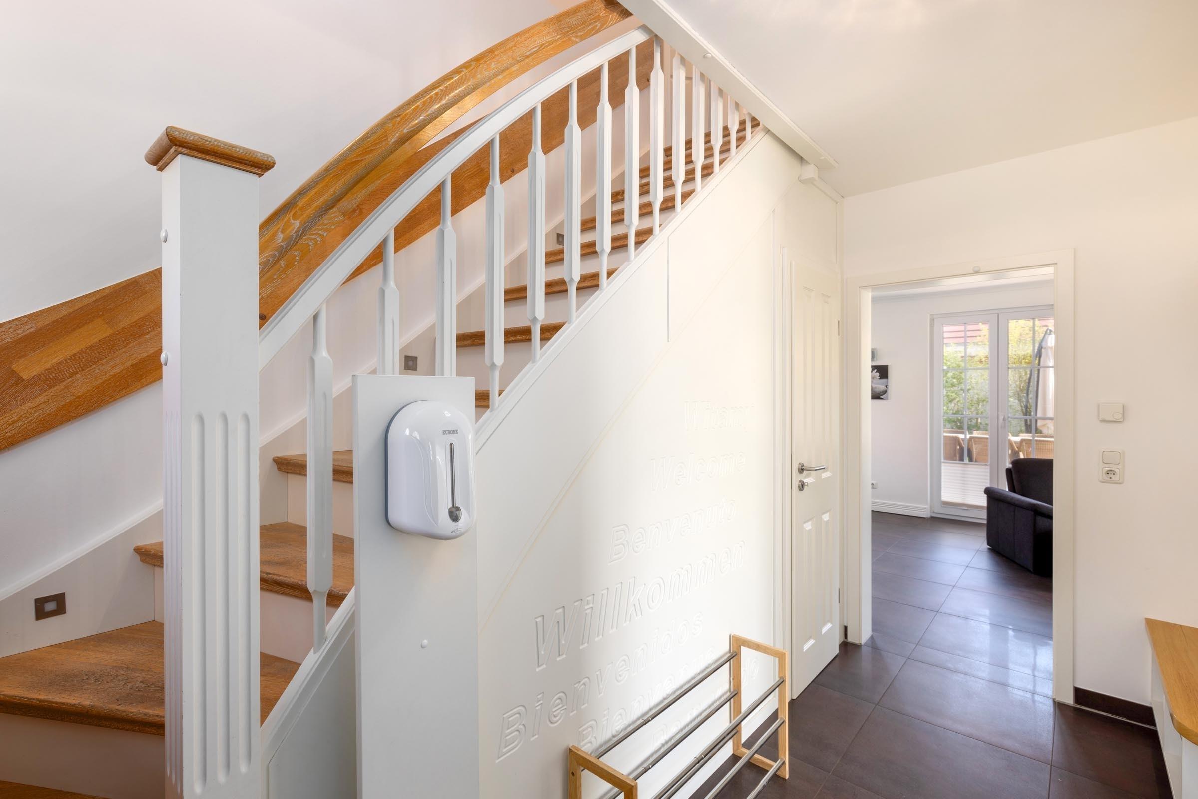 Das Haus zeichnet sich durch seine exklusiven Details aus, darunter eine gekalkte Eichenholztreppe mit integriertem dämmerungsgeschaltetem Nachtlicht, elektrische Rolläden und Fliegengitter vor den Fenstern. Der großzügige Wohn-Essbereich mit Kaminofen und integrierter Küche öffnet sich zur angrenzenden Süd-West-Terrasse, wo Sie in eleganten Gartenmöbeln entspannen können.
