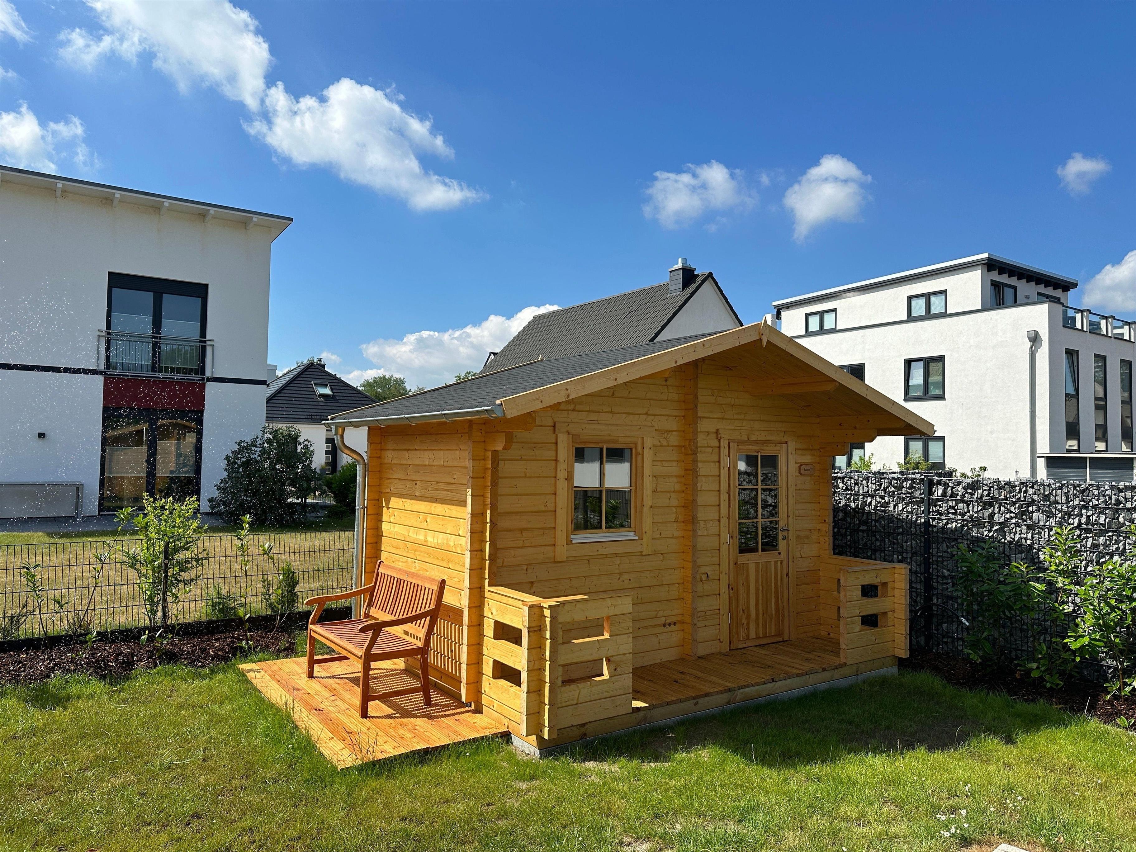 Im Gartenhaus ist eine Sauna mit einem Vorraum und Sitzgelegenheiten. Außen ist eine Zweisitzer-Bank, von der aus auch die Morgensonne genossen werden kann.