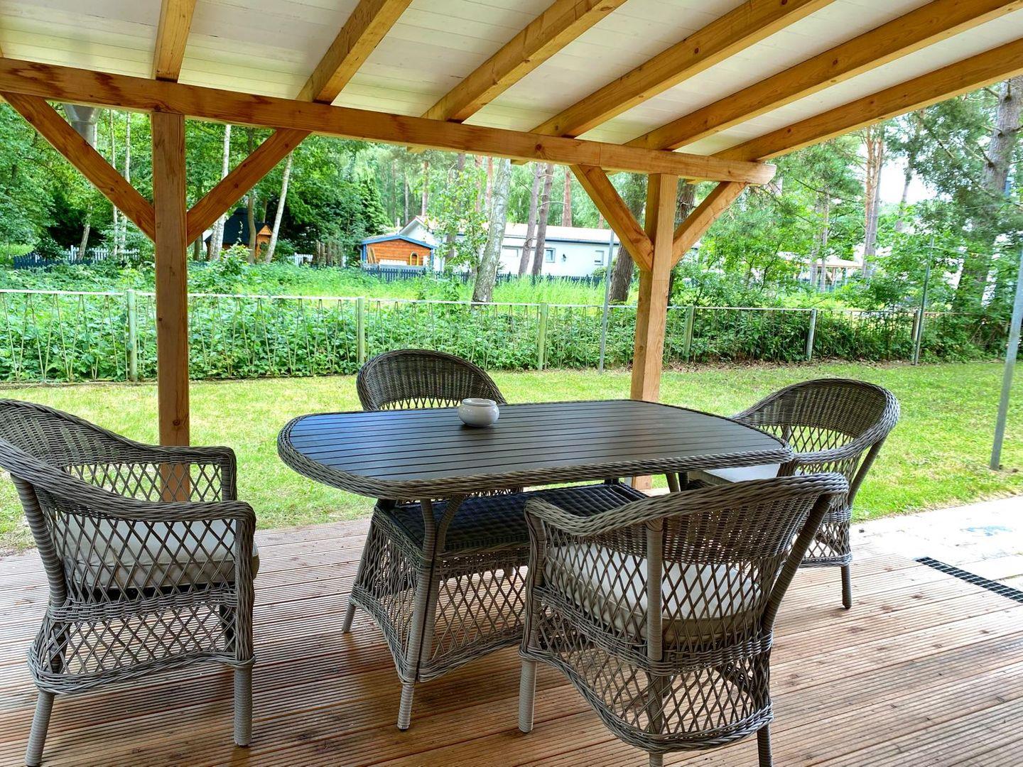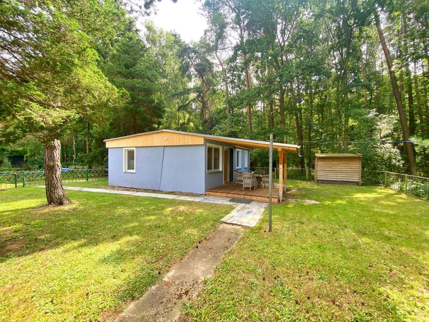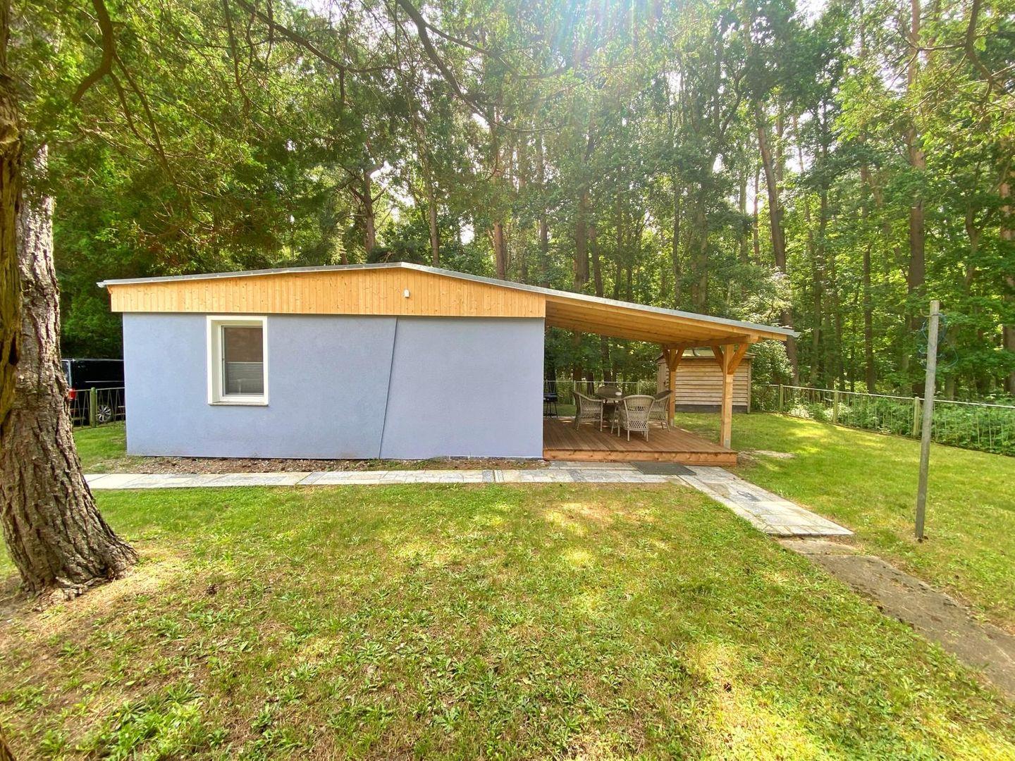 Der Bungalow hat eine Grundfläche von ca. 50 m² und befindet sich ruhig gelegen direkt am Waldrand in einer Ferienhaussiedlung. Er befindet sich auf einem Grundstück mit 2 weiteren Bungalows und verfügt über Schlafmöglichkeiten für bis zu 4 Personen. Das kleine Ferienhaus gliedert sich in ein gemütliches Wohnzimmer, zwei behagliche Schlafzimmer, ein Badezimmer mit Dusche und WC sowie einen Flur mit Miniküche. Eine große überdachte Terrasse ist mit Gartenmöbeln ausgestattet.