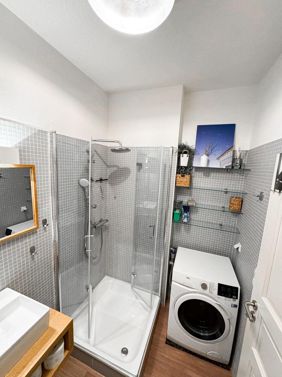 Zur Wohnung gehört ein modernes Badezimmer mit einer Dusche. Außerdem stehen praktische Annehmlichkeiten wie eine Waschmaschine und ein Haartrockner zur Verfügung.