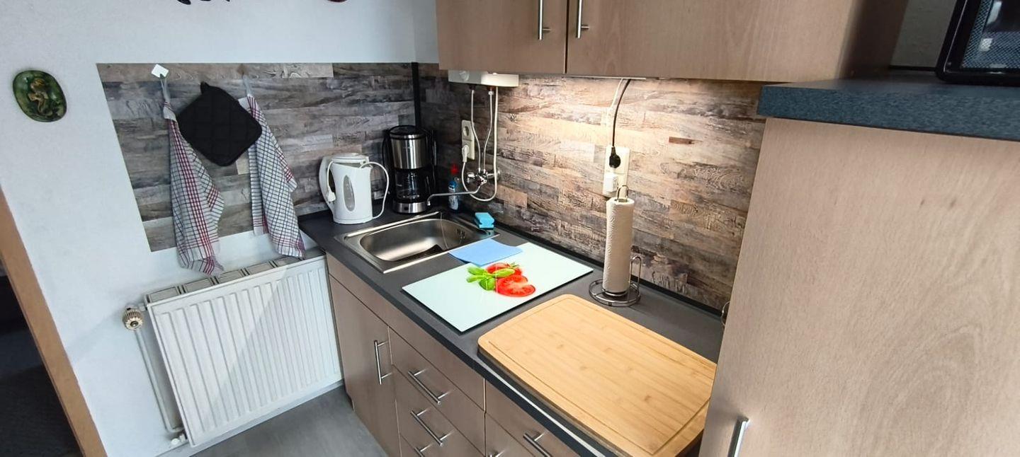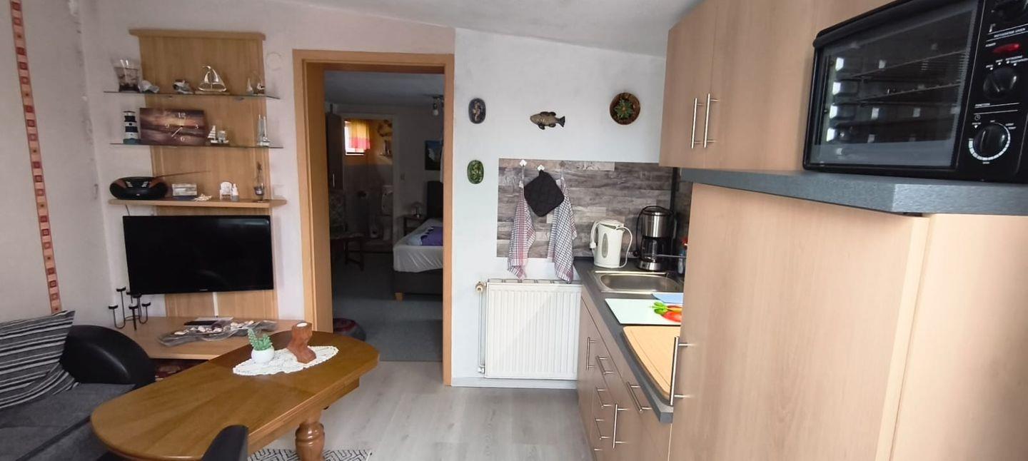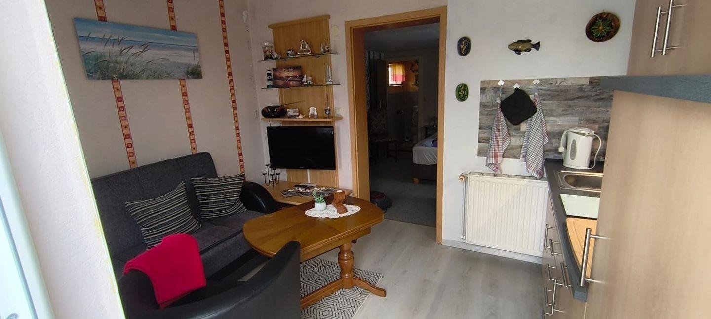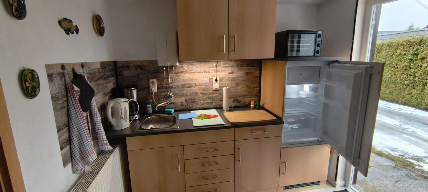 Sie betreten das kleinen 30 m² Ferienhaus gleich im Wohn-und Essbereich. Dieser ist mit einer Couch, einem Sessel, einem kleinen Tisch, einem Regal mit Büchern, Spielen und Informationsmaterial, einem Radio und dem Fernseher eingerichtet. Die offene Küchenzeile besteht aus einem Küchenmodul mit zwei Kochplatten, einer Kaffeemaschine, einem Wasserkocher, einem Toaster, einem Minibackofen mit Grill und einem Kühlschrank mit Tiefkühlfach. Das Schlafzimmer ist mit einem Doppelbett bestehend aus zwei zusammenstehenden Polsterbetten und zwei Kleiderschränken möbliert. Durch das Schlafzimmer gelangen Sie in das Bad mit Dusche und WC. Am Ferienhaus gibt es eine Terrasse mit Gartenmöbel und einem Holzkohlegrill. Hier können Sie beim Frühstück in den Tag starten oder den die Abende beim Wein ausklingen lassen. Für Ihre mitgebrachten Fahrräder gibt es einen Platz zum unterstellen. Ein PKW-Parkplatz ist auf dem Grundstück vorhanden.