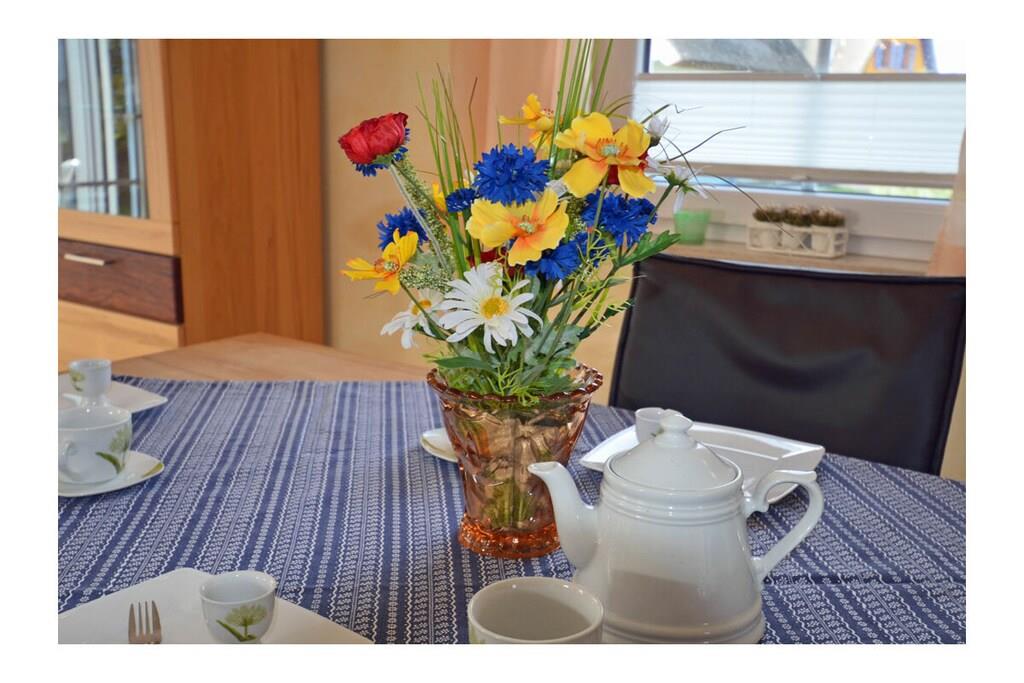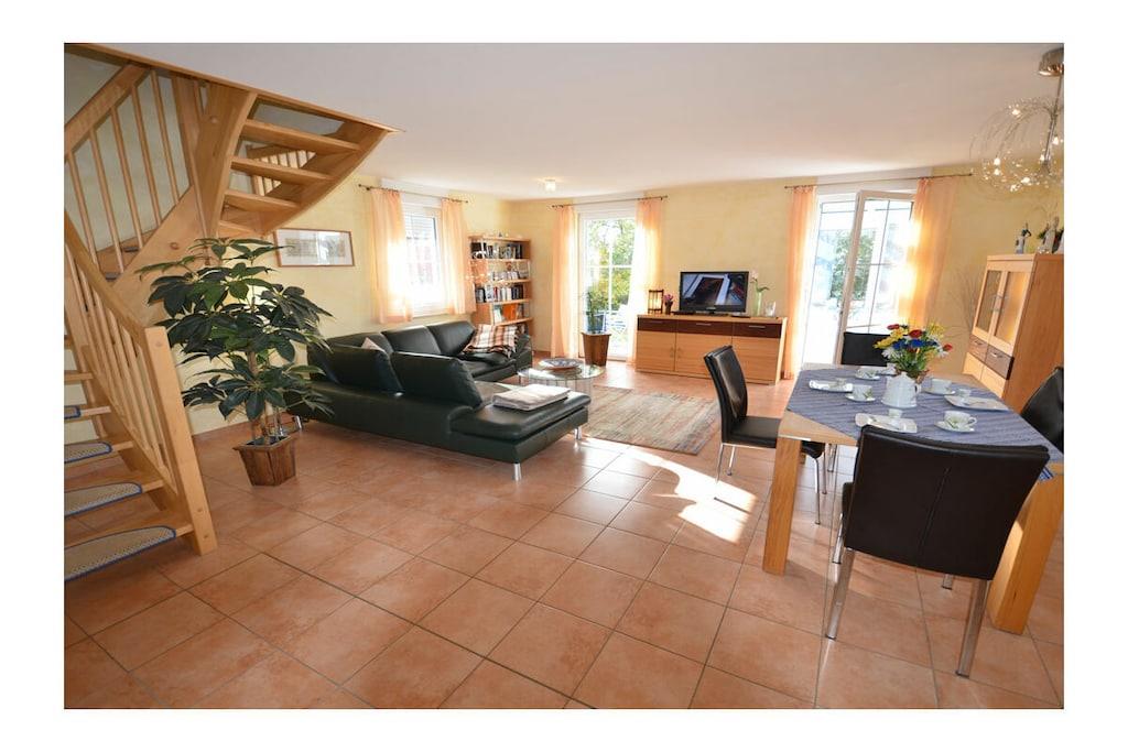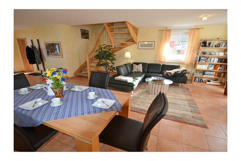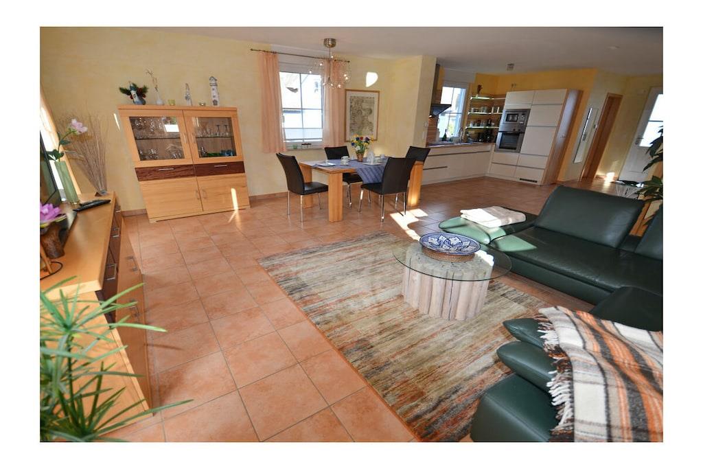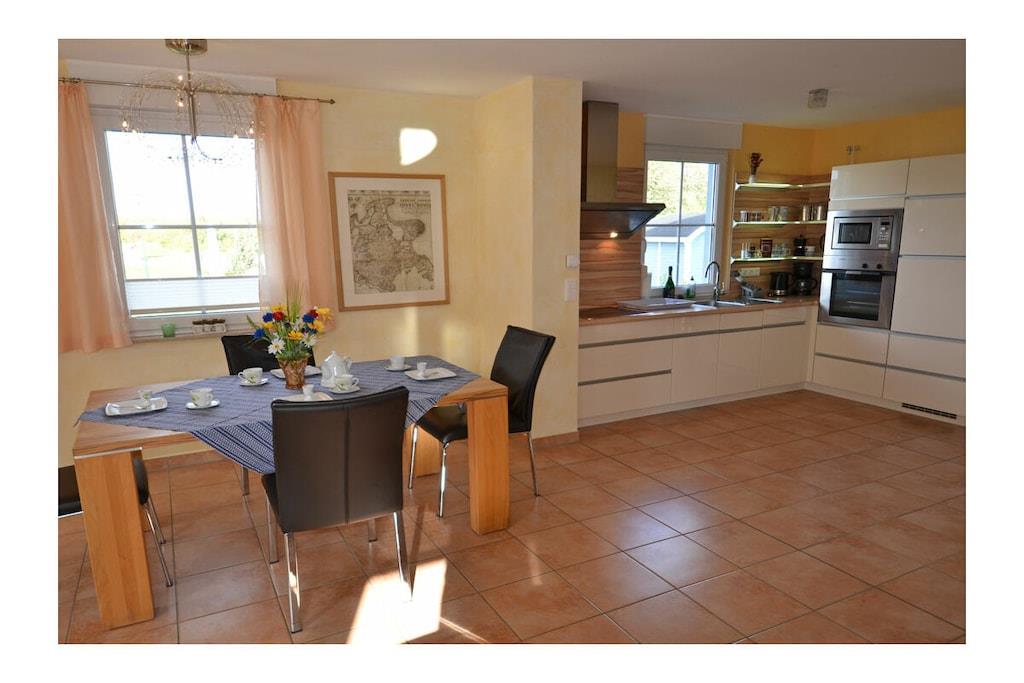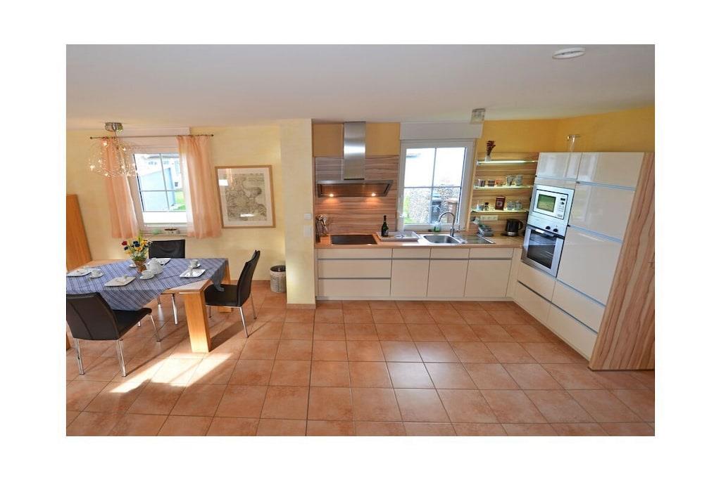 Erdgeschoss: großzügiger Wohn- Essbereich mit Fußbodenheizung, gemütlicher Couchlandschaft, TV/ Sat (Flatscreen), DVD- Player, Radio/ CD, Internet (WLAN), offene komplett ausgestattete Einbauküche mit 4- Plattenherd (Ceranfeld), Backofen, Kühlschrank mit großem Gefrierfach, Mikrowelle, Geschirrspüler und diversen Elektrogeräten, Bad im EG mit Dusche und WC, Hauswirtschaftsraum, Bügeleisen, Bügelbrett, Wäscheständer und Kinderhochstuhl Obergeschoss: 1. Schlafzimmer mit Doppelbett (2 Matratzen je 80 x 200) und Kleiderschrank, 2. Schlafzimmer mit Doppelbett (2 Matratzen je 80×200), Insektenschutz an den Fenstern, modernes Bad mit Dusche/ WC, Fön und Kosmetikspiegel Außenbereich: komplett umzäuntes Grundstück, Terrasse mit Gartenmöbel, 2 Sonnenliegen, Sonnenschirm, Grillmöglichkeit besteht (Grill vorhanden), gemütlicher, sonniger Wintergarten (nicht beheizbar), 1 PKW Stellplatz direkt am Objekt Zeit für Erholung - Freuen Sie sich auf schöne Urlaubstage im Ferienhaus "Blauer Stern" Das gemütliche Ferienhaus "Blauer Stern" ist liebevoll eingerichtet und bietet beste Voraussetzung für einen erholsamen Urlaub auf der Sonneninsel Rügen. Das umzäunte Grundstück mit Liegewiese und den sonnigen Wintergarten mit gemütlichen 4 Korbsessel und Tisch, lädt zum Entspannen ein. Internet (WLAN) steht Ihnen kostenfrei zur Verfügung. Für die Kleinen steht ein Kinderhochstuhl zur Verfügung. Bücher für Erwachsene und Kinder sowie verschiedene Gesellschaftsspiele stehen ebenfalls für Sie zur Verfügung. In unmittelbarer Nähe gibt es einen großzügigen Kinderspielplatz der jede Menge Spaß und Abenteuer bietet. Fußbodenheizung ist im gesamten Haus. Im Obergeschoss befinden sich die beiden Schlafzimmer und das Bad. Ein weiteres Duschbad ist im Erdgeschoss vorhanden. Das Ferienhaus "Blauer Stern" ist ein Nichtraucherquartier. Der PKW-Stellplatz befindet sich direkt am Objekt. Abstellmöglichkeiten (abschließbar) für Fahrräder sind vorhanden. Einkaufsmöglichkeiten, Bäcker, Restaurants und ein Getränkemarkt finden Sie in naher Umgebung. Optimale Rad- und Wandermöglichkeiten um die schöne Insel zu erkunden, runden das Angebot ab. Bei uns sind Hunde willkommen! (Gebühr Euro 5,-/ pro Hund/ pro Nacht).