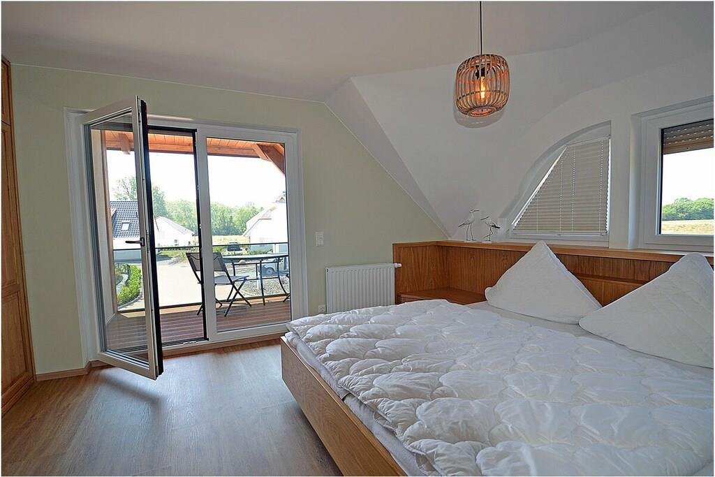 Erdgeschoss: modern und elegant eingerichteter Wohnbereich mit Kamin, gemütliche Couchlandschaft und Sessel, TV Sat/Kabel (Flatscreen), Radio, komplett ausgestattete hochwertige Einbauküche mit Kochinsel, großer Esstisch für 6 Personen, 4-Plattenherd (Induktionsherd), Backofen, zwei Kühlschränke mit je einem kleinem Gefrierfach, Geschirrspüler, Mikrowelle und diversen Elektrogeräten wie z.B. Kapselkaffeemaschine, 1. Schlafzimmer mit einem Einzelbett (120 x 200) mit Kleiderschrank und Schreibtisch, großes Bad mit ebenerdiger Dusche, Badewanne, WC, Föhn und Sauna Obergeschoss: 2. und 3. Schlafzimmer, jedes Schlafzimmer verfügt über einen Balkon und ein eigenes separates Bad mit Dusche und WC, beide Schlafzimmer ausgestattet mit Doppelbett (zwei getrennte Matratzen je 90 x 200), großer Spiegelkleiderschrank/ begehbarer Kleiderschrank mit viel Staumöglichkeiten und TV (Flatscreen) und kleinen Schreibtisch Souterrain: Waschmaschine, Bügelbrett und Bügeleisen, Wäscheständer Außenbereich: gepflegtes Grundstück, Terrasse mit Gartenmöbeln (6 Gartenstühle) mit bequemen Sitzauflagen, 2 Liegestühle und Grill vorhanden Zeit für Erholung-Genießen Sie traumhafte Urlaubstage Erstvermietung seit dem 01.07.2020 Das schöne neuerbaute Reetgedeckte Doppelhaus „Meeresrauschen“ ist modern und liebevoll eingerichtet. Das gepflegte Grundstück mit Liegewiese ist komplett umzäunt und lädt zum Entspannen ein. Internet (WLAN) steht Ihnen kostenfrei zur Verfügung. Für die Kleinen stehen 2 Kinderreisebetten und 1 Hochstuhl zur Verfügung. Fußbodenheizung ist im gesamten Haus. Die Fenster sind mit elektrischen Außenjalousien und teilweise mit Insektenschutz ausgestattet. Das Ferienhaus „Meeresrauschen“ ist ein Nichtraucherquartier. Am Objekt befinden sich 2 PKW-Stellplätze und Abstellmöglichkeiten für Fahrräder.