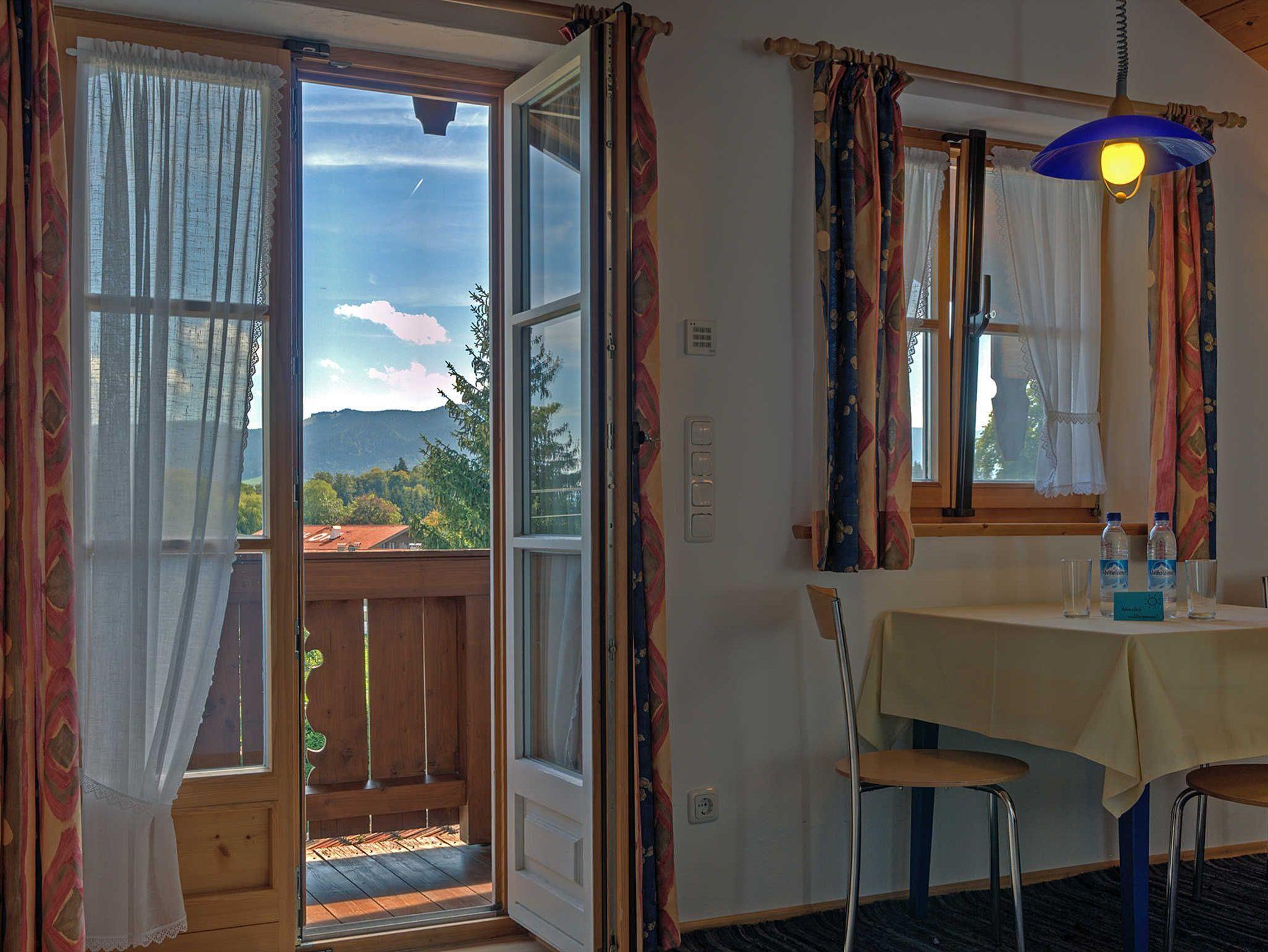 Vom Ostbalkon aus genießen Sie die Sonne und den freien Blick über Wiesen auf die Bergwelt des Tegernseer Tals und Richtung Wendelstein.