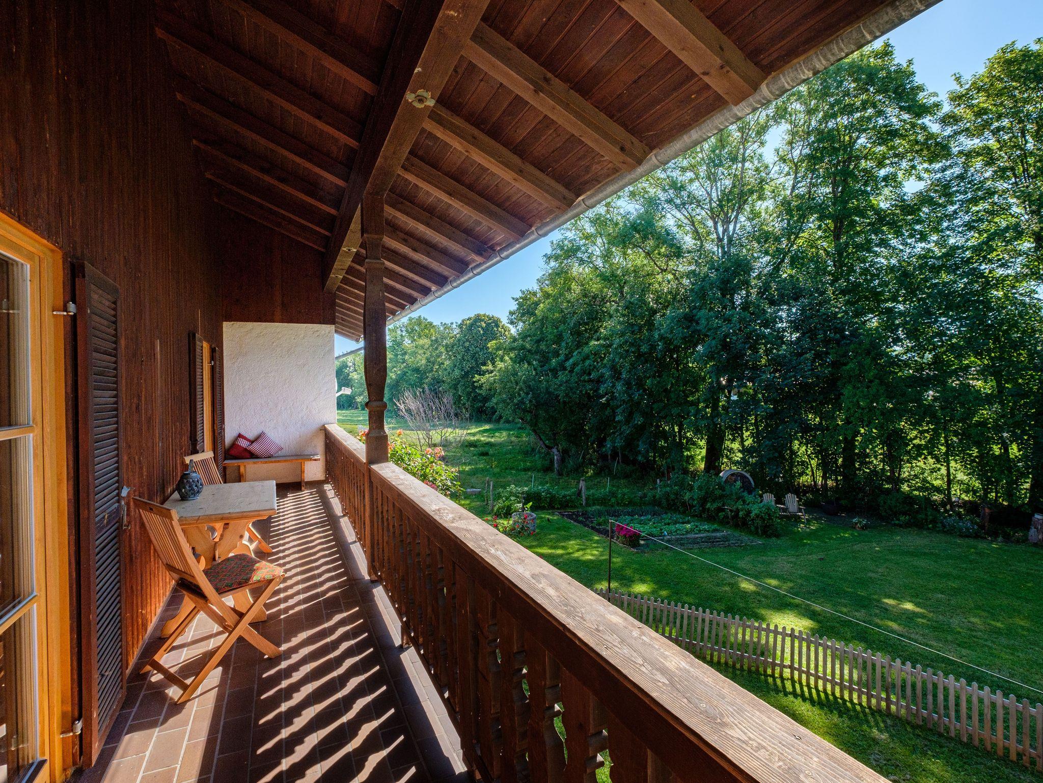Die konfortabel und gemütlich eingerichtete ****Wohnung hat 2 Balkone mit Sicht auf die umliegenden Wiesen und Berge. In dieser ruhig gelegenen Wohnung können Sie die Sonne vom frühen Morgen bis zum Nachmittag genießen. Der Südbalkon ist überdacht und so geschützt, dass Sie auch an Regentagen die frische Luft und die Ruhe genießen können. Die Wohnung verfügt über ein Schlafzimmer mit Doppelbett und ein festes Zusatzbett, ein Kinderbett kann außerdem zugestellt werden. Das Wohnzimmer ist sehr geräumig und im ländlichen Stil mit großer Essecke und Couch (evtl. Schlafcouch) möbiliert und verbreitet bayrische Gemütlichkeit. In der gut ausgestatteten Küche, erneuert 2023, lädt ein Bistrotisch zum Brotzeitmachen ein.